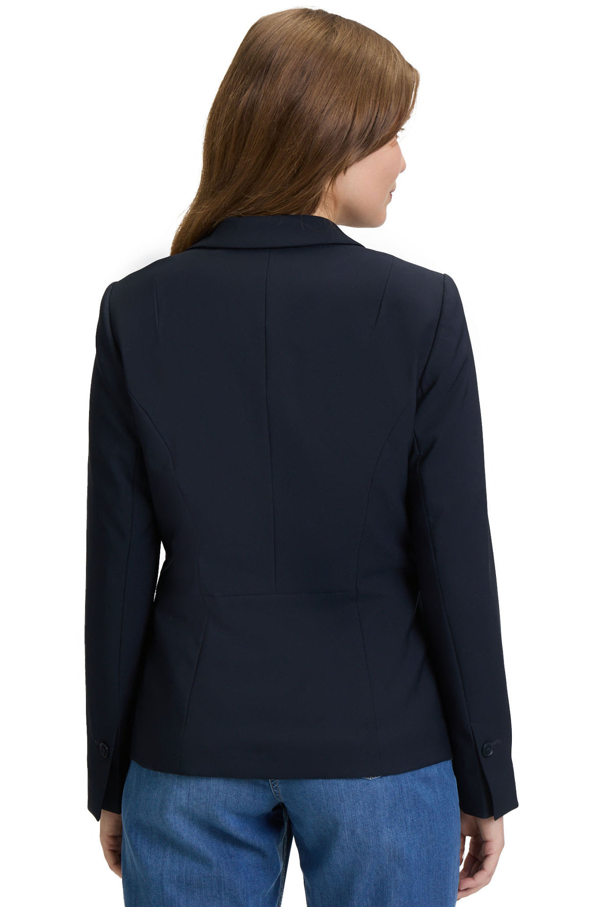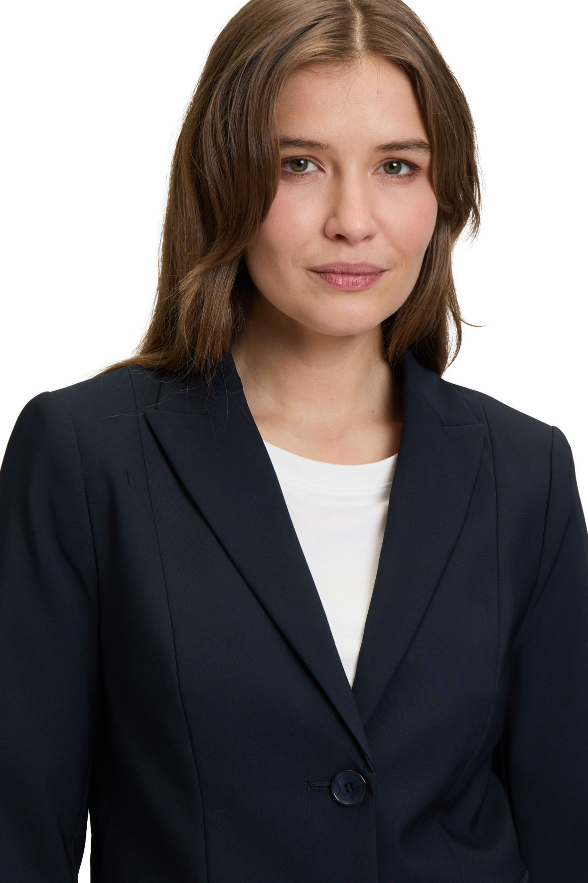 Hvis du vil tages alvorligt, skal garderoben spille med. Her er din nye, feminine blazerjakke fra Betty Barclay, der giver dig kant og kontur med sine lodrette snit for og bag. Den er designet til at vise din kvindelighed uden at sidde for tæt, og når den er lukket, giver den et smukt taljeret look. Jakken har let vatterede skuldre, en klassisk reverskrave og lukkes med en enkelt knap. Den kommer med to lommer med overslag, som du kan tage i brug, så snart du har sprættet dem op. Ærmerne slutter elegant ved håndleddet med en knap og slids, perfekt til at vise din yndlingsskjorte. Det korte snit får dine ben til at se længere ud – et lille optisk trick, vi er vilde med. Kvaliteten er i en klasse for sig: en holdbar blanding af 86% polyester og 14% elastan, der er krølfri, farvefast og endda afviser både fugt og uvelkomne lugte som tobaksrøg. Kort sagt, du er altid klar til at træffe beslutninger.