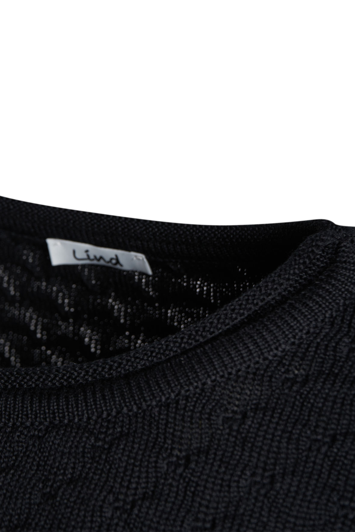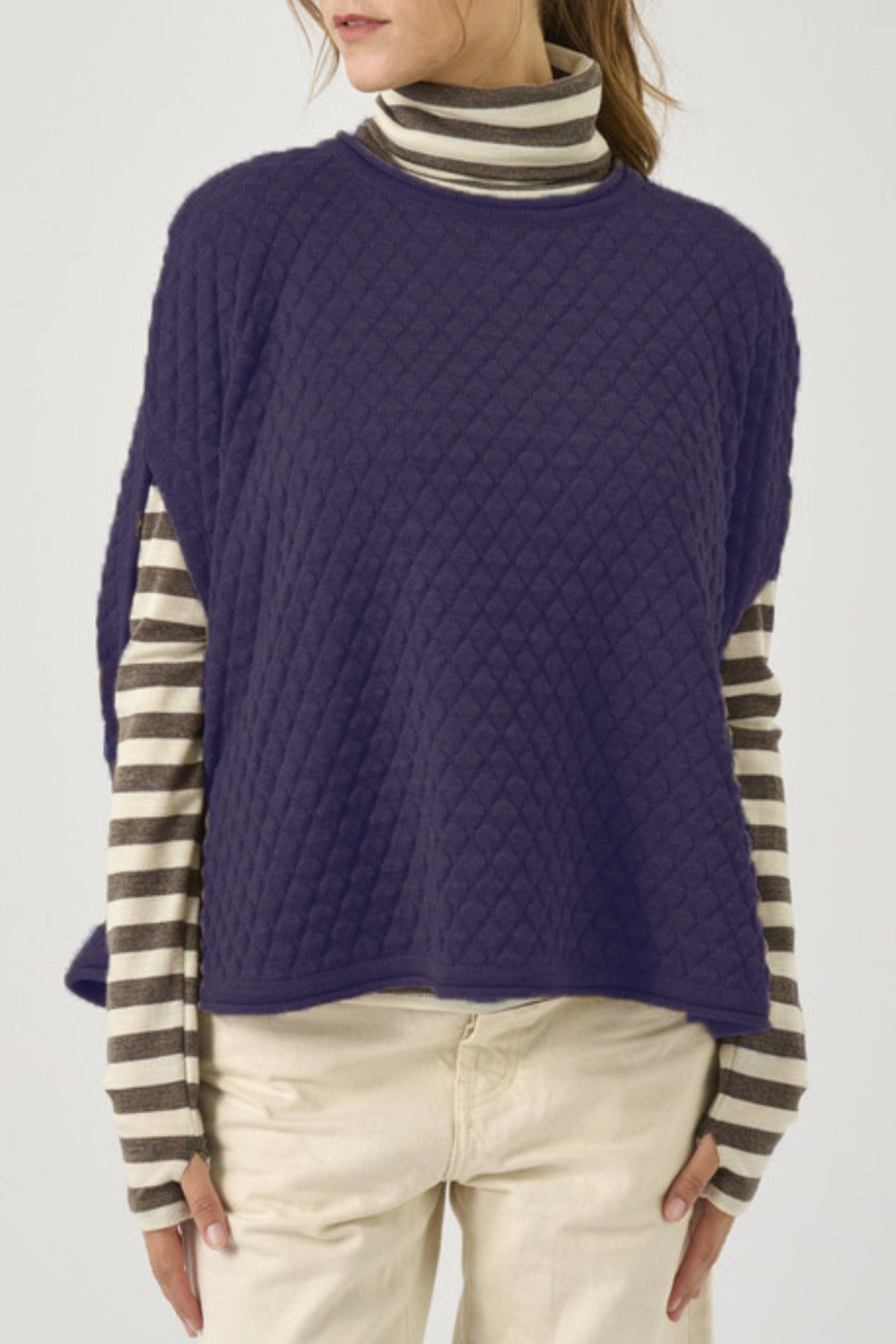 Poncho strikken LiMargit er lavet til lige at trække over hovedet med et smart snit der er lukket og går på overarmen har ærmegab og er så lukket på det sidste stykke ved hoften. Med et flot ruder mønster. Med lille rul/ombuk i halsåbningen samt ved hofter. Den er så fuld af elegance, og har masser af bevægelsesfrihed i lag på lag løsninger. Den er rigtig varm og blød på, i en blanding af uld og akryl. Det gør den også stabil så den holder farve, facon og naturligvis krølfri. Den giver et ubetinget sofistikeret look og falder løst. Vi har ikke fået taget billeder af den navy i andre vinkler end forfra, men jeg tillader mig at supplere med billeder af den i sort. Den ligger i to str. nemlig s/m og l/xl som passer rigtig godt, så du skal ikke vær ebange for at tage en s/m hvis du almindeligvis er en medium.