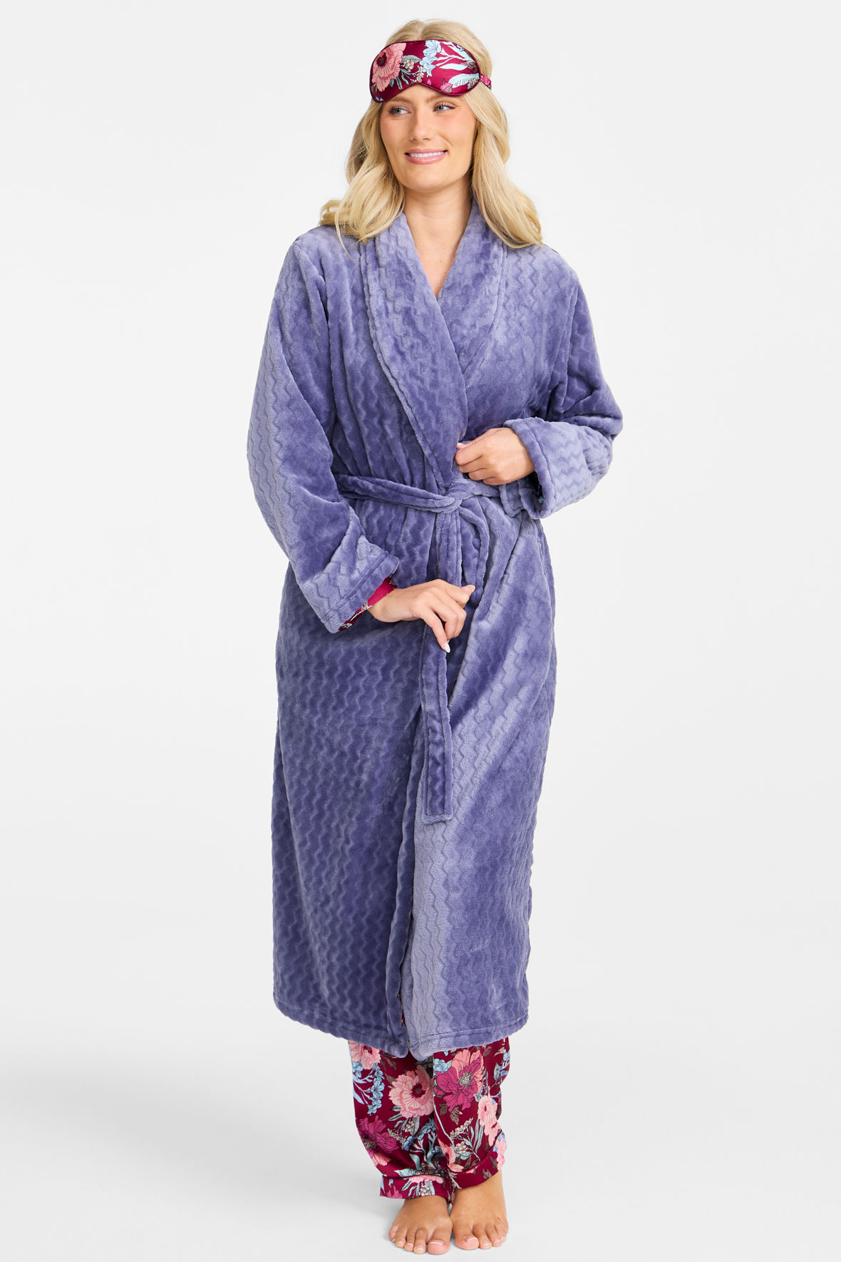 Skal din næste morgenkåbe være vamset og blød, så har Damella tænkt på det. Her er den som velour fleece kåbe med vaflet mønster. Den har revers og lukkes i livet med bånd der er løst i stropper. Med lange ærmer. Den har god længde der når til øvre læg. Lavet med lommer i sidesømmen. Fleece er mere til at holde dig varm end som en egentlig badekåbe. Så den er loungewear, brug den over nattøj, hyggetøj osv. eller i vinterhalvåret. Der var ikke taget billeder af den på model i farven, men fandt et billede af samme kåbe i anden farve. Den er størrelsessvarende.