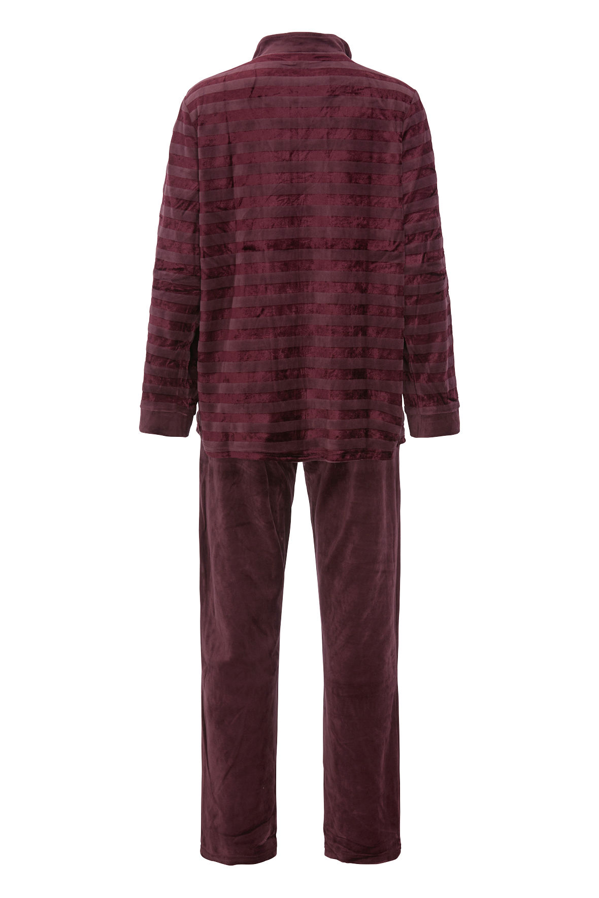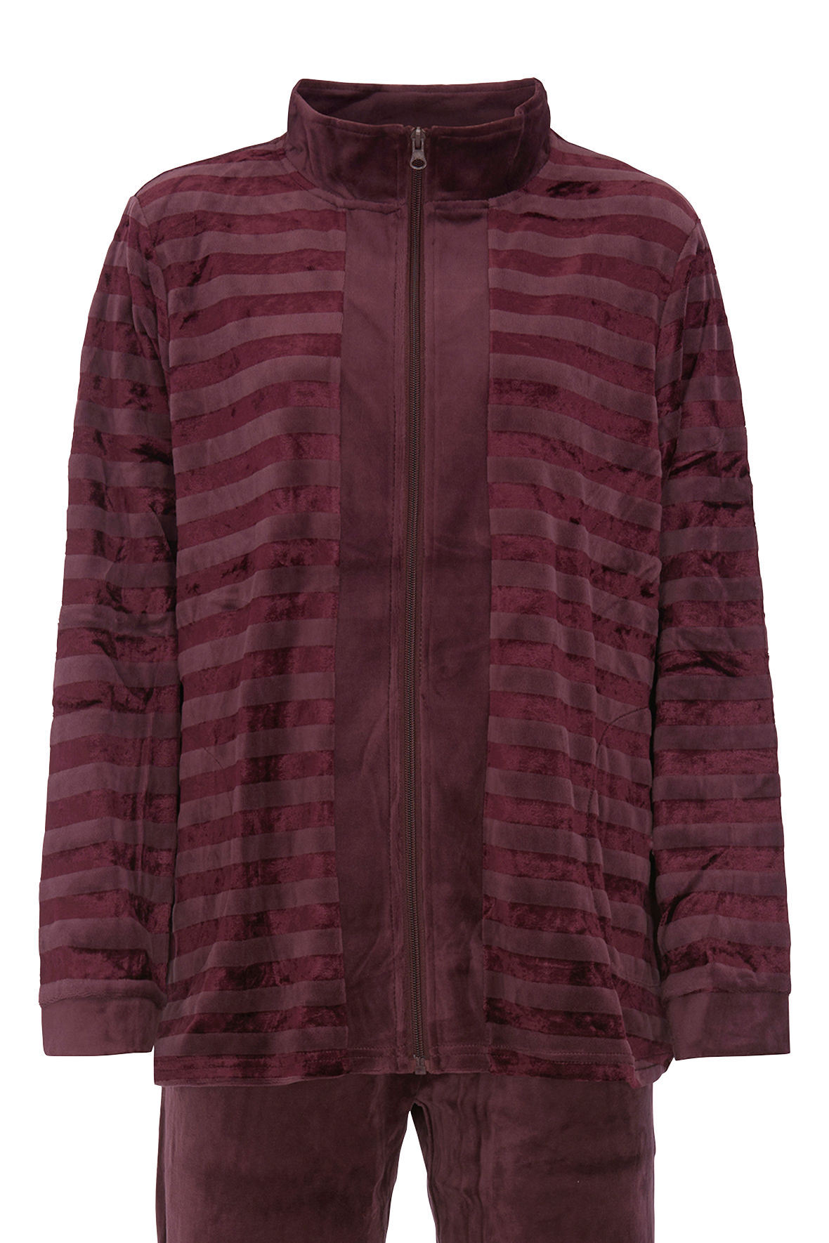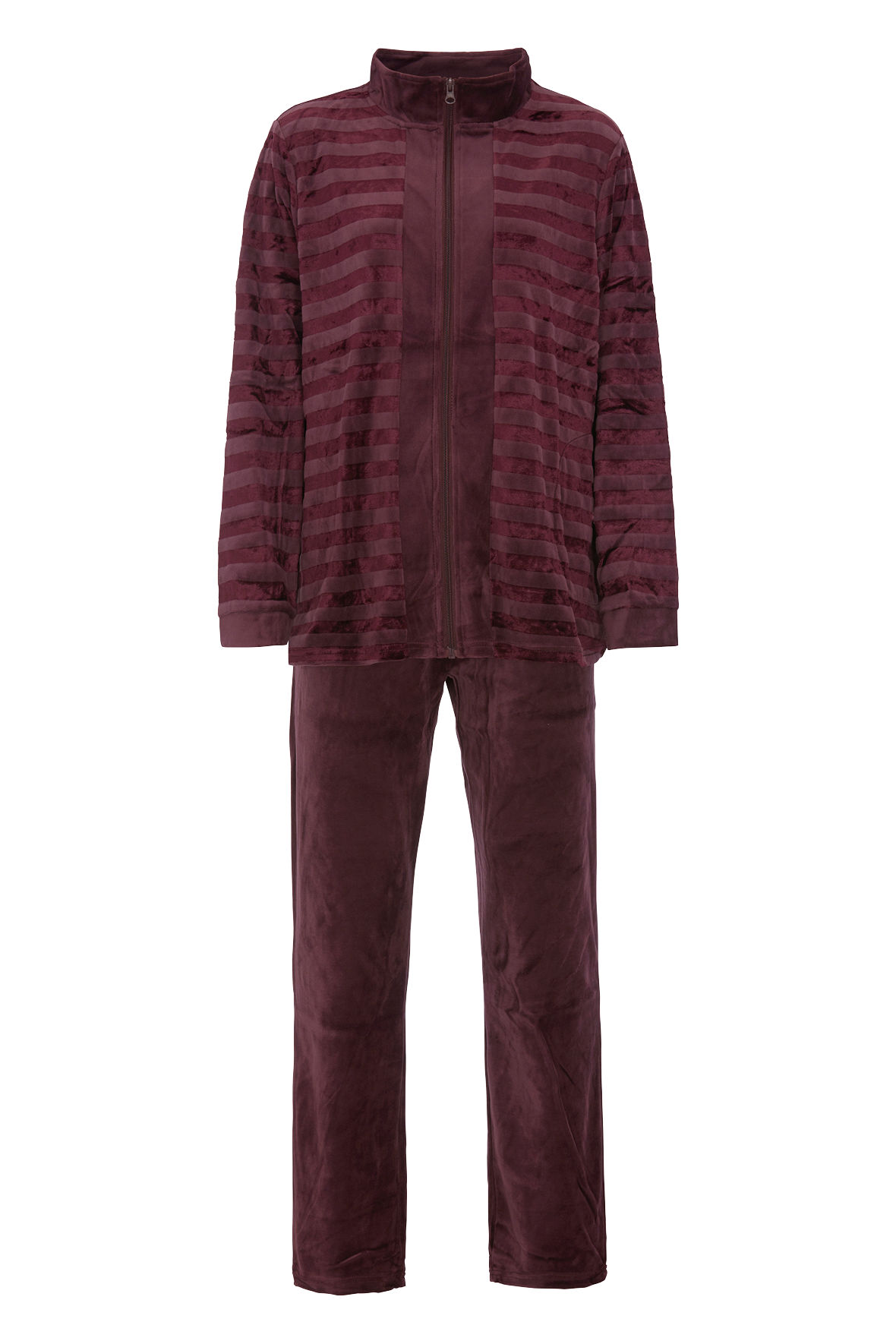 Velour hjemmesæt når det skal være komfortabelt og blødt. Helt klassisk Damella style med de flotte tone i tone striber. Sættet er todelt med bukser og trøje. Høj blandings kvalitet af viskose og bomuld, det sikrer komforten, åndbarheden og temperaturreguleringen. Får du det nemt varmt hjælper de naturlige fibre dig. Holdbarheden er også bare et kapitel for sig. Den er med høj hals der kan lynes helt til, eller selvfølgelig stå åben og lægges ned. Lange ærmer og så er der lommer i sidesømmen. Bukserne har flad bred elastik i linning og har lommer foran, god vidde i ben, og så er de uden striber. Størrelsessvarende.
