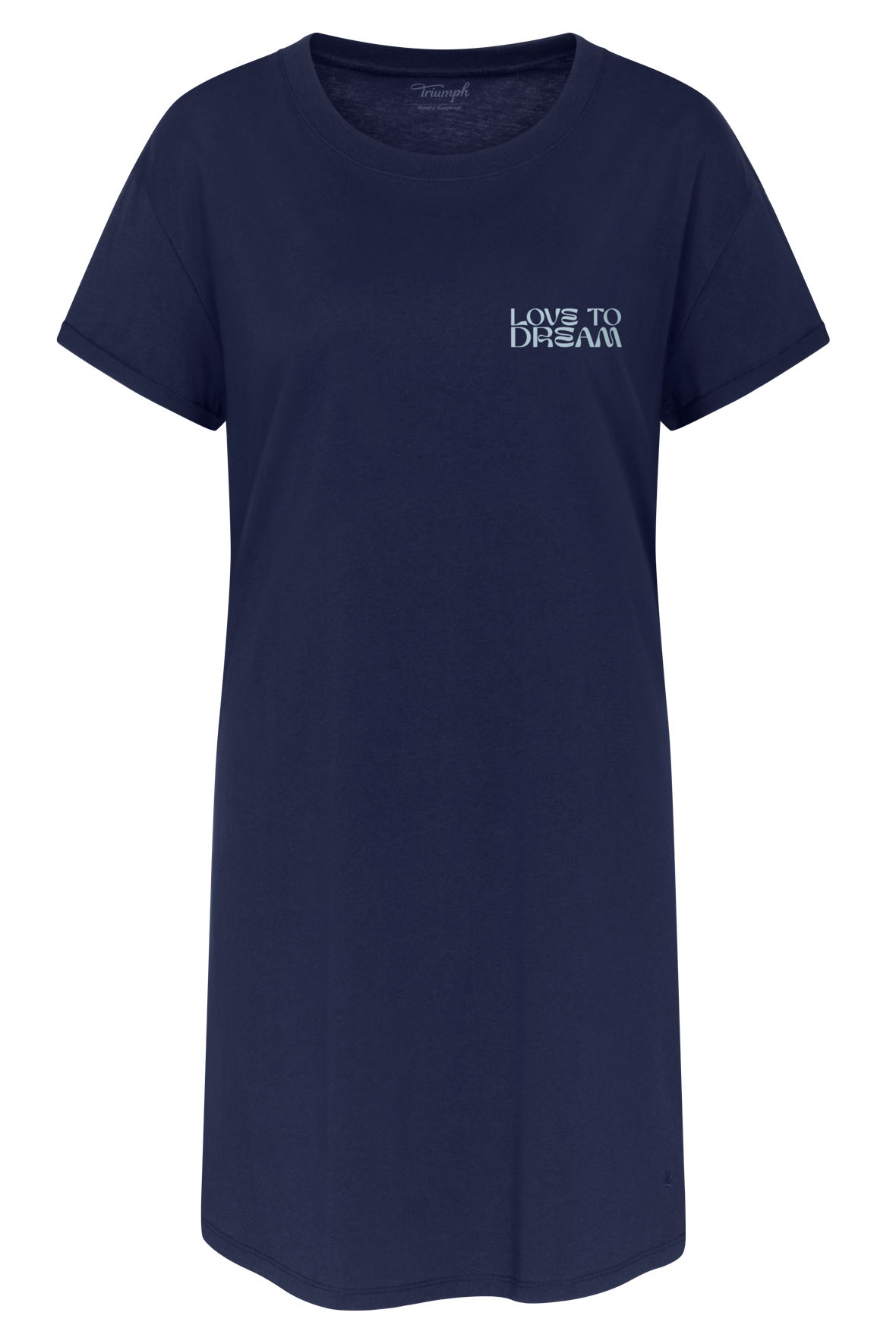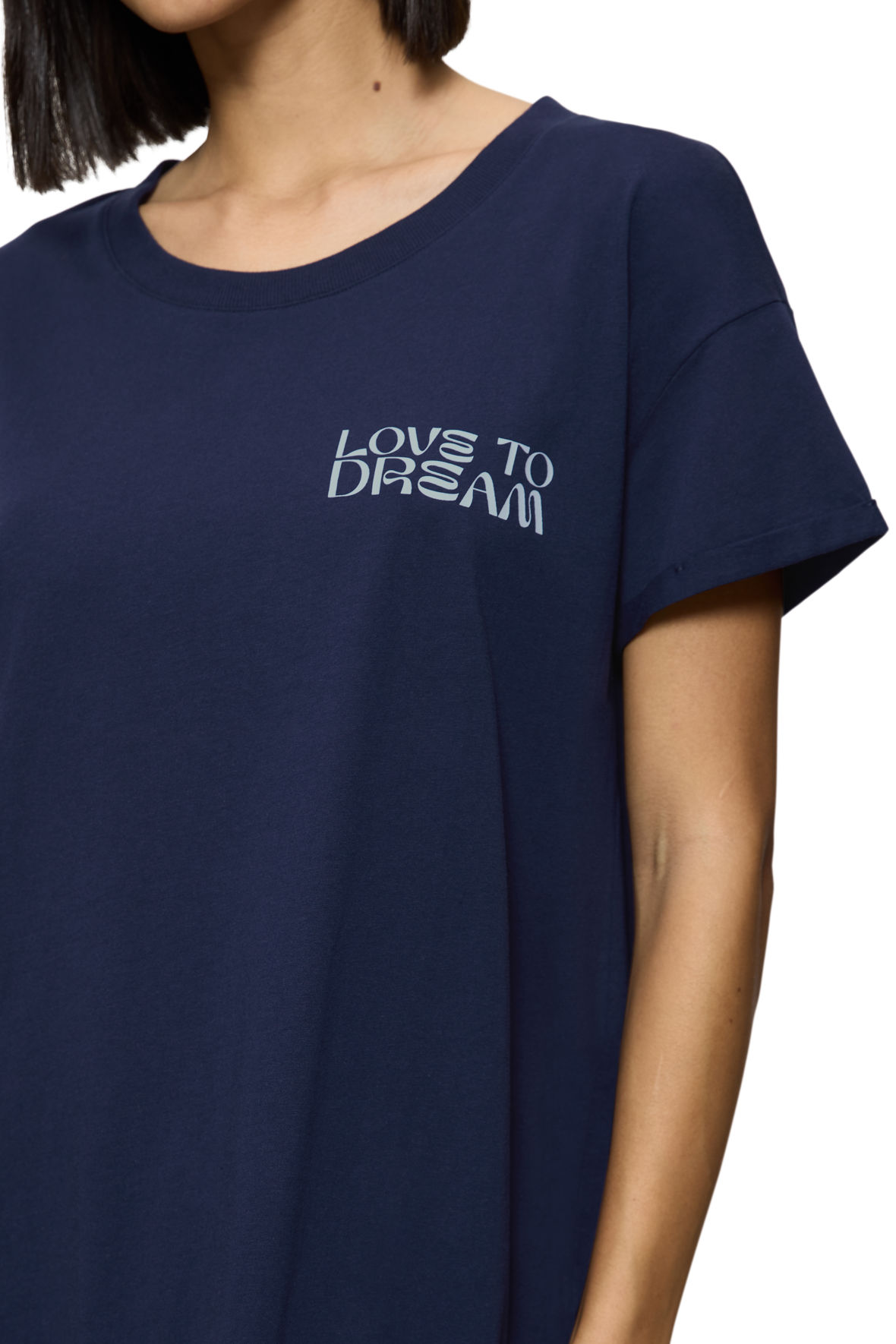 Nattesøvnen kan drille mange, derfor skab ro i soveværelset. Sørg for at dit nattøj er blødt åndbart og giver dig den rare oplevelse det skal være at krave i seng. Her en lidt yngre natkjole i ren bomuld. Den har ribstrikket rund halslinje samt korte ærmer med lille fast opsmøg hvor skuldersømmen er trukket lidt ned. Den har en længde til lige over knæ. Sødt print på brystet "Love To Dream".