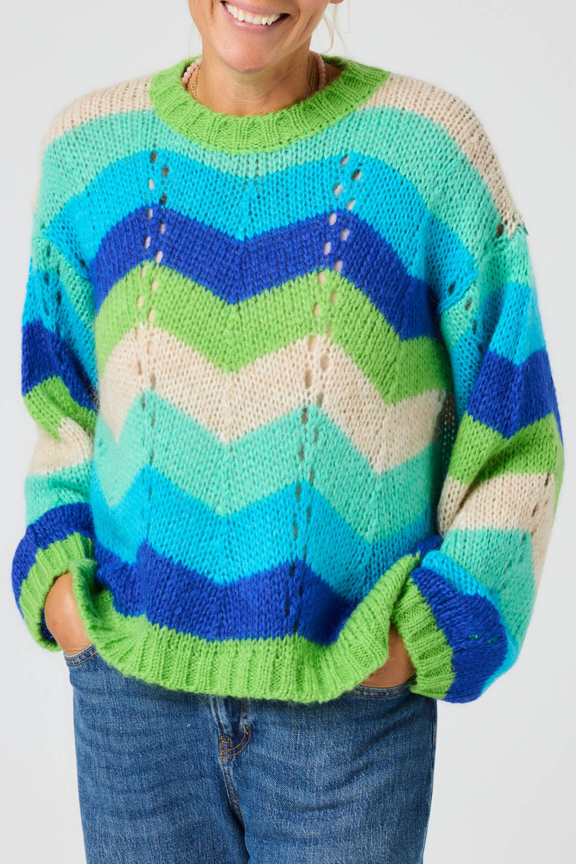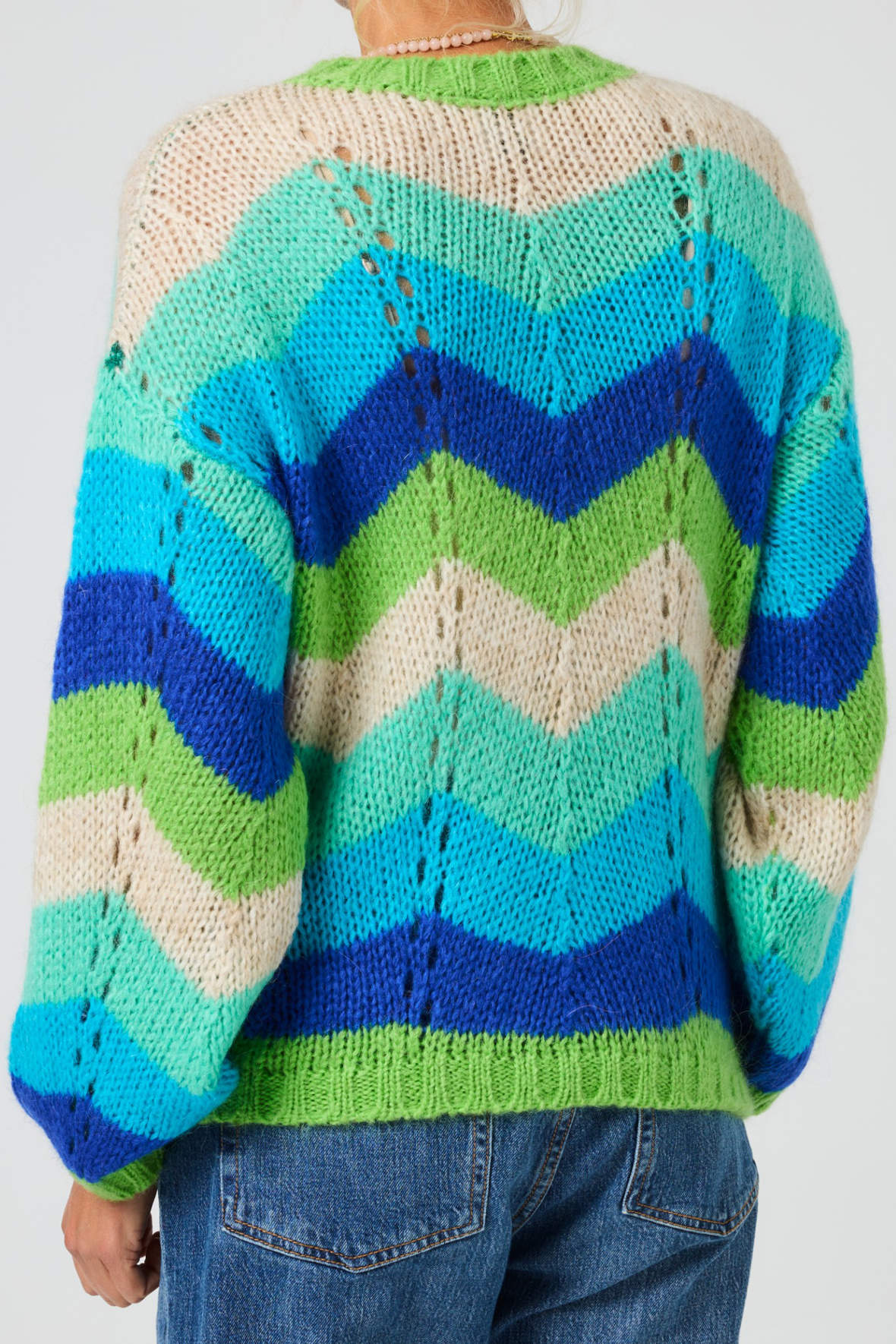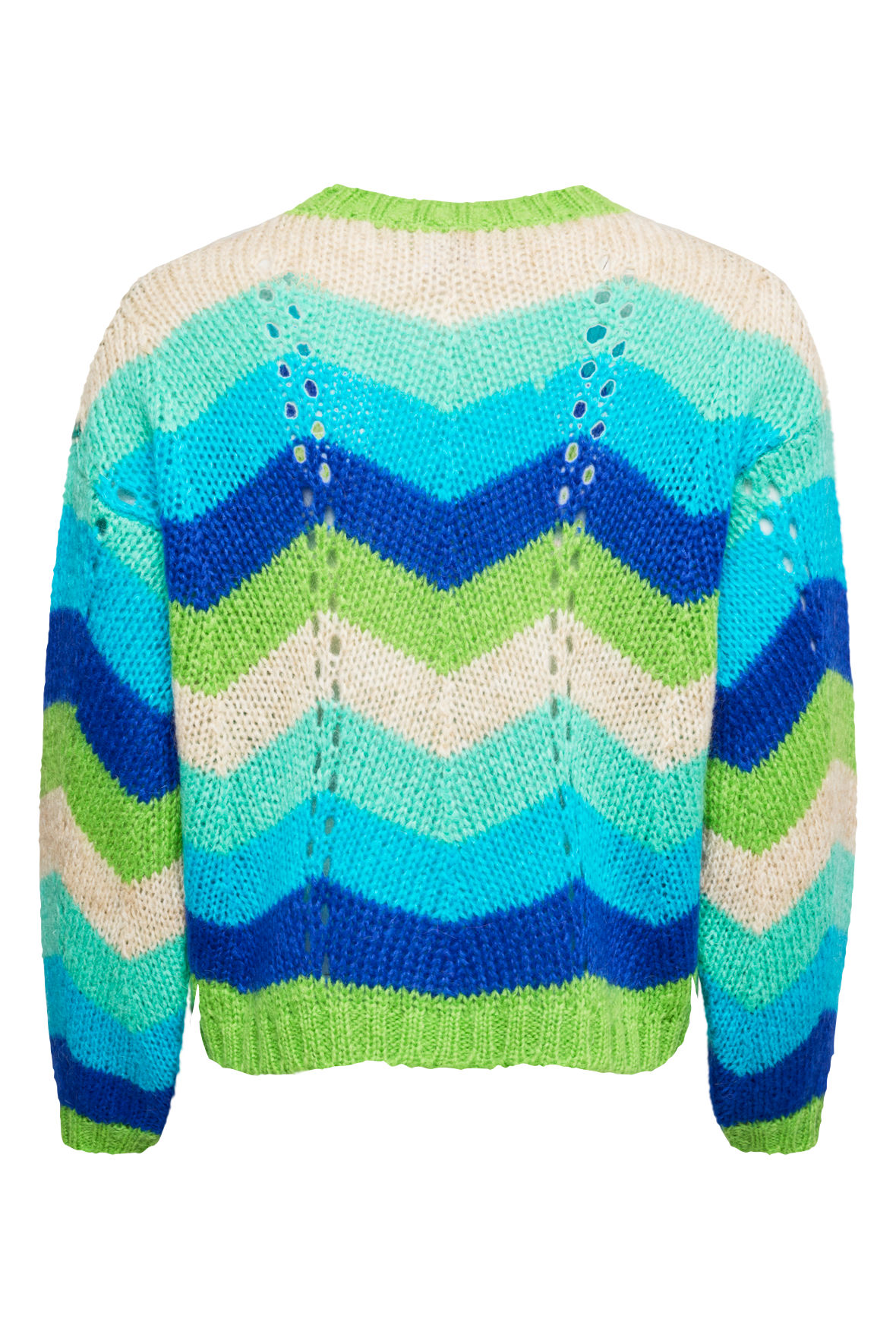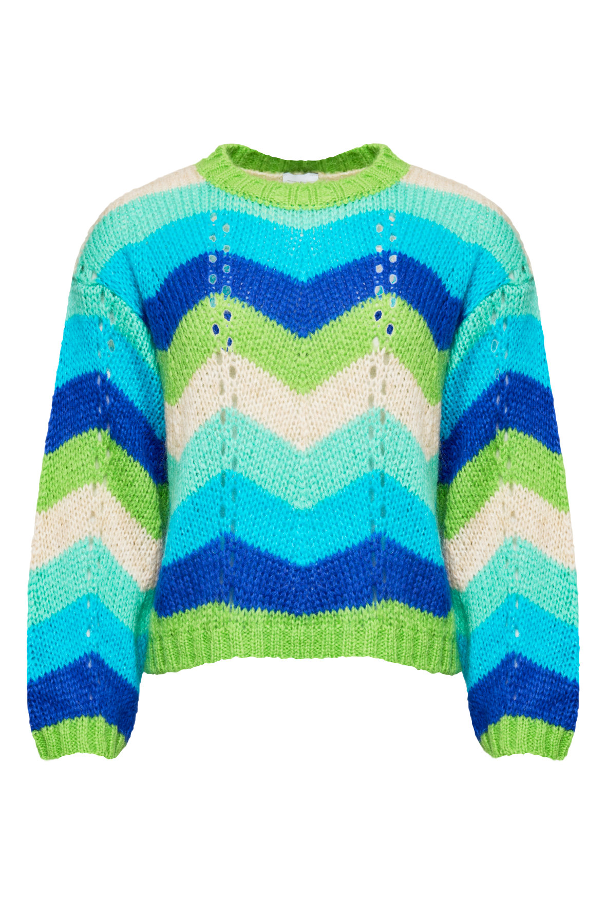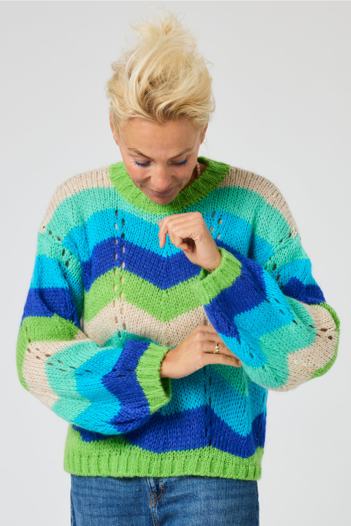 Sikke en fantstisk flot Lene Beier strikbluse. Zigzag bølge mønstret med friske farver og strikhuller. Den er rund i halsen og skuldersømmen er trukket ned på overarmen. Der er god volumen på de lange ærmer - sådan lidt ballon inspireret. Der er ribstrik på kanter. Lene kan godt lide at strikken ikke sidder for tæt. Lind strik har nøje lyttet til Lenes' ønsker så den er blevet præcis som hun ønsker i Linds vanlige høje kvalitet. Vamset blød, varm og holder sig flot.