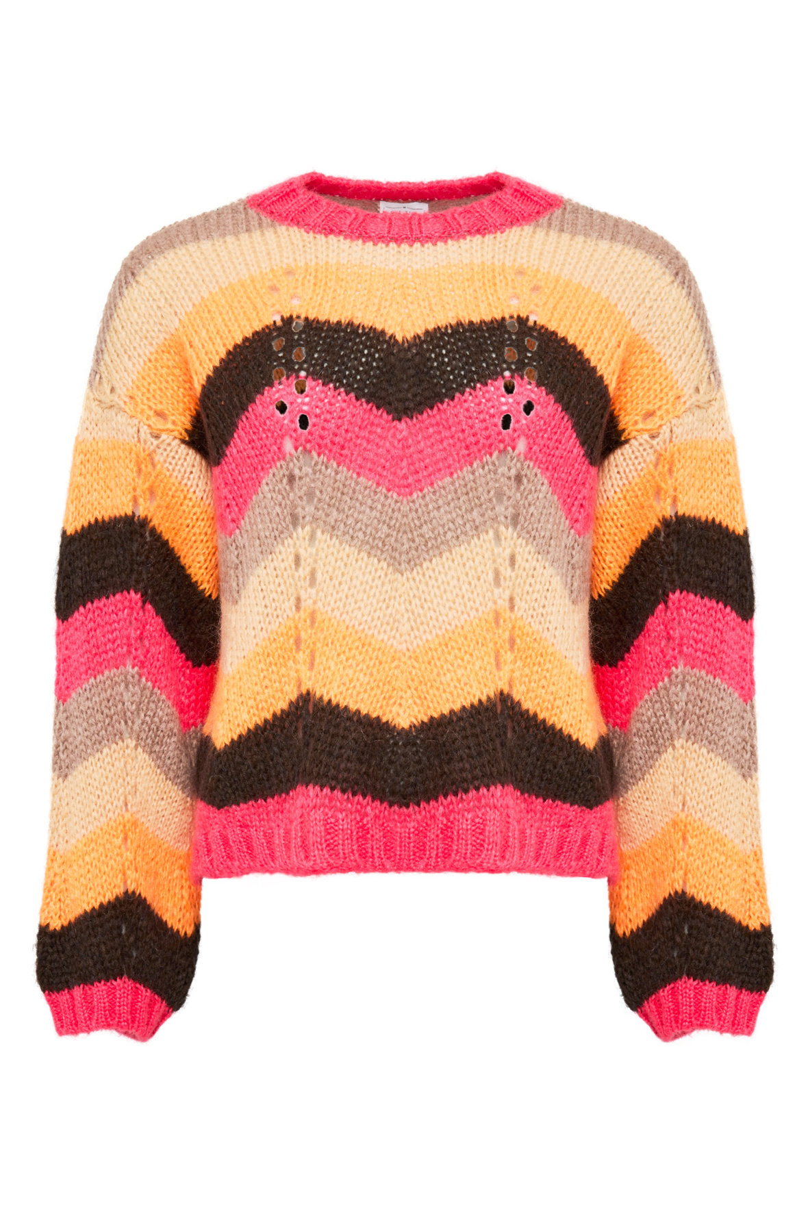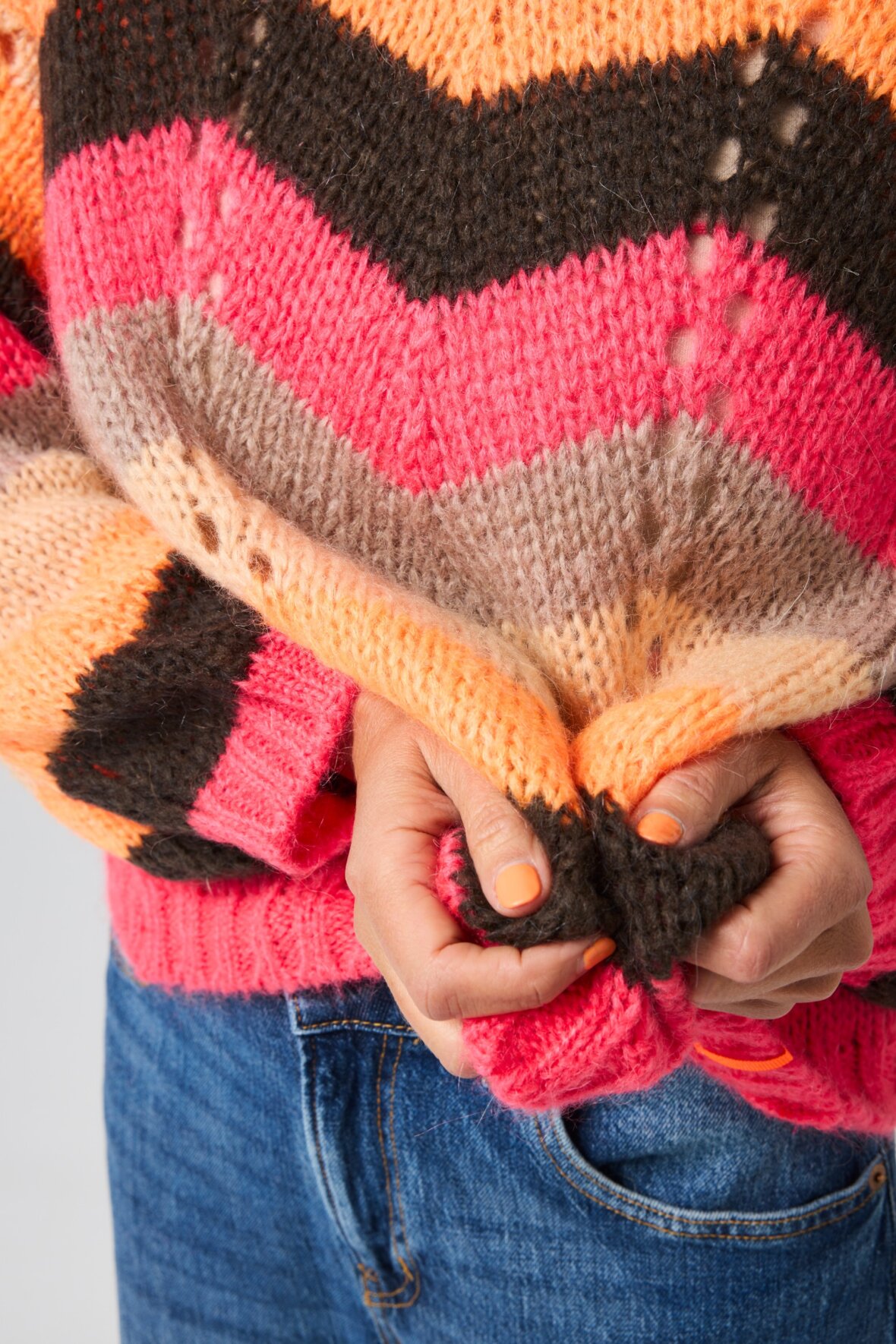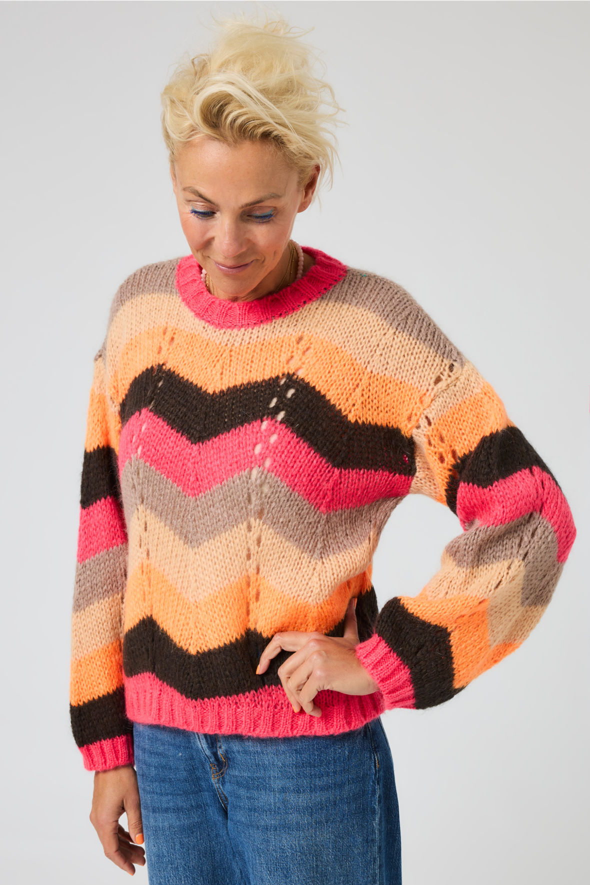 Sikke en fantstisk flot Lene Beier strikbluse. Zigzag bølge mønstret med friske farver og strikhuller. Den er rund i halsen og skuldersømmen er trukket ned på overarmen. Der er god volumen på de lange ærmer - sådan lidt ballon inspireret. Der er ribstrik på kanter. Lene kan godt lide at strikken ikke sidder for tæt. Lind strik har nøje lyttet til Lenes' ønsker så den er blevet præcis som hun ønsker i Linds vanlige høje kvalitet. Vamset blød, varm og holder sig flot.