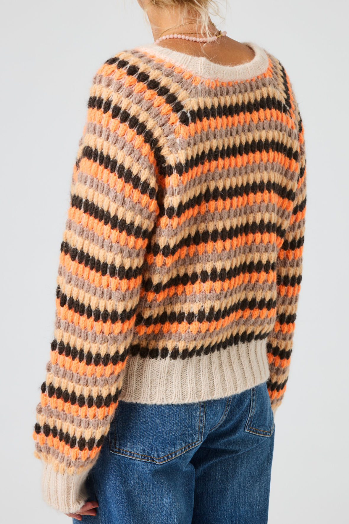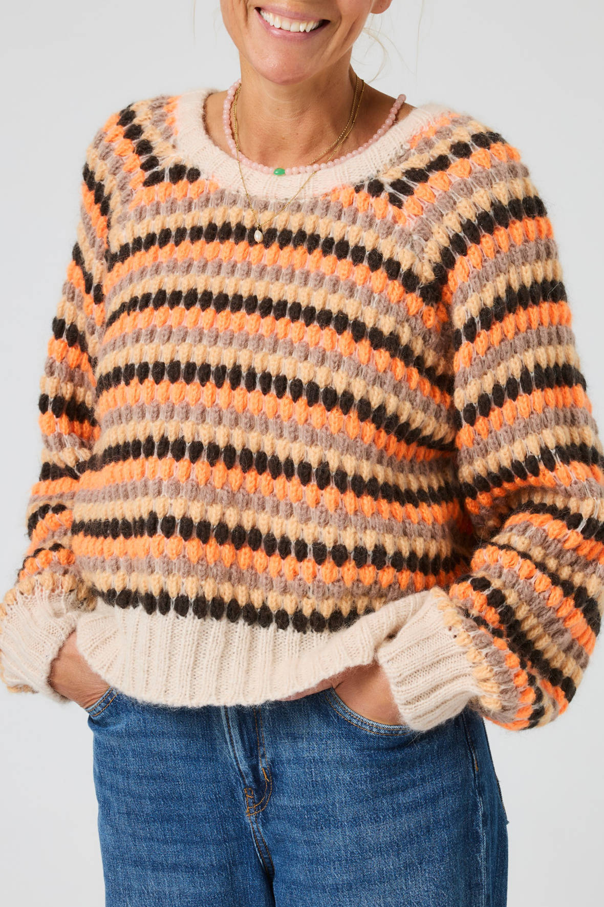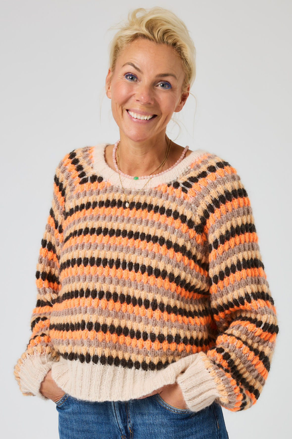 En strik pullover er dit værn, nu tænker du sikker ogsa "ja ja den er varm", det er den. Men den er også et værn mod dårligt humør og gråvejrsdage. Ikke så mærkeligt at Lene Beier har kaldt den Solstrejf og Lind strik har nøje lyttet til Lenes' ønsker. Flotte farver kombineret med et smukt mønster, pasformen der har god plads. Volumen i ærmer og ribstrik på kanter. Linds vanlige høje kvalitet. Vamset blød, varm og holder sig flot. En blandingskvalitet du bliver vild med.