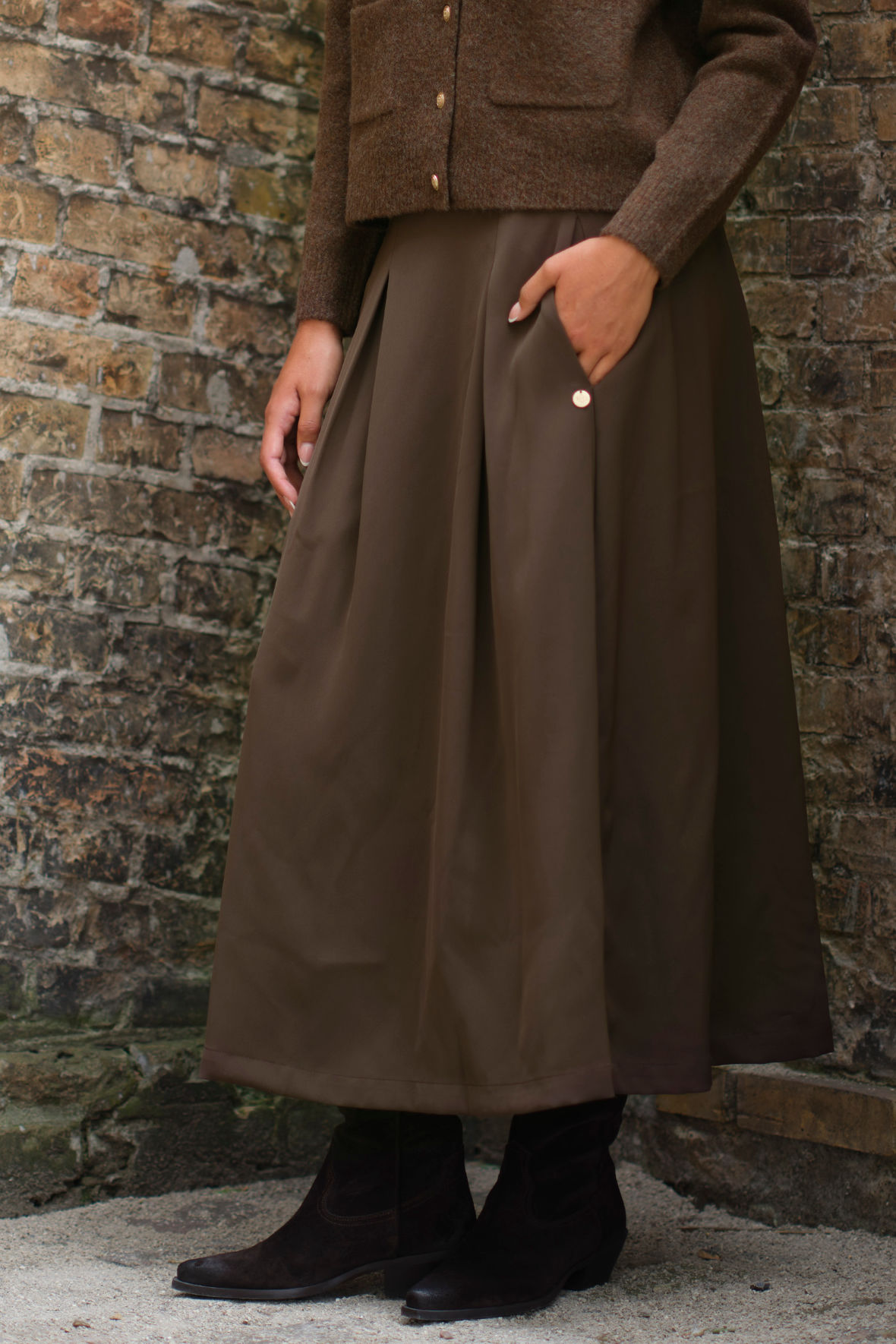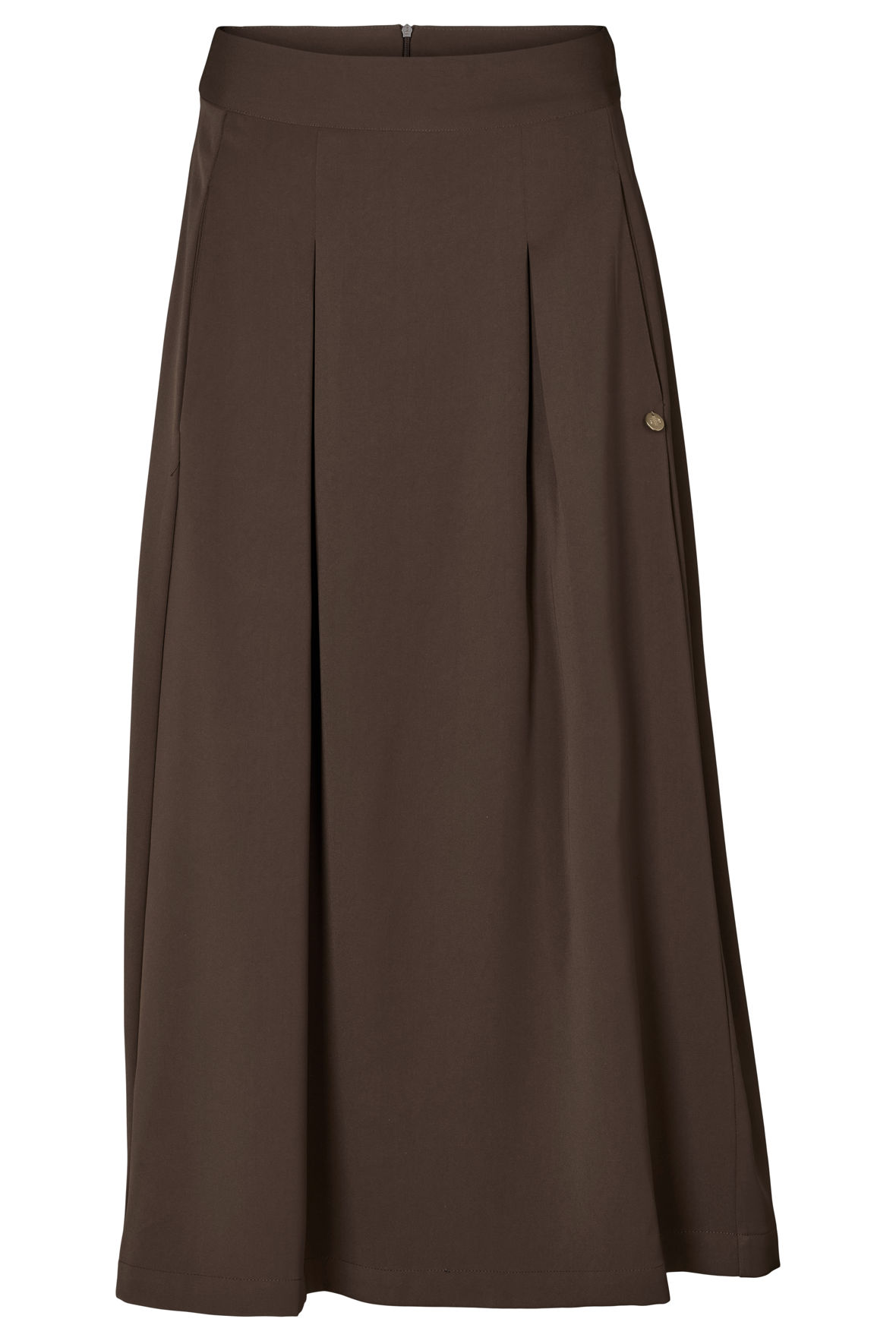 Brun er in rigtig meget endda og der kommer meget mere fra alle brands. Nu kigger du på Pauline som i bedste Prepair stil fanger det der rør sig lige nu. Den er med læg øverst og indsnit der har en flot indvirkning på figuren. I forlængelse af indsnit har den franske lommer. Den er fast vævet i en fremragende polyester der ikke ændrer sig og ej krøller. Med flot længde der taler ind i de fleste. Den har fast bred/høj linning og har skjult lynlås bagtil. Den er uden foring.