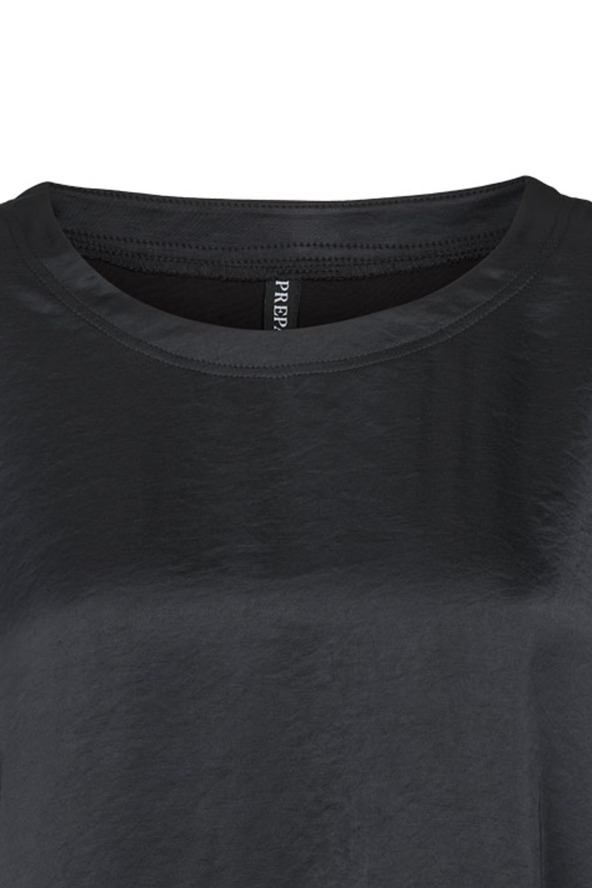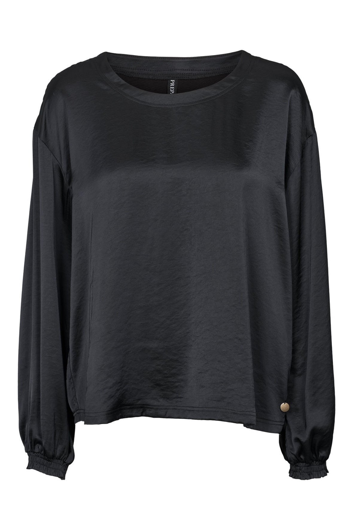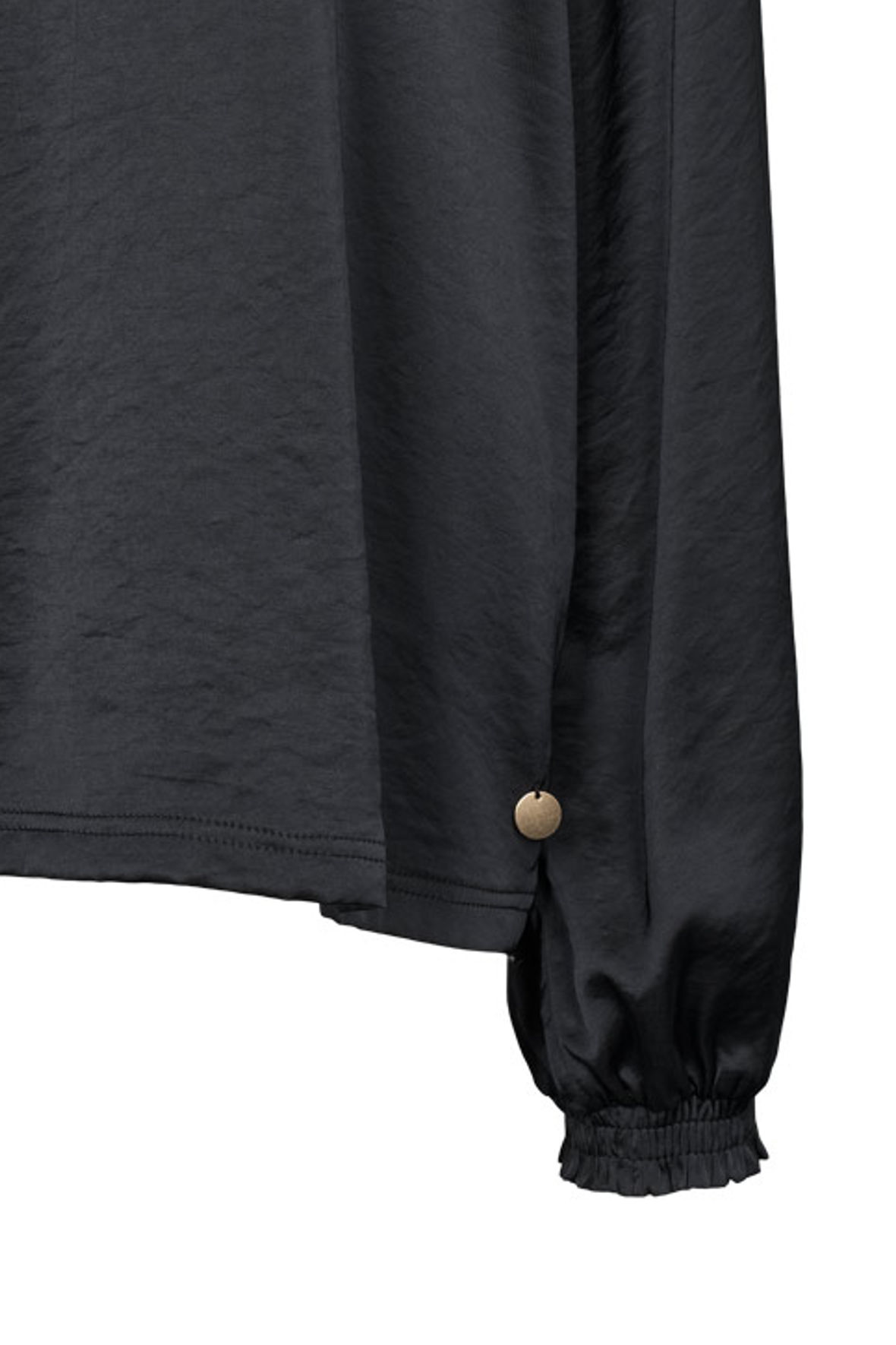 Her er du i det mere elegante og faktisk også tidløse look. Hævet over årstid og trends, jeg fristes til at sige du går dine egne veje, men gør det med stil. Polyester/viskose-satin har bare et elegant skindende udtryk. Med rund halslinje der lige har fået lidt mere vidde, det ser så dejligt feminint ud. Skuldersømmen er trukket ned på overarmen, ærmer i fuld længde med smock elastik ved håndled giver lidt puf-effekt. Den falder løst også ved hofter. En model med god plads til barmen og et løst snit lader dig snildt gå en str. ned.