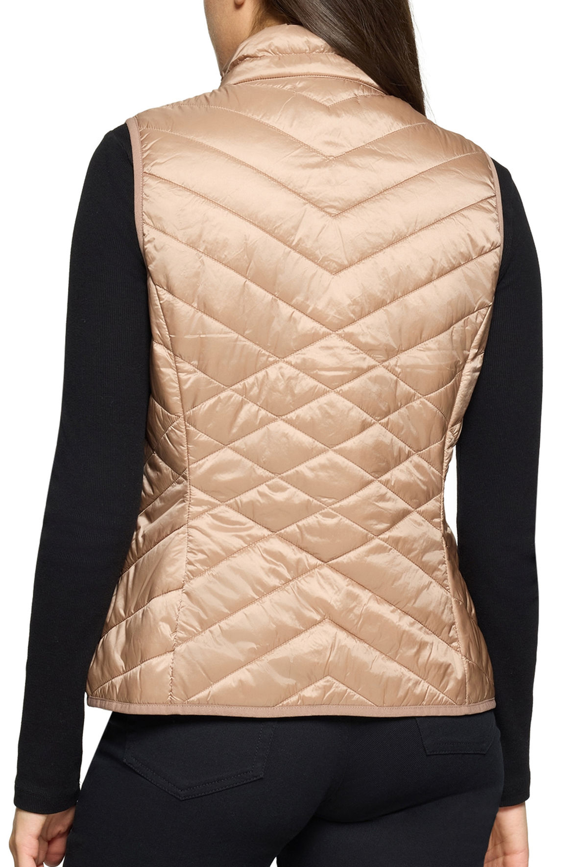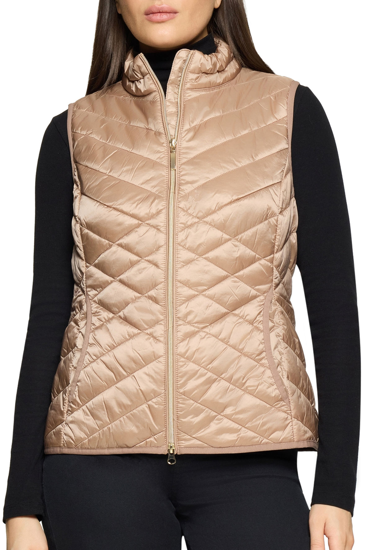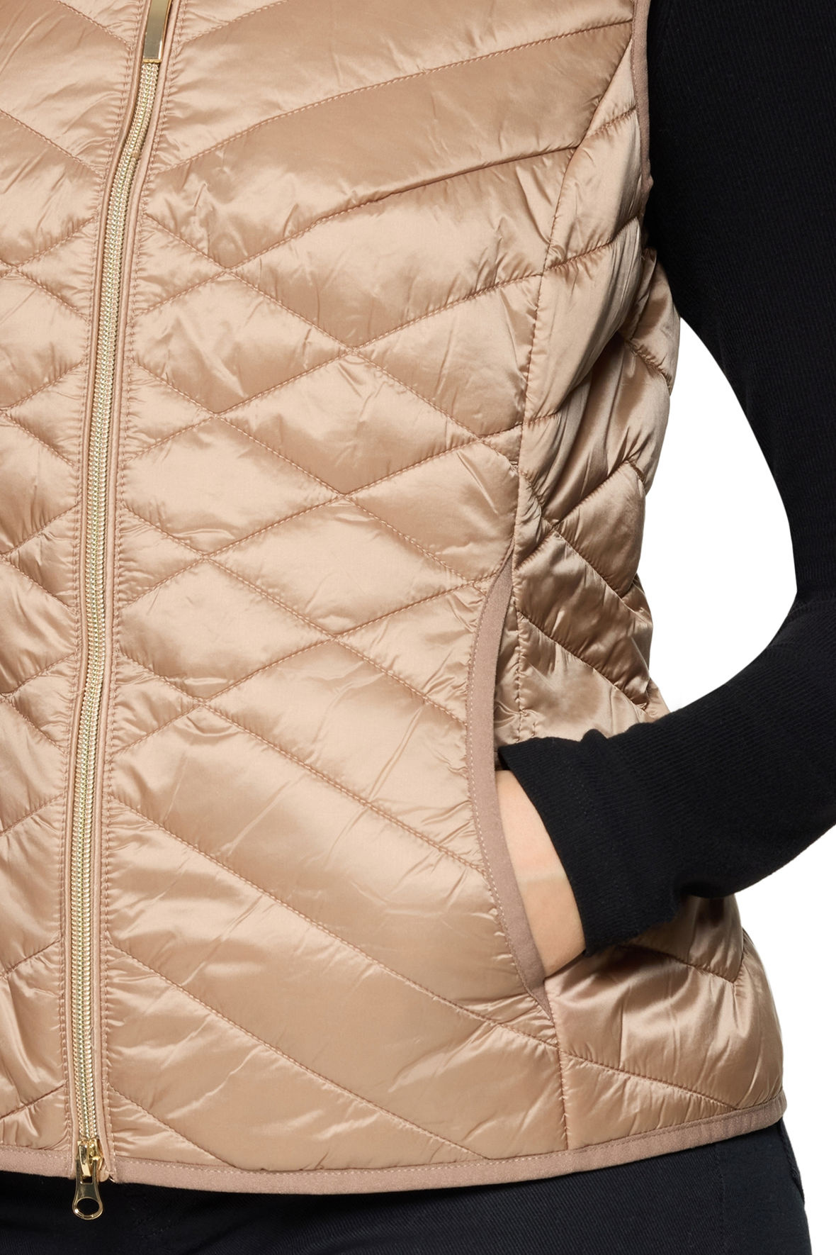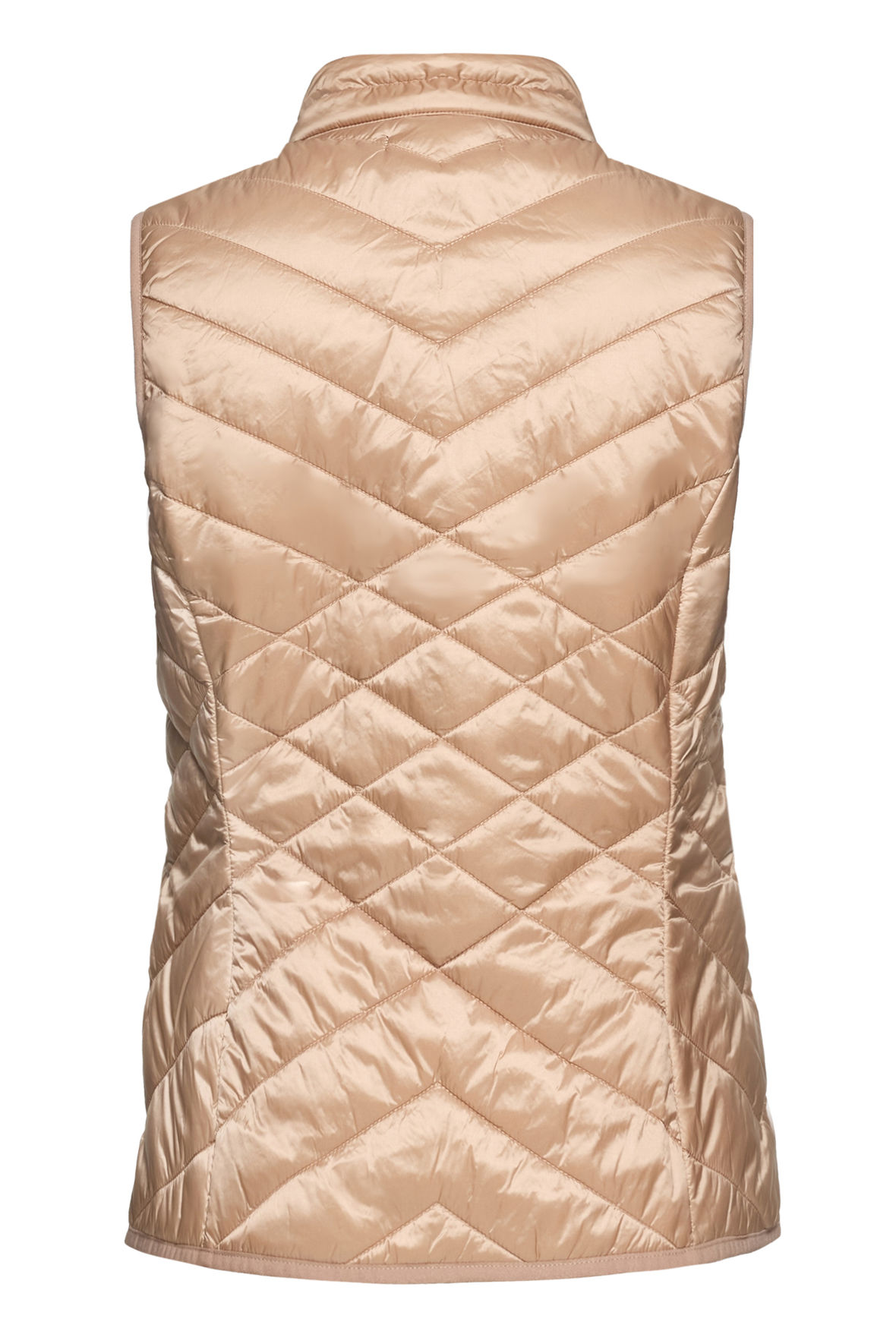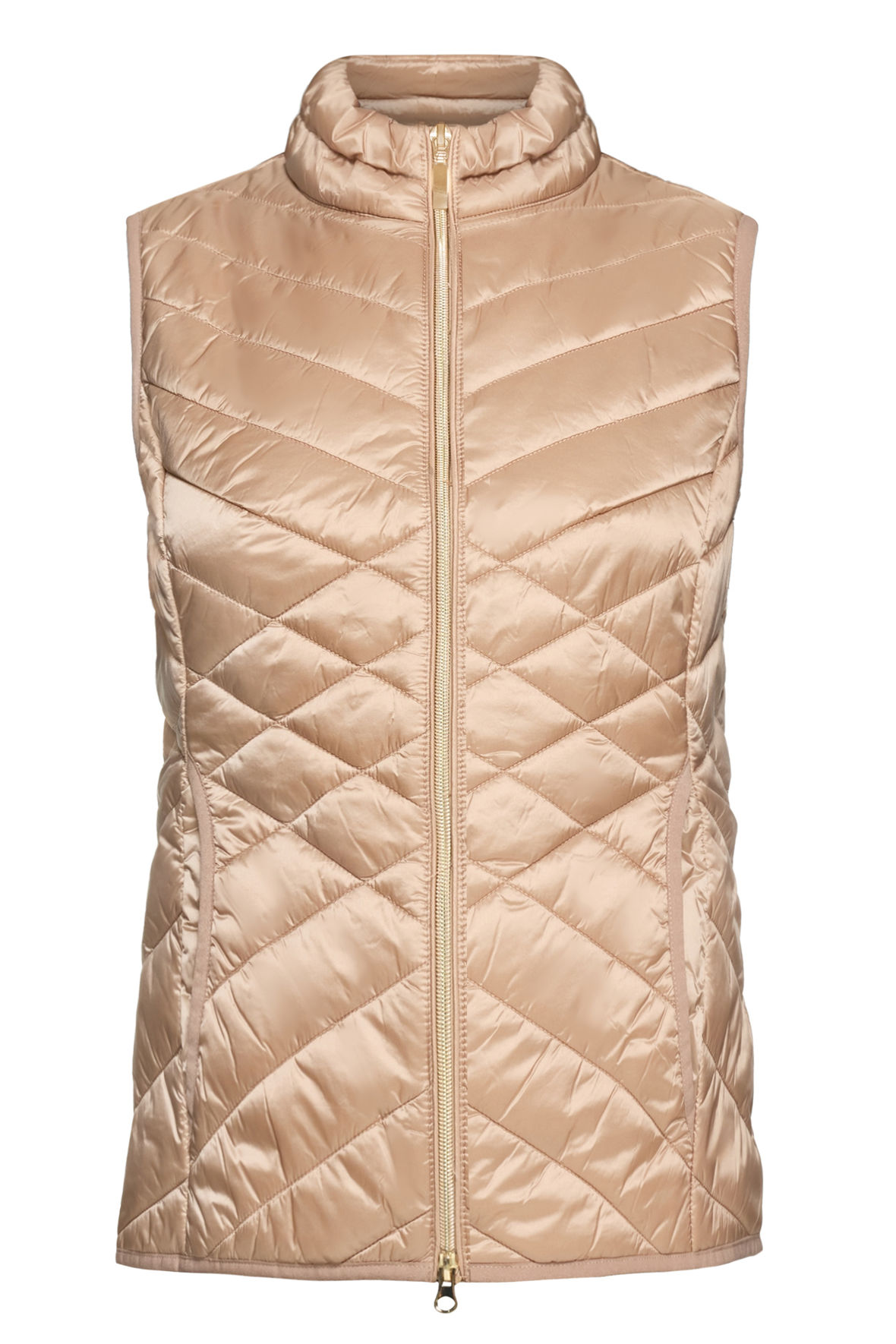 Quilt vest fra Betty Barclay med varm polyester vattering. Quilt mønster der har flot indvikning på figuren. Lavet med tone i tone piping på kanter og så har den tovejs lynlås. Dejlig høj i kraven og så har den lommer både udvendigt samt indvendigt. En vest med skindende overflade som passer så smart til hverdagen. Slut med at fryse under en lidt tynd jakke eller bare benytte den i overgangs perioden samt ind i sommeren. Ja den er helt uden årstid og bliver derved ved med at gøre sig gældende år efter år. Den er størrelsessvarende.