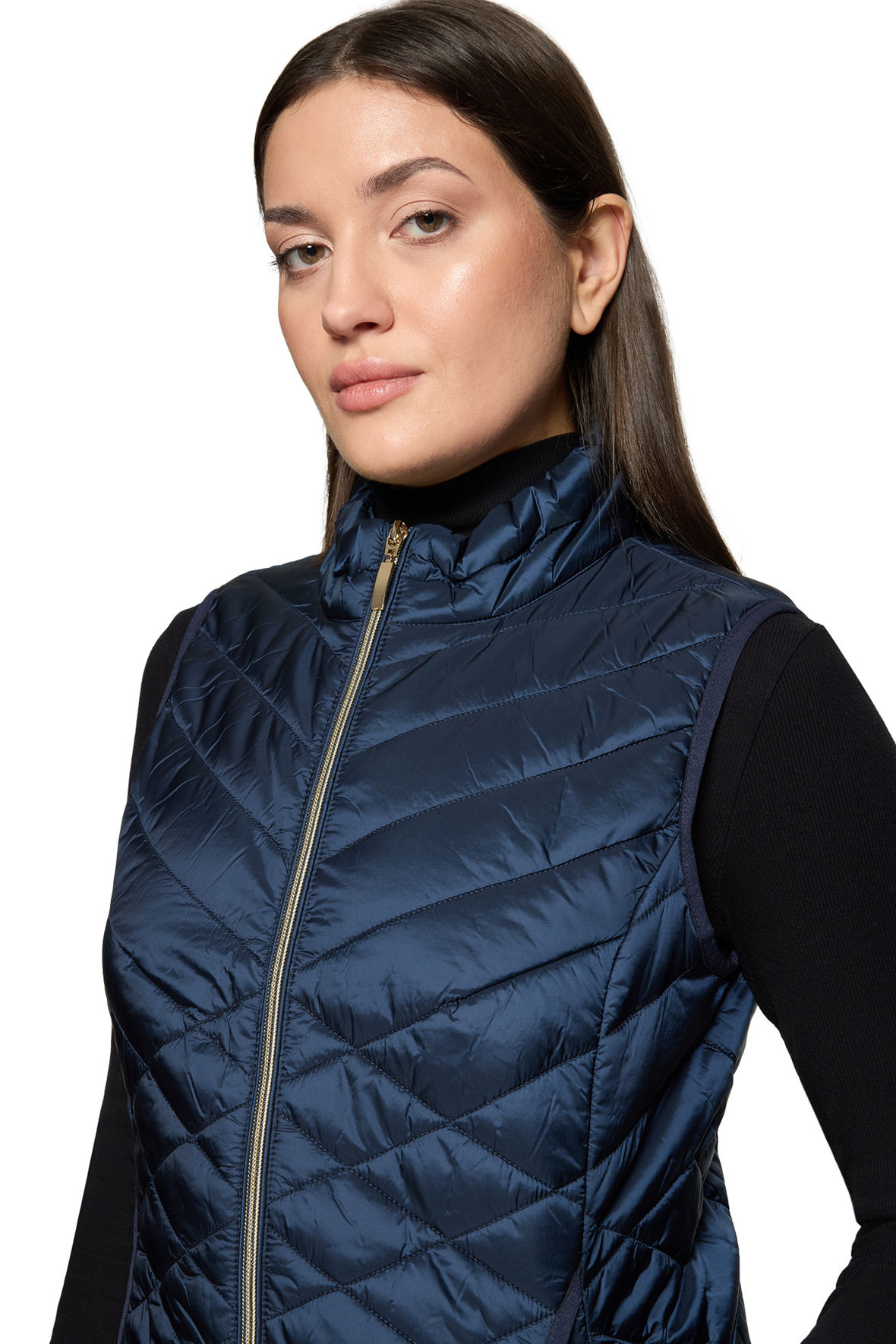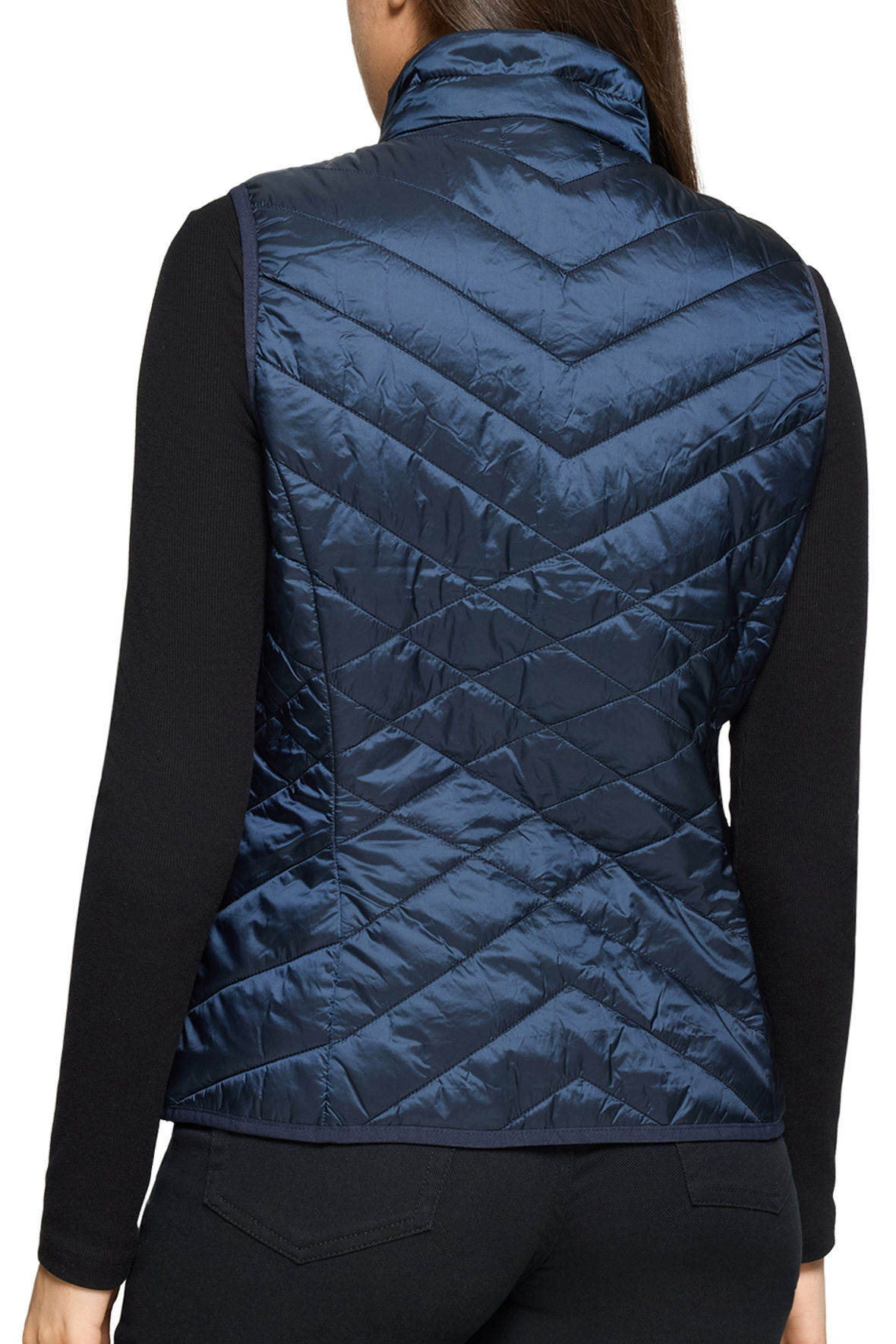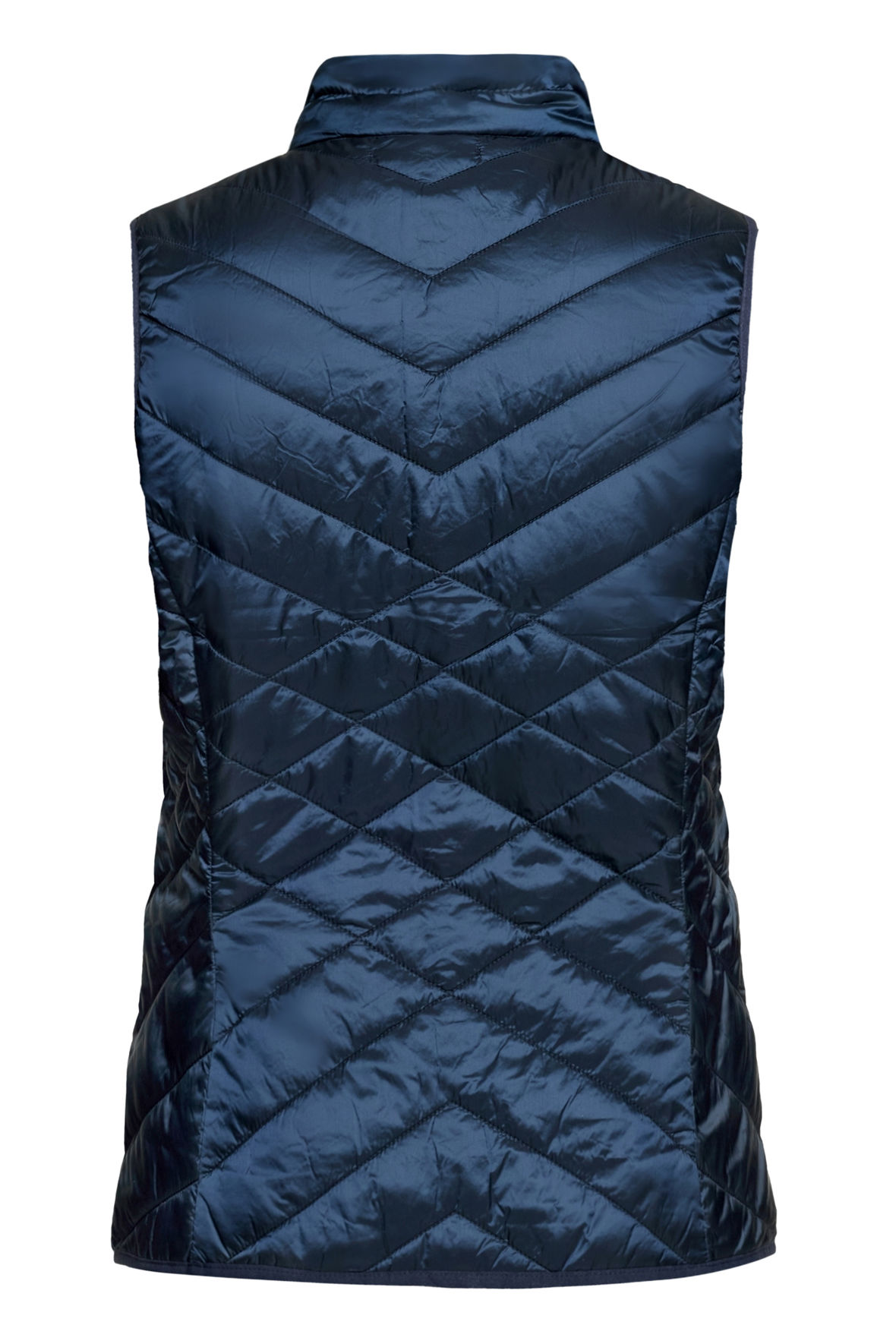 Quilt vest fra Betty Barclay med varm polyester vattering. Quilt mønster der har flot indvikning på figuren. Lavet med tone i tone piping på kanter og så har den tovejs lynlås. Dejlig høj i kraven og så har den lommer både udvendigt samt indvendigt. En vest med skindende overflade som passer så smart til hverdagen. Slut med at fryse under en lidt tynd jakke eller bare benytte den i overgangs perioden samt ind i sommeren. Ja den er helt uden årstid og bliver derved ved med at gøre sig gældende år efter år. Den er størrelsessvarende.