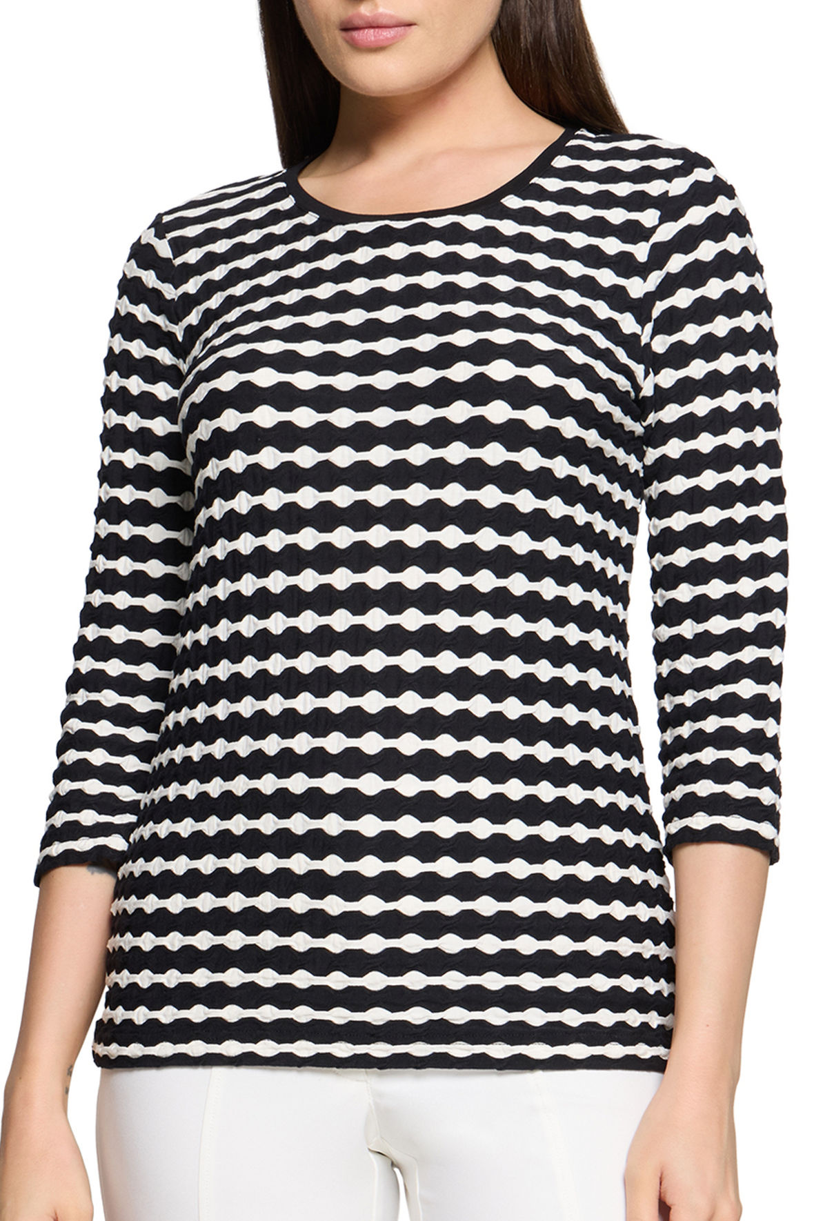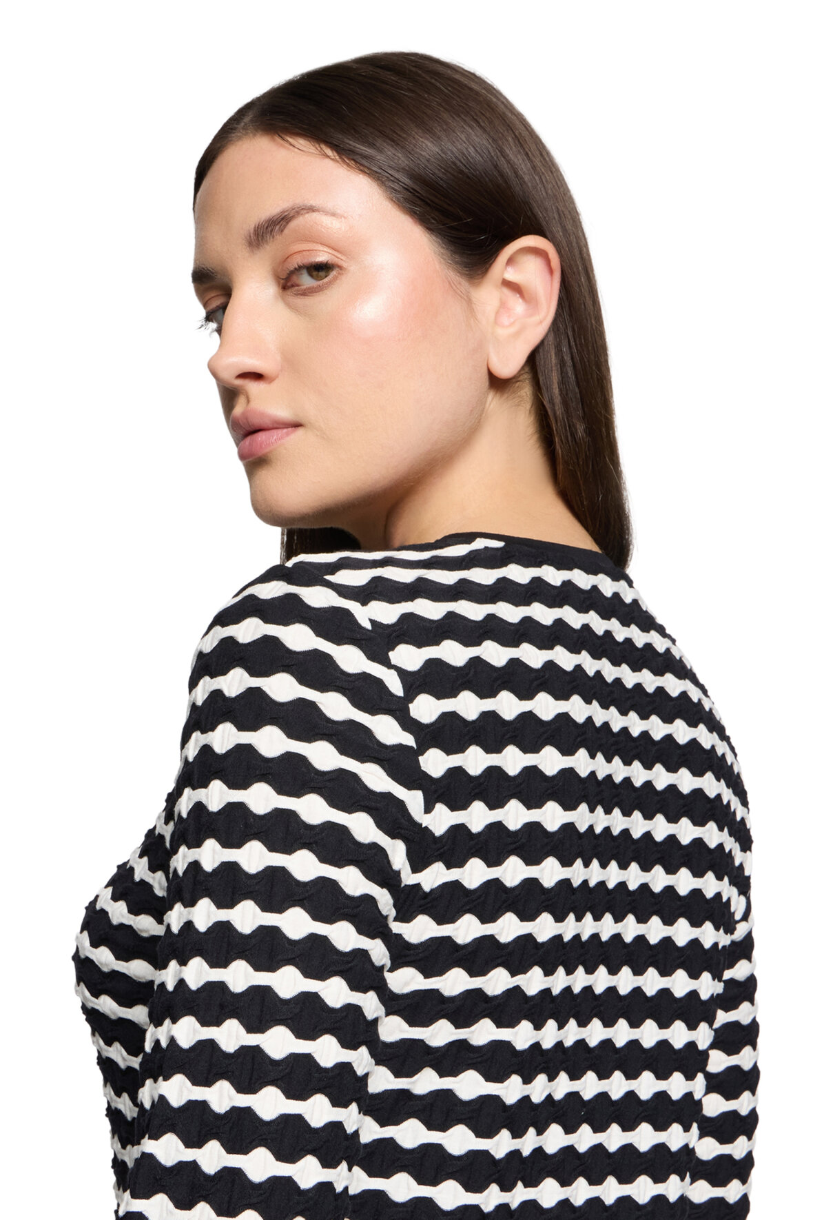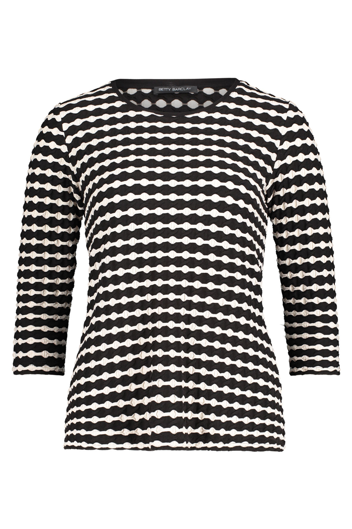 Så er der altså lige dømt eksklusiv t-shirt. Betty Barclay har lavet den stribet i sort og hvid, hvor striberne har en elastisk garn i sig (det kalder man materiale mix) der giver den 3D effekt - altså at den får noget mere tekstur end bare at være glat. Den er rund i halsen med kant og så er ærmerne i trekvart længde. Komforten er i højsædet da den er lavet i Jersey og der er ikke mere tilbage at ønske. Den er en anelse taljeret for at gøre den feminin. Den er krølfri og holder farven samt faconen.