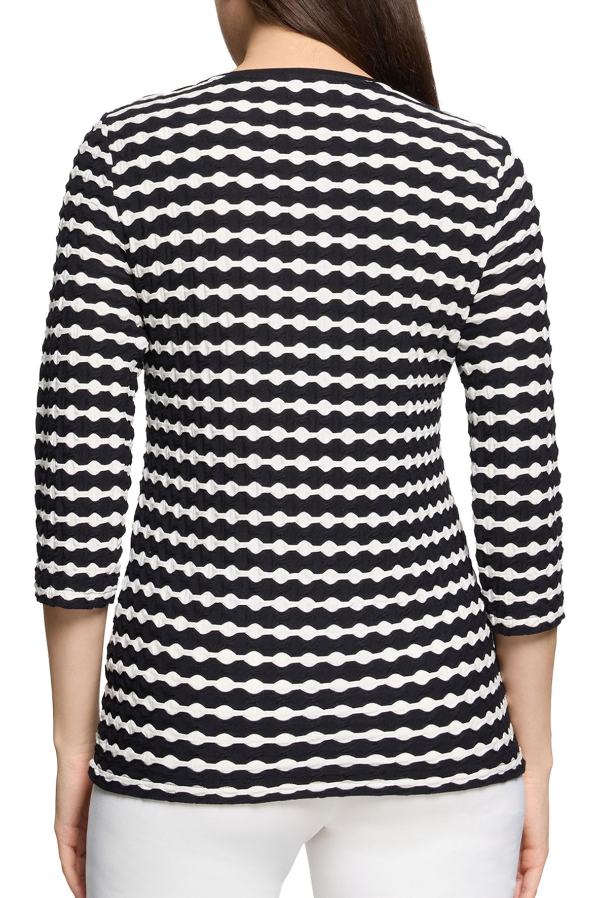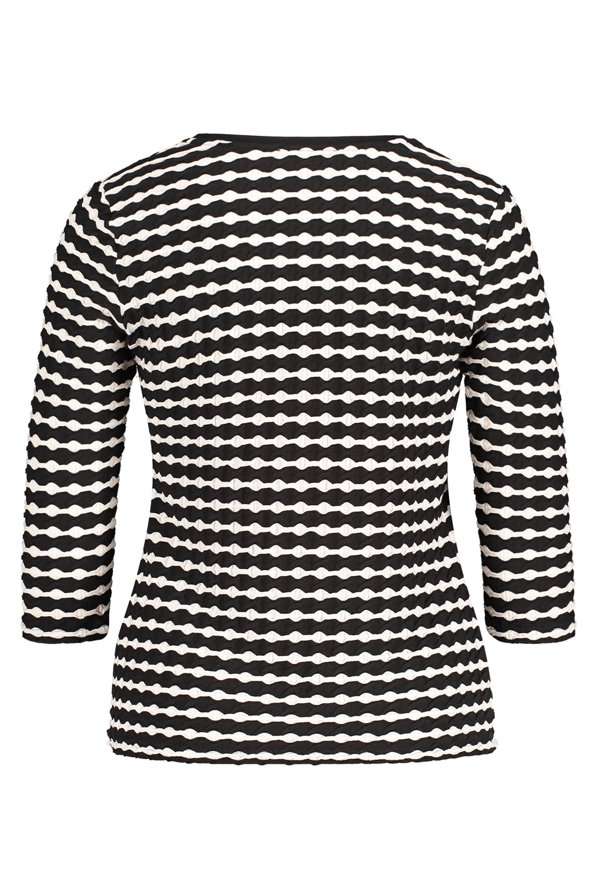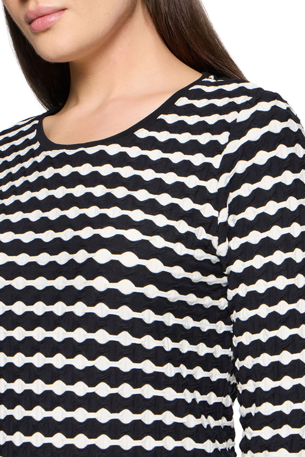 Så er der altså lige dømt eksklusiv t-shirt. Betty Barclay har lavet den stribet i sort og hvid, hvor striberne har en elastisk garn i sig (det kalder man materiale mix) der giver den 3D effekt - altså at den får noget mere tekstur end bare at være glat. Den er rund i halsen med kant og så er ærmerne i trekvart længde. Komforten er i højsædet da den er lavet i Jersey og der er ikke mere tilbage at ønske. Den er en anelse taljeret for at gøre den feminin. Den er krølfri og holder farven samt faconen.