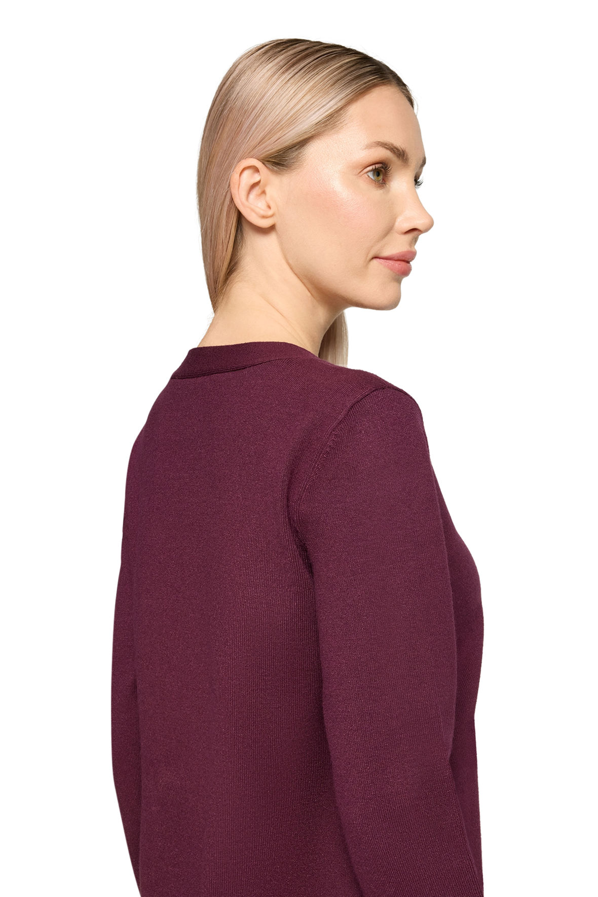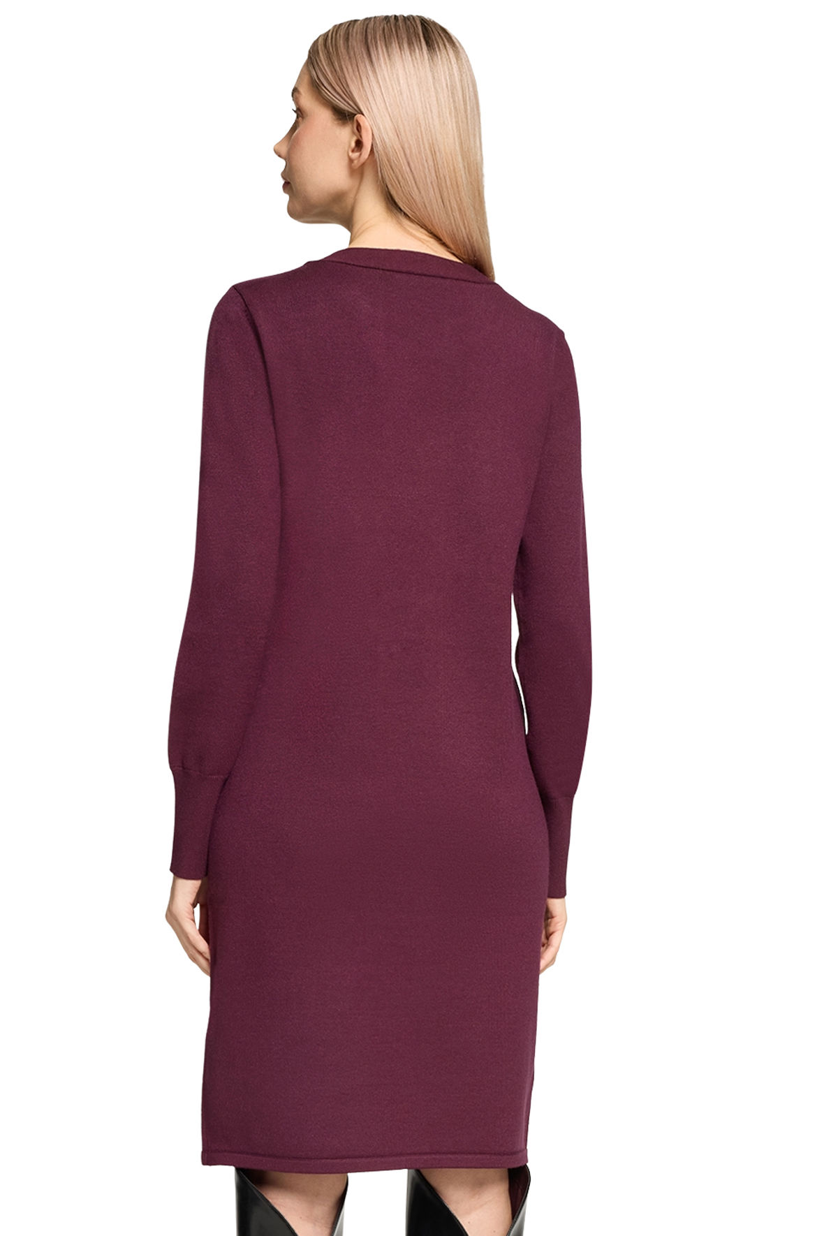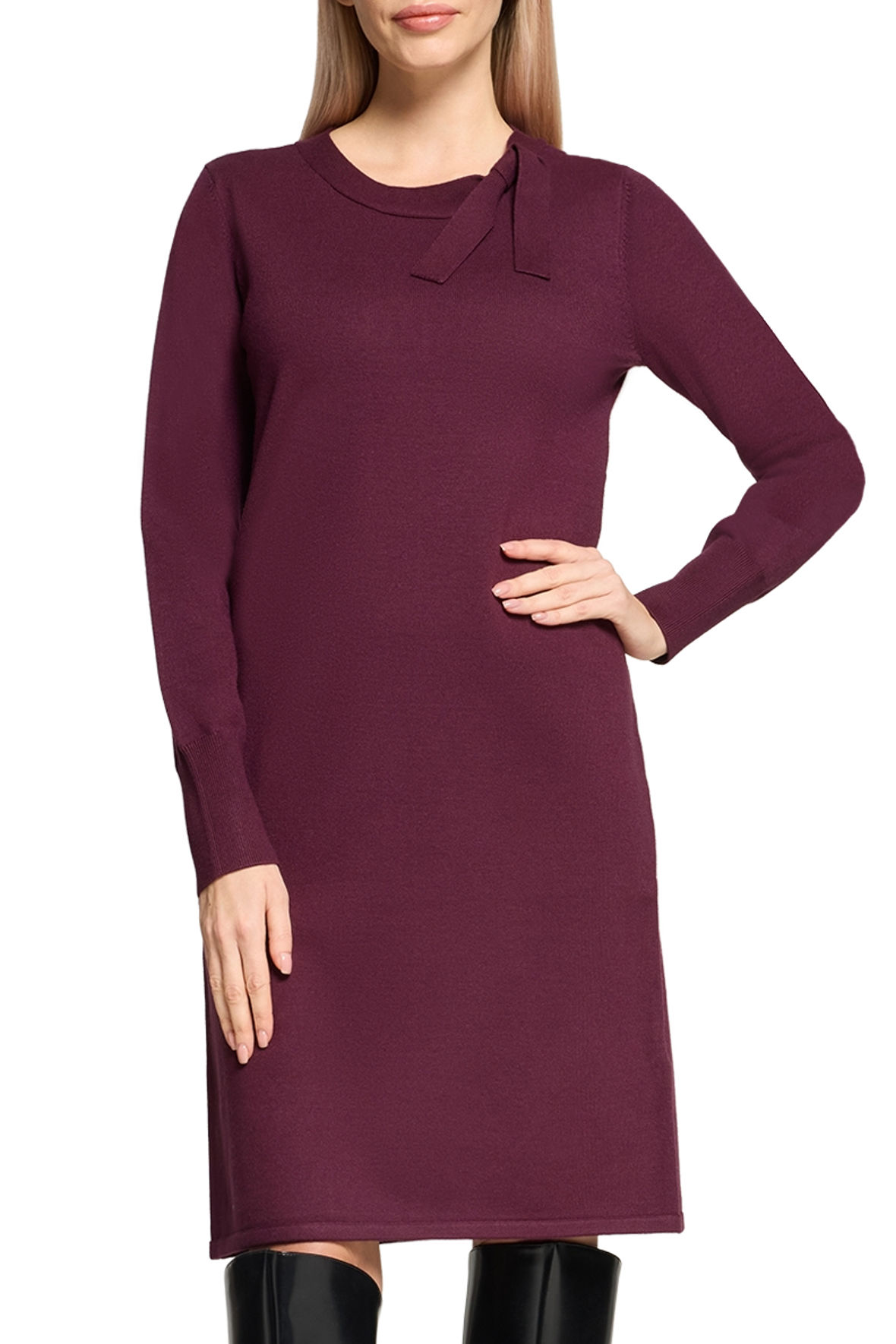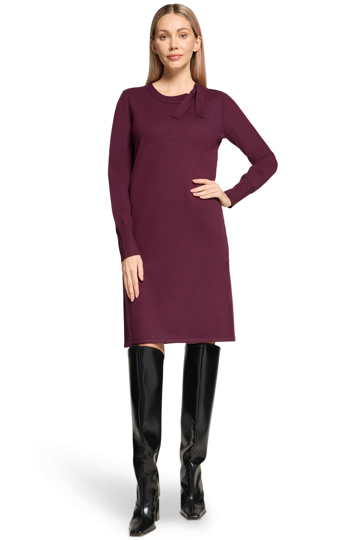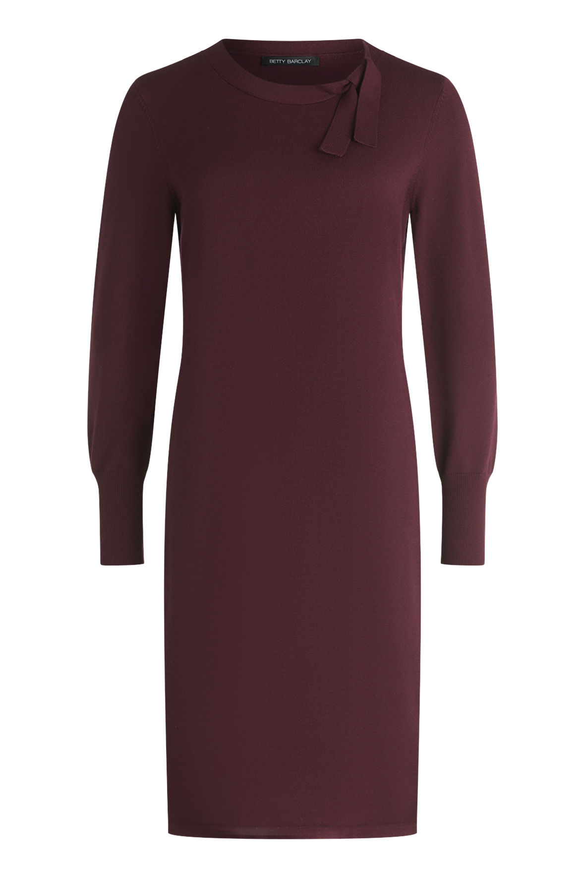 Mørk aubergine hedder farven originalt og den er vidunderlig. En rigtig smart og måske frem for alt elegant viskose strikkjole lavet i finstrikket kvalitet. En hyldest til kvindekroppen fristes jeg til at kalde den, for den sidder smukt top til knæ. Lad mig straks rydde første bekymring af vejen, for den holder farve og facon, krøller ikke og krymper ikke. Så lad åndbarheden, det bløde garn og snittet forkæle dig. Den starter med rund halslinje med bred kant der ender i lille sløjfe. Med lange ærmer med bred ribstrik manchet. Jeg håber du vil prøve den for den skuffer ikke.