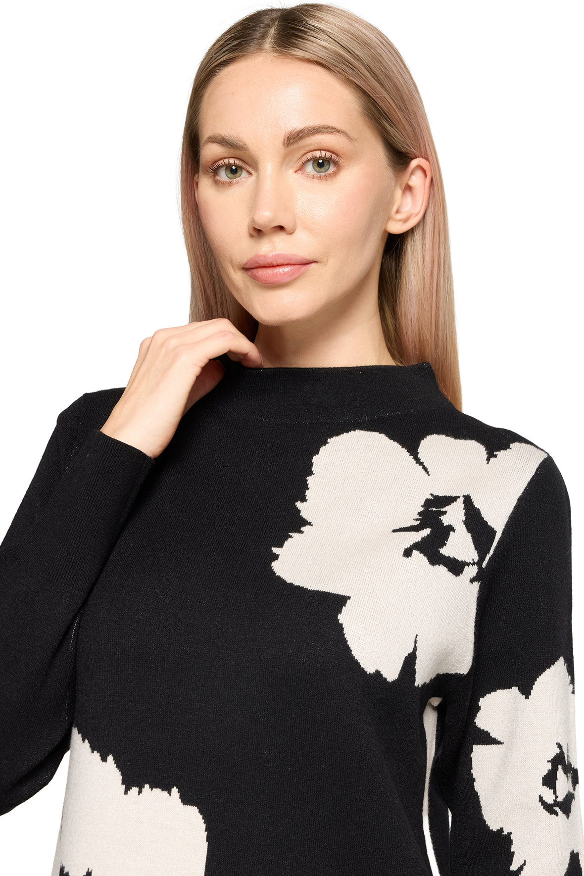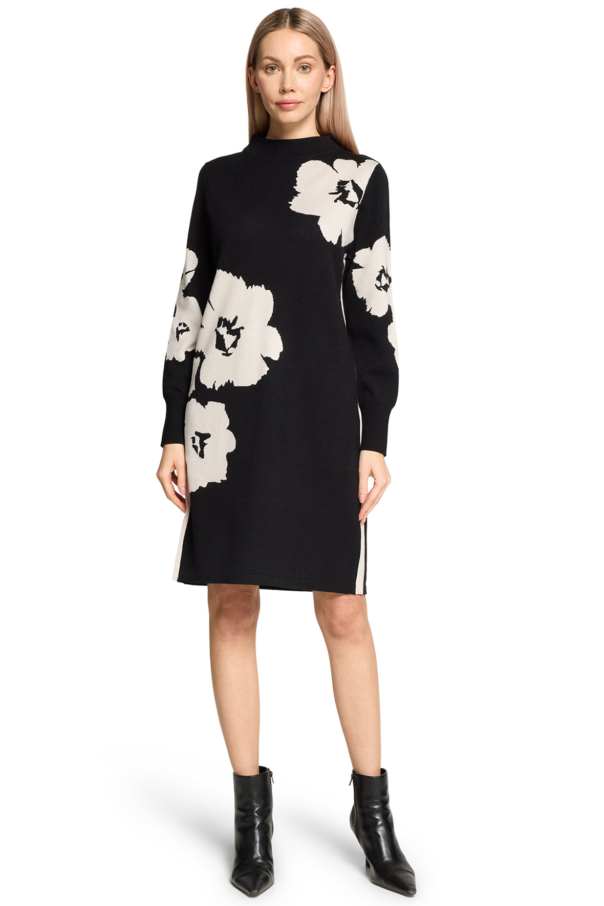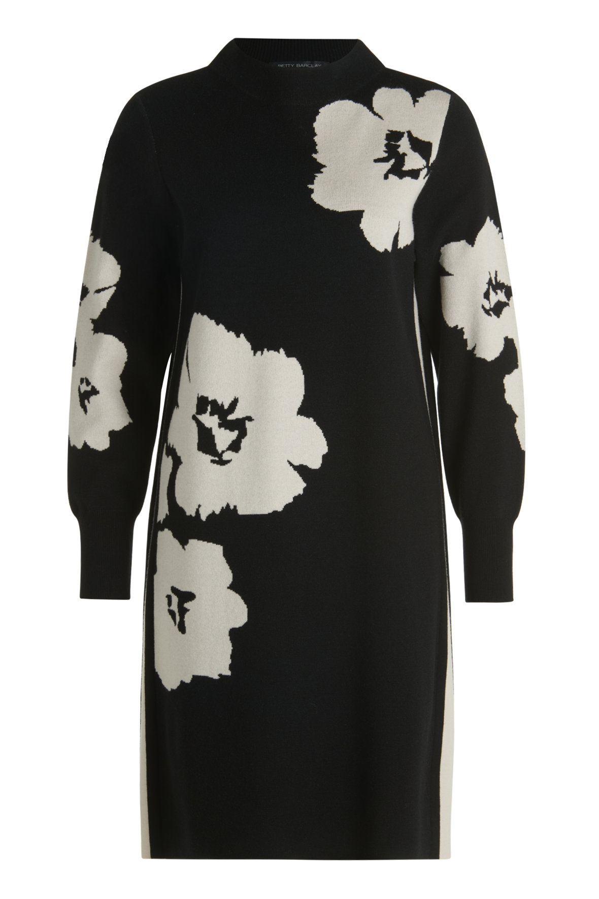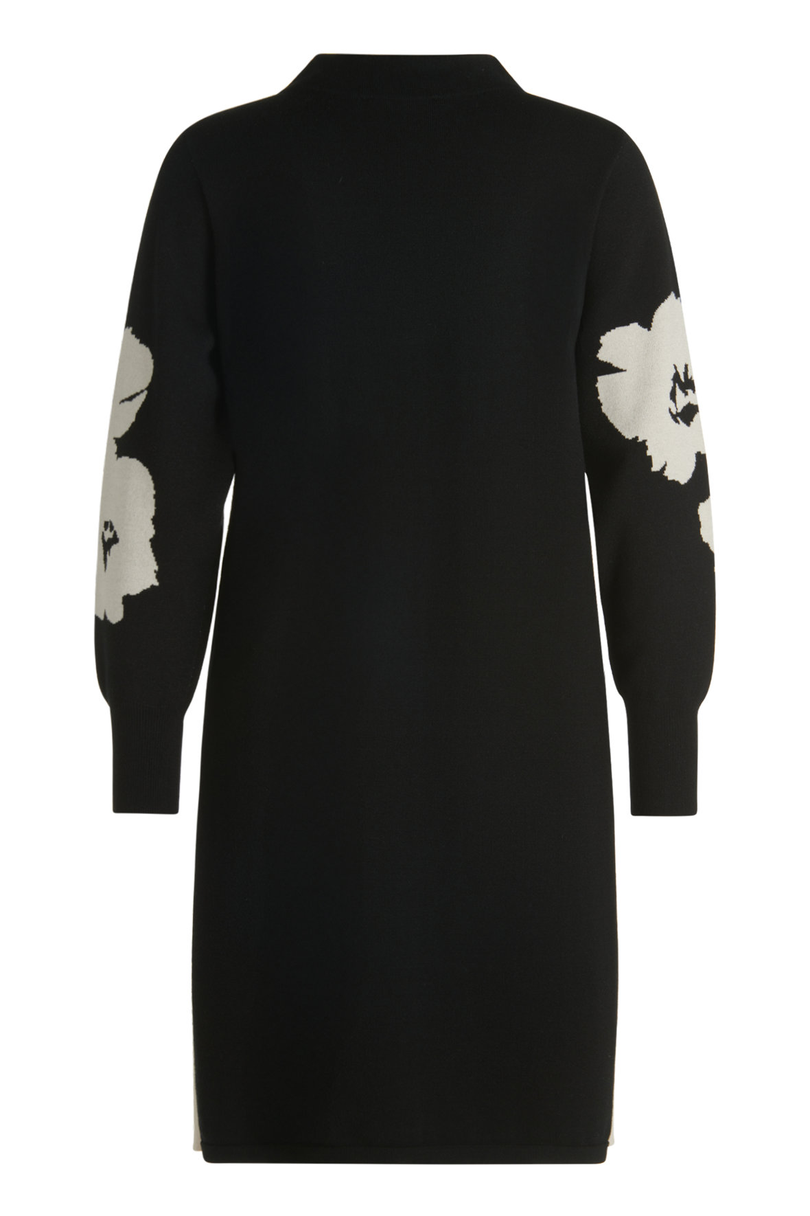 Detaljer er vigtige, det er de altid, så du får lige en hurtig gennemgang af kjolen. Black & Cream hedder farven originalt. En smuk og særlig viskose strikkjole lavet i finstrikket kvalitet med mønster af blomster. En hyldest til kvindekroppen fristes jeg til at kalde den, for den sidder smukt top til knæ. Lad mig straks rydde enhver bekymring af vejen, for den holder farve og facon, krøller ikke og krymper ikke. Så lad åndbarheden, det bløde garn og snittet forkæle dig. Den starter med rund halslinje med bred kant næsten en turtleneck. Med lange påsatte ærmer med bred ribstrik manchet. Den har lys stribe ned af siden der giver et sporty udtryk. Den er ensfarvet sort over ryggen og længden slutter lige over knæ. Feminin og komfortabel.