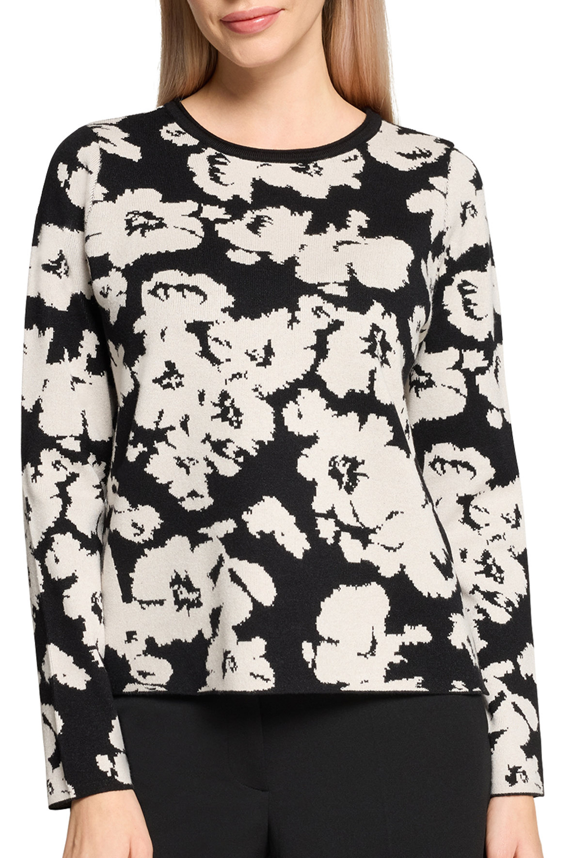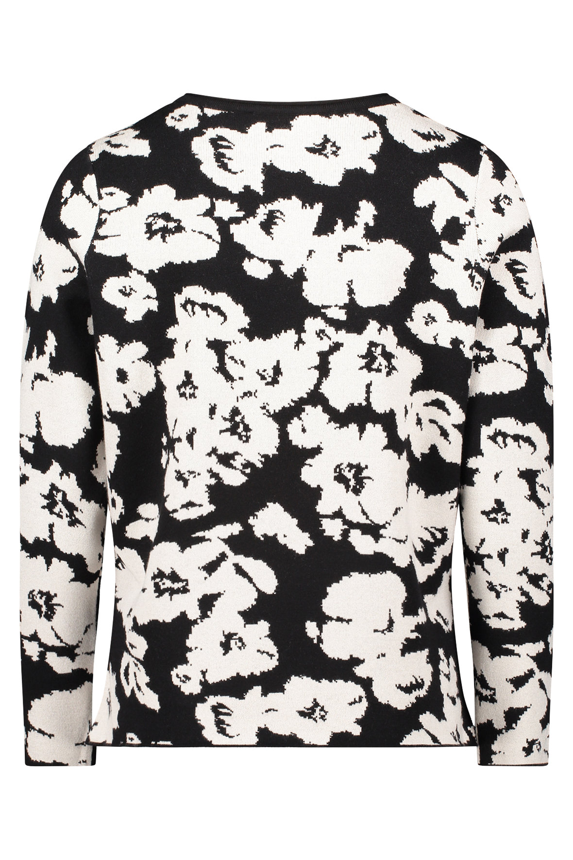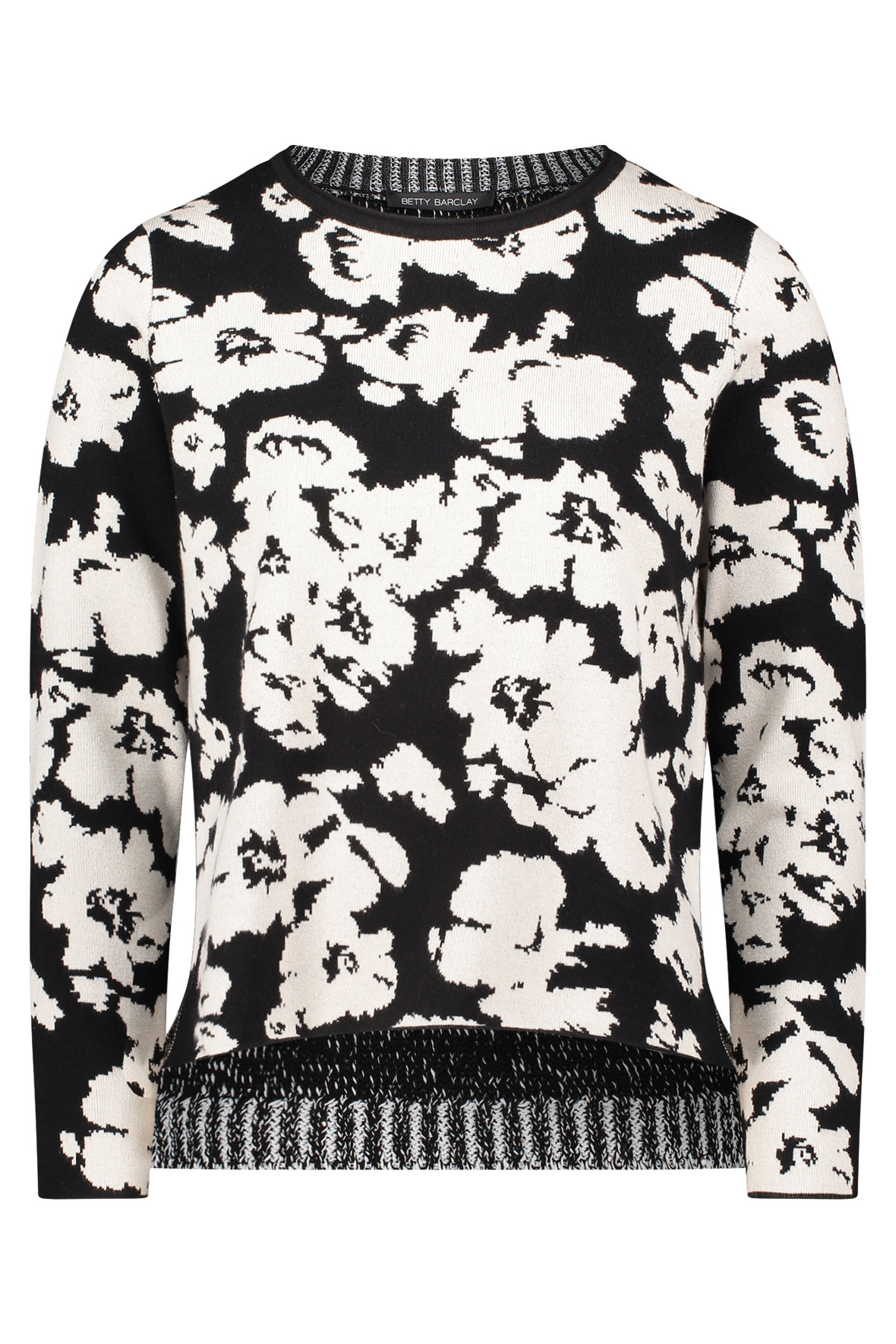 På mit kontor heænger et billede med teksten "Livet er for kort til kedeligt tøj", faktisk skal tøjet helst tale til os, for gør det det udstråler vi en selvsikkerhed. Finstrikken her er bare helt i øjet, den har en lækkerness (ja det er mit eget ord, men du fanger meningen;-) Sød lille rul/ombuk i halsudskæringen der også er ribstrikket. Med abstrakt blomstet motiv der er sort i bunden og cream. Ærmer slutter ved håndled uden manchet. Den har fået mere længde bagtil og har slids i siden. Kvaliteten er en let single face af blandings garner der holder sig, krøller ikke, taber ikke farven og holder faconen, det er faktisk en klassisk Betty Barclay kvalitet der er velafprøvet.