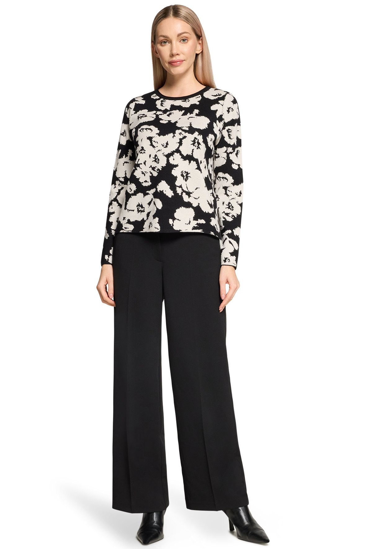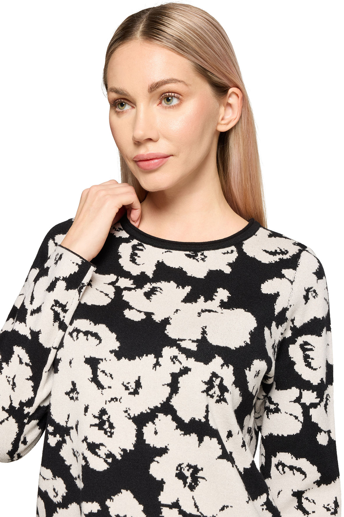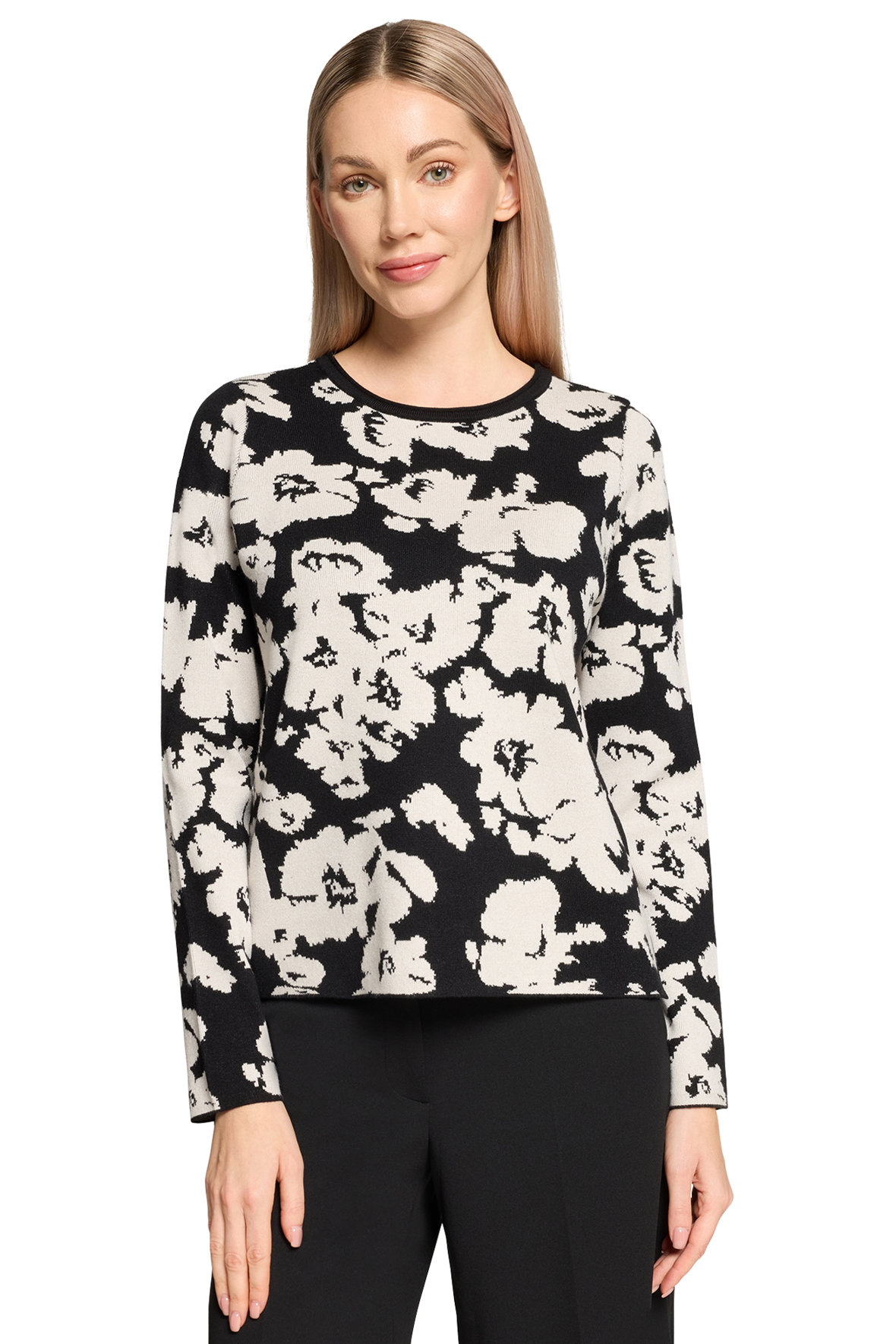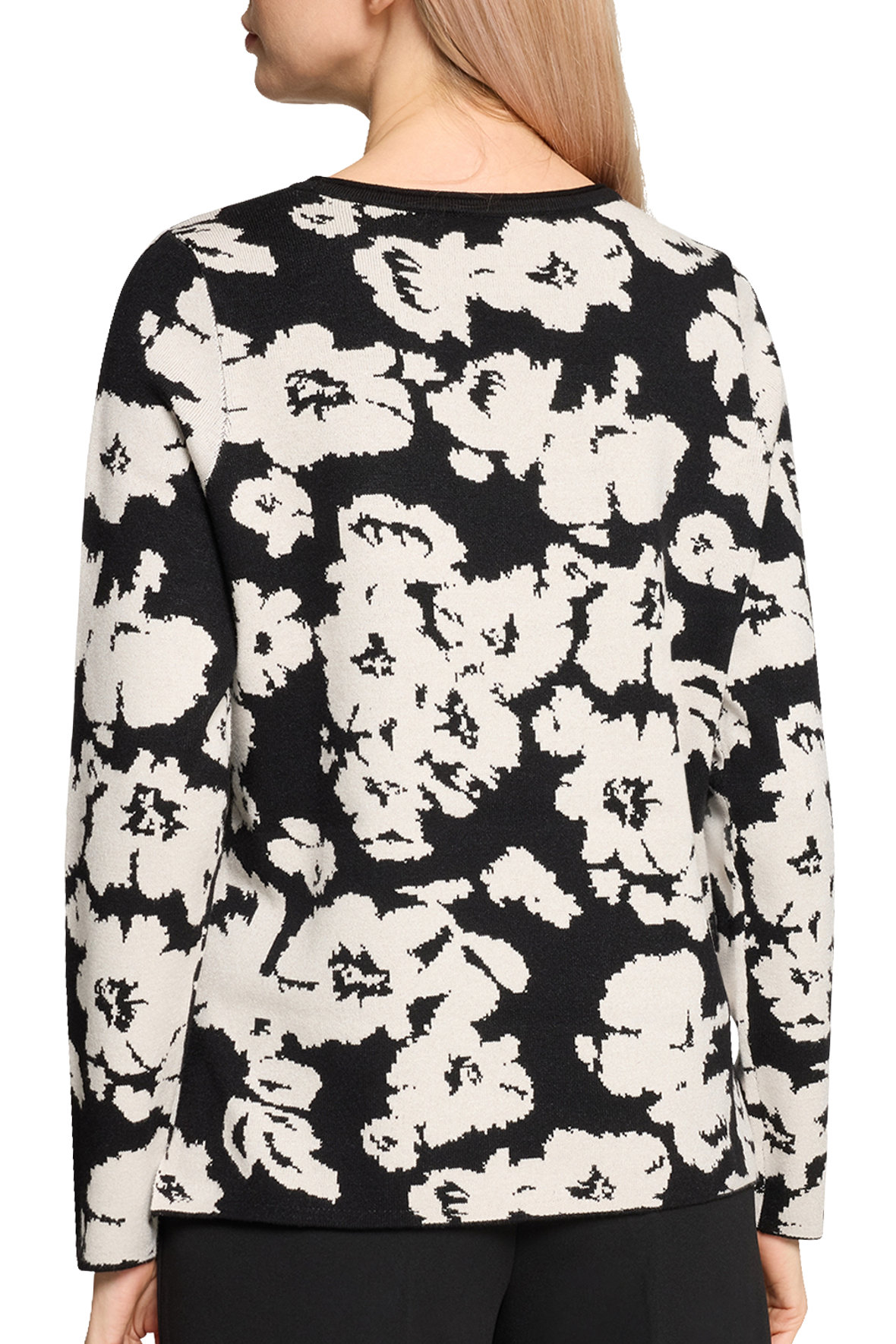 På mit kontor heænger et billede med teksten "Livet er for kort til kedeligt tøj", faktisk skal tøjet helst tale til os, for gør det det udstråler vi en selvsikkerhed. Finstrikken her er bare helt i øjet, den har en lækkerness (ja det er mit eget ord, men du fanger meningen;-) Sød lille rul/ombuk i halsudskæringen der også er ribstrikket. Med abstrakt blomstet motiv der er sort i bunden og cream. Ærmer slutter ved håndled uden manchet. Den har fået mere længde bagtil og har slids i siden. Kvaliteten er en let single face af blandings garner der holder sig, krøller ikke, taber ikke farven og holder faconen, det er faktisk en klassisk Betty Barclay kvalitet der er velafprøvet.