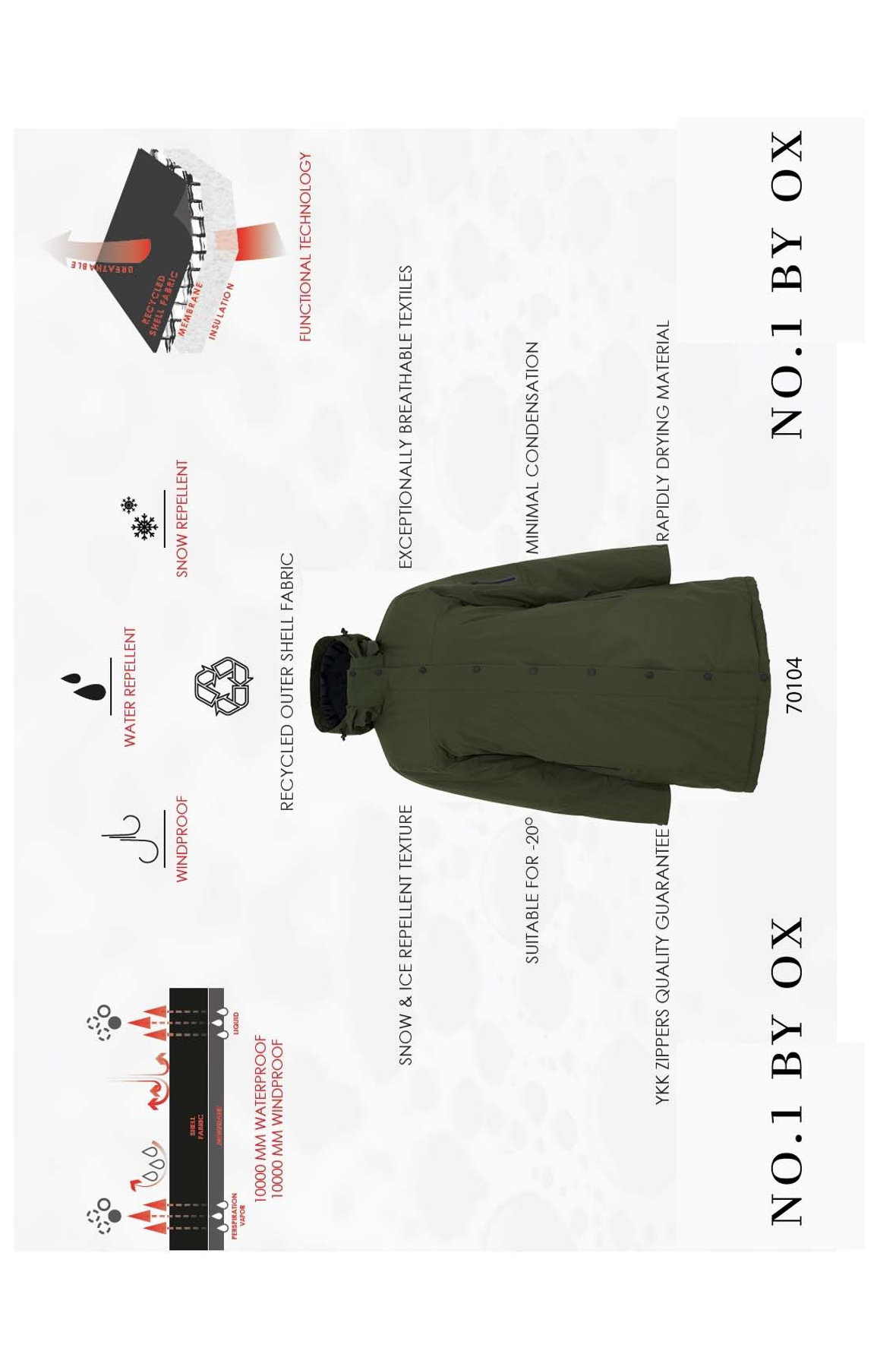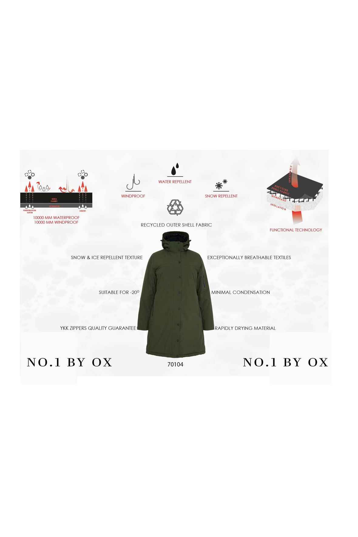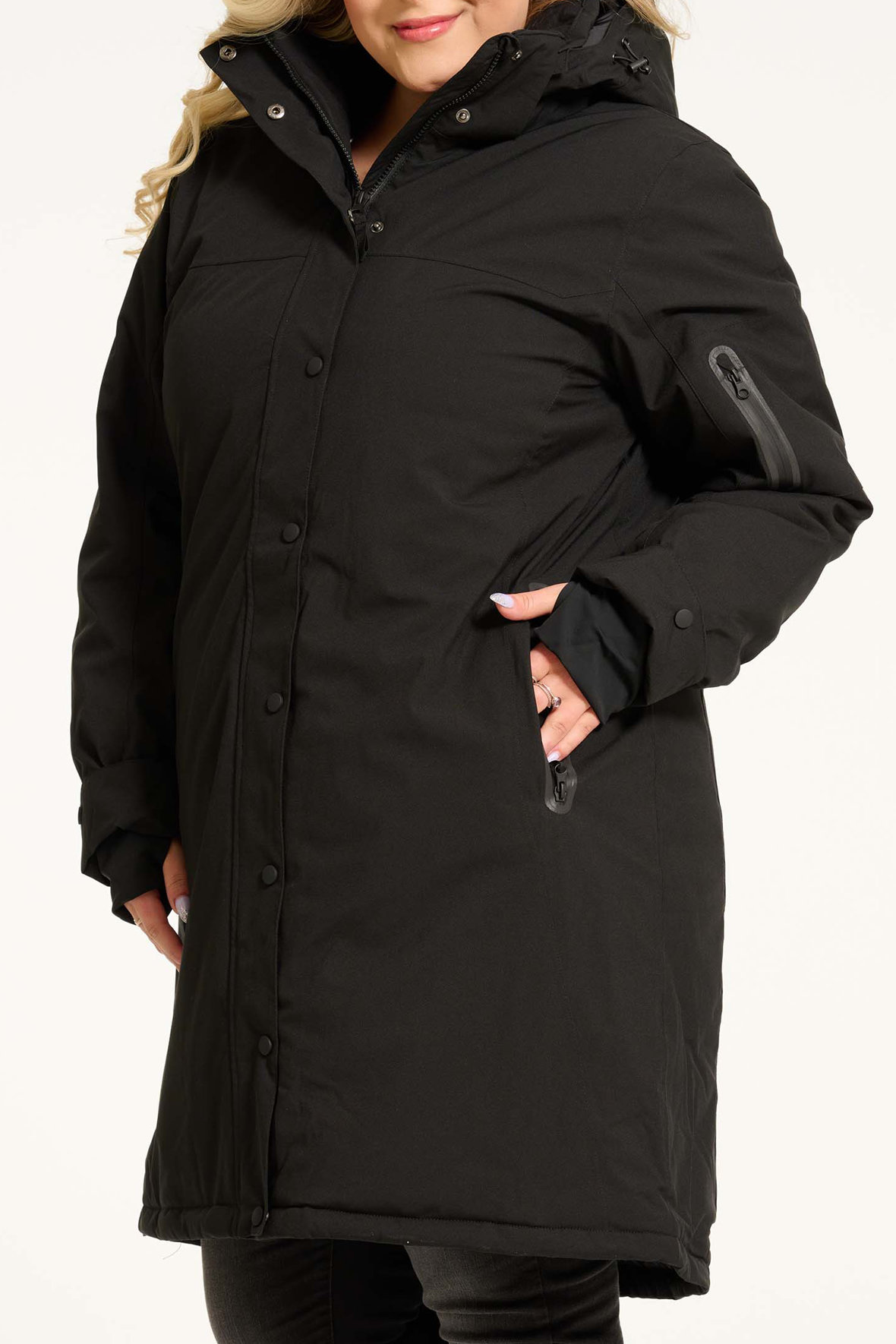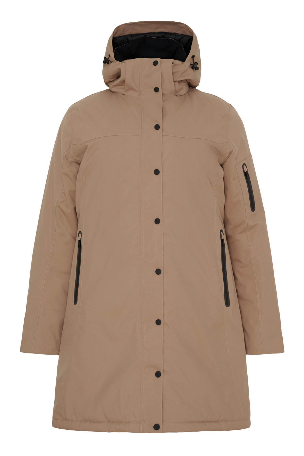 No.1 by OX plus size står bag denne jakke, en dejlig varm og funktionel vinterjakke i et åndbart materiale med multi justerbar og aftagelig hætte der også er varm. Lukkes med to-vejs lynlås og har overslag med sorte trykknapper. 3 udvendige lommer med vandtætte lynlåse som også har fleece foring. Jakken er vindtæt og rigtig vandtæt, den kan bruges ned til -20°C takket være membranernes opbygning med tapede sømme. Der er vindstop med tommelfinger hul for tættere lukning ved ærmerne og udvendigt har den trykknapjustering. Den har reflekser. Skal du opholde dig ude længere tid af gangen samt gøre det uanset vejret vinteren igennem er jakken en lifesaver. I mangel af billeder på model af den i sandfarve, så har jeg sat billeder af den sorte på her.