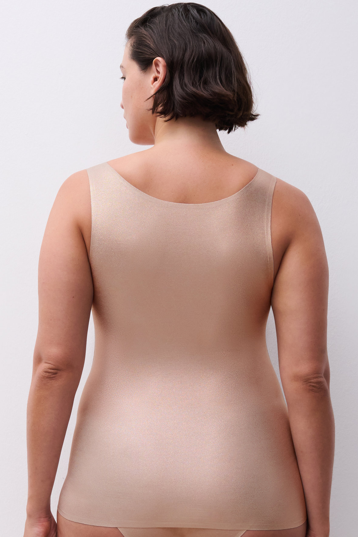 Tætsiddende tank top fra Soft Stretch universet og i onesize der går fra xs-xl altså str. 36 til 44. Seamless kvalitet der ingen sømme har, med limede kanter. Tætasiddende og derfor også god under tøj der sidder til. Med brede stropper. Vaskemærke er printet på. Den er lavet i guld metallic der kan være svært at se på billeder.