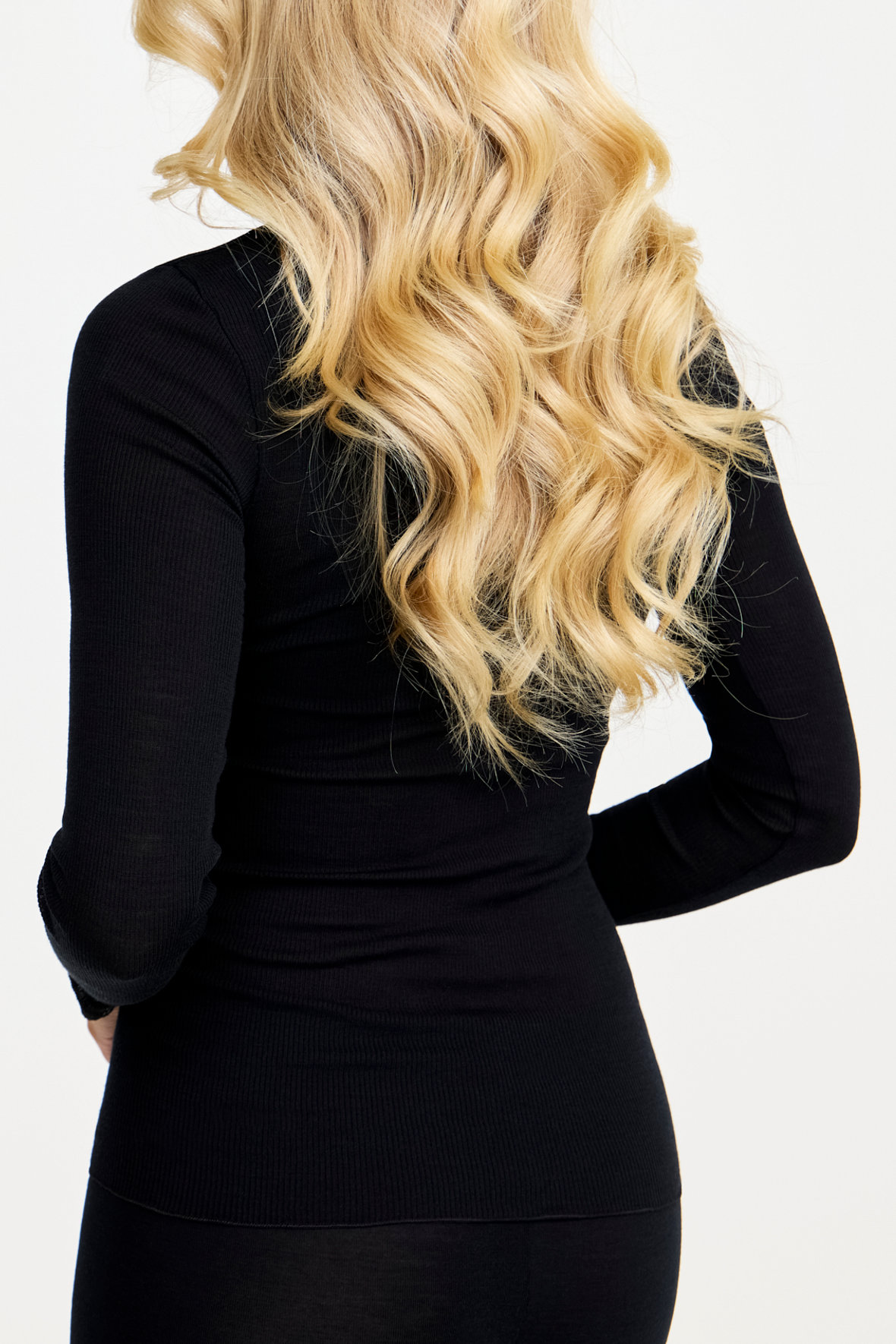 Hvem siger varmt undertøj ikke kan være feminint. Her kigger du på en ekstra fin ribstrikket langærmet undertrøje, den er strikket i en uld og silkeblanding som højner komforten væsentligt frem for en ren uld. Silken bidrager nemlig til at ulden kan strikkes ekstra fint og tyndt uden at du mister egenskaberne med at temperaturregulere samt årndbarheden. Ribstrik strækker sig nemt efter behov. Den er uden sidesømme - rundstrikket. Den har rund halsudskæring med flot transparent blonde, en lille finesse der går igen som afslutning på håndled. Flæsekant ved hofter. Bare en lækker oplevelse der holder i årevis.