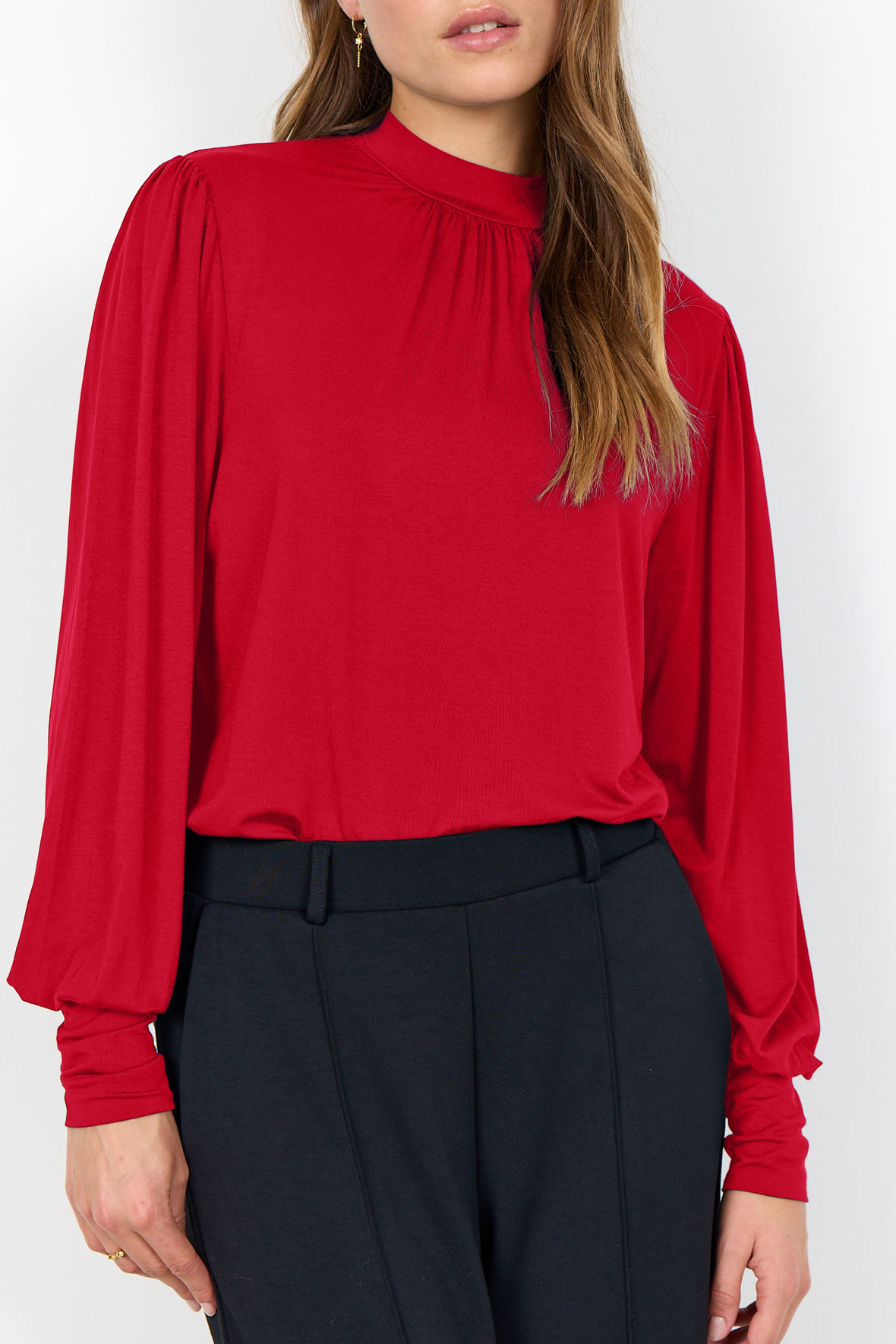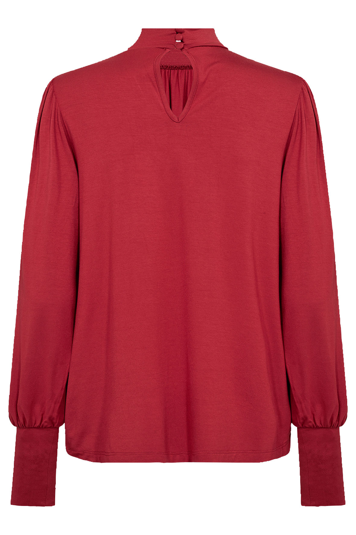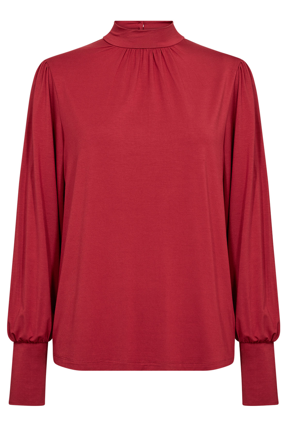 Super lette sc-Marica i jersey blanding er så let at den nemt kan bæres under cardigan eller blazer. Flot rød og med de elegante læg detaljer ved hals/bryst samt på skuldre. Den har turtleneck/mock neck med flot kighul på ryggen med knapper over. Den har lange ærmer der smukt afsluttes med høj elastisk manchet. Ved hofter afsluttes den løst. Smart at den kombinerer det elegante udtryk med så megen komfort.