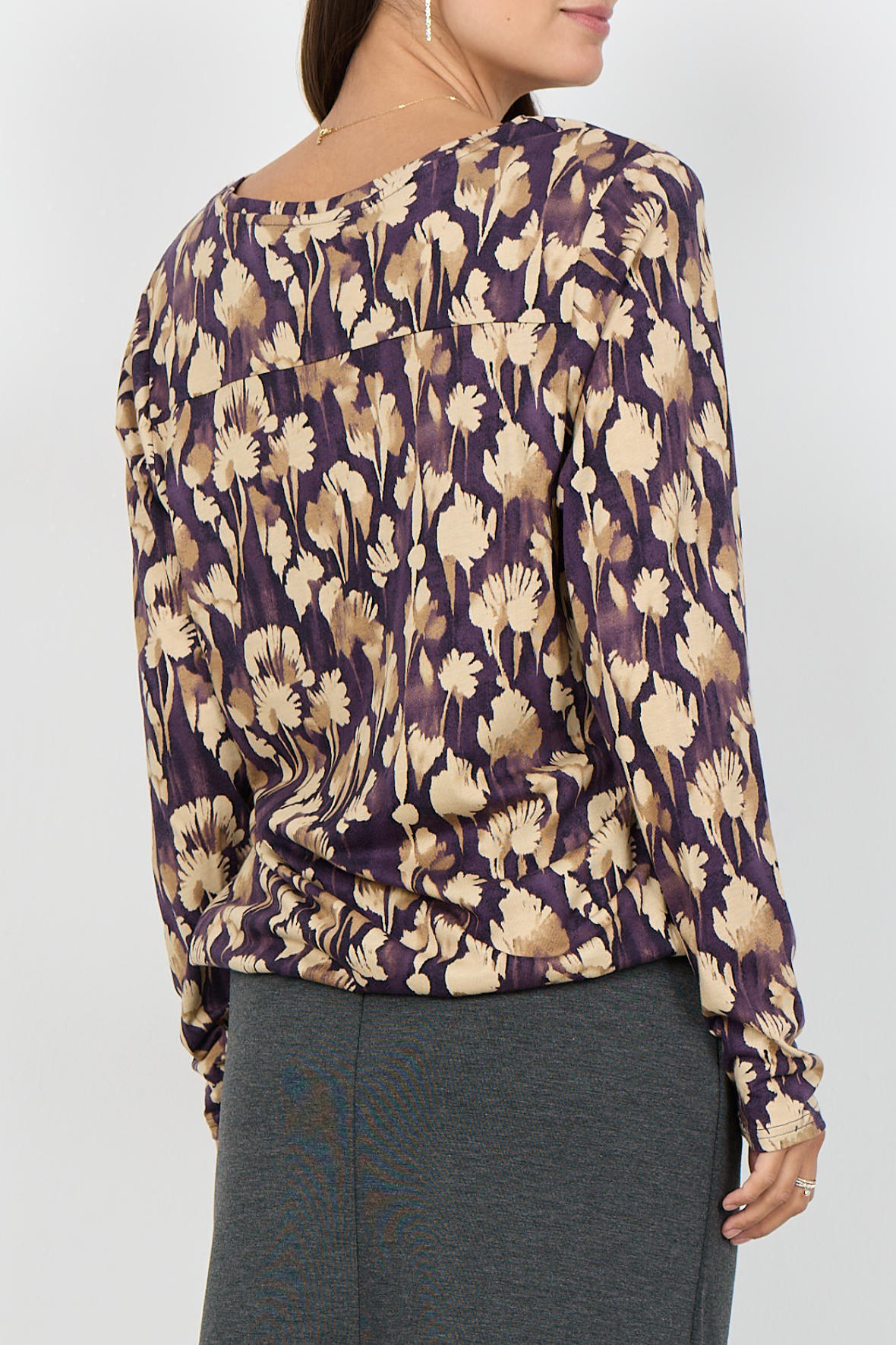 Smuk farverig print t-shirt med blomster motiv. Let kvalitet der er åndbar og blød, fremstillet i en bomuld og viskose blanding. Med rund halsudskæring med åben V-slids. Den har lange ærmer og et løst snit på kroppen hvor den slutter ved hofter med elastik. En af hverdagens små helte, den er nem lige at hoppe i og giver et friskt feminint look.