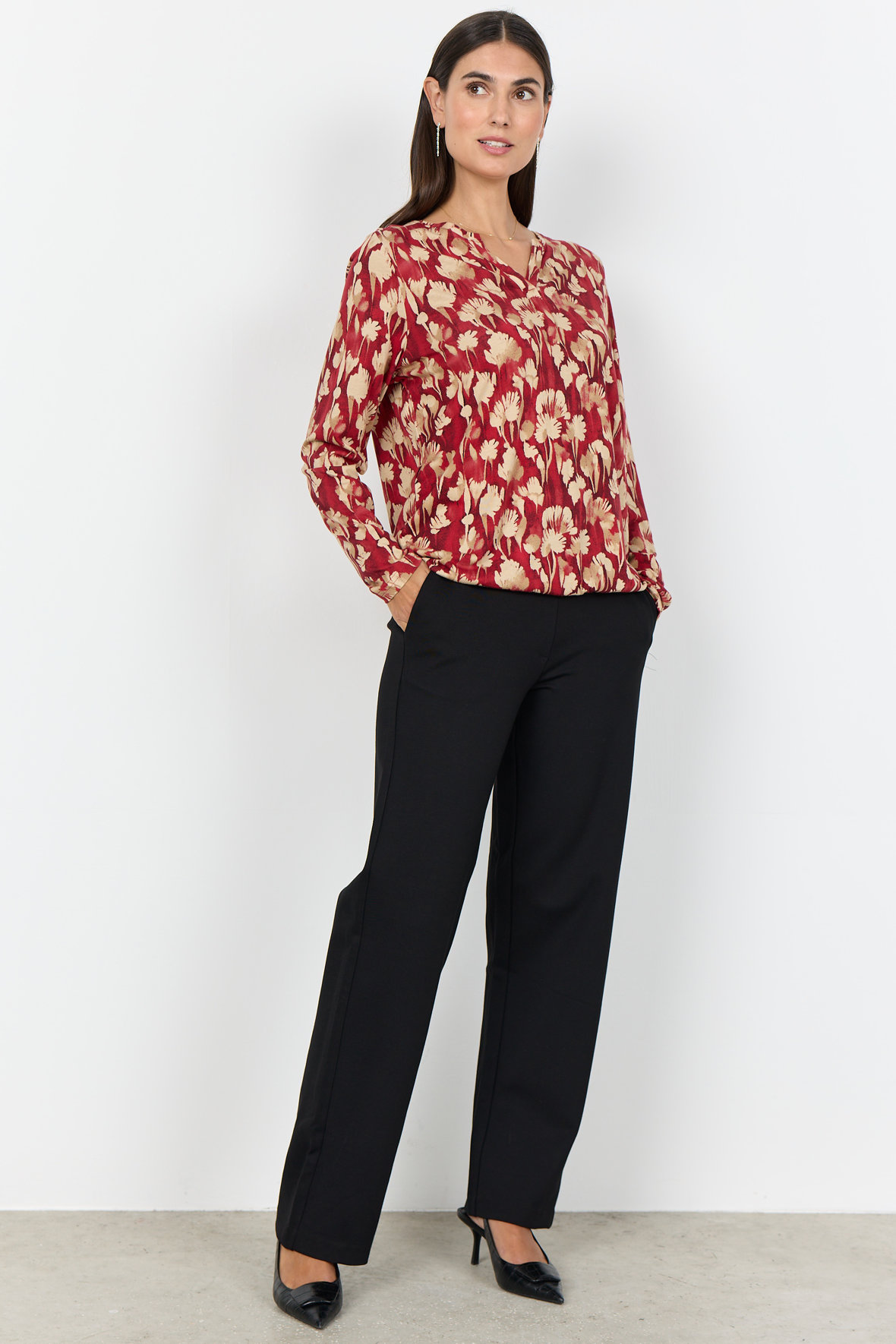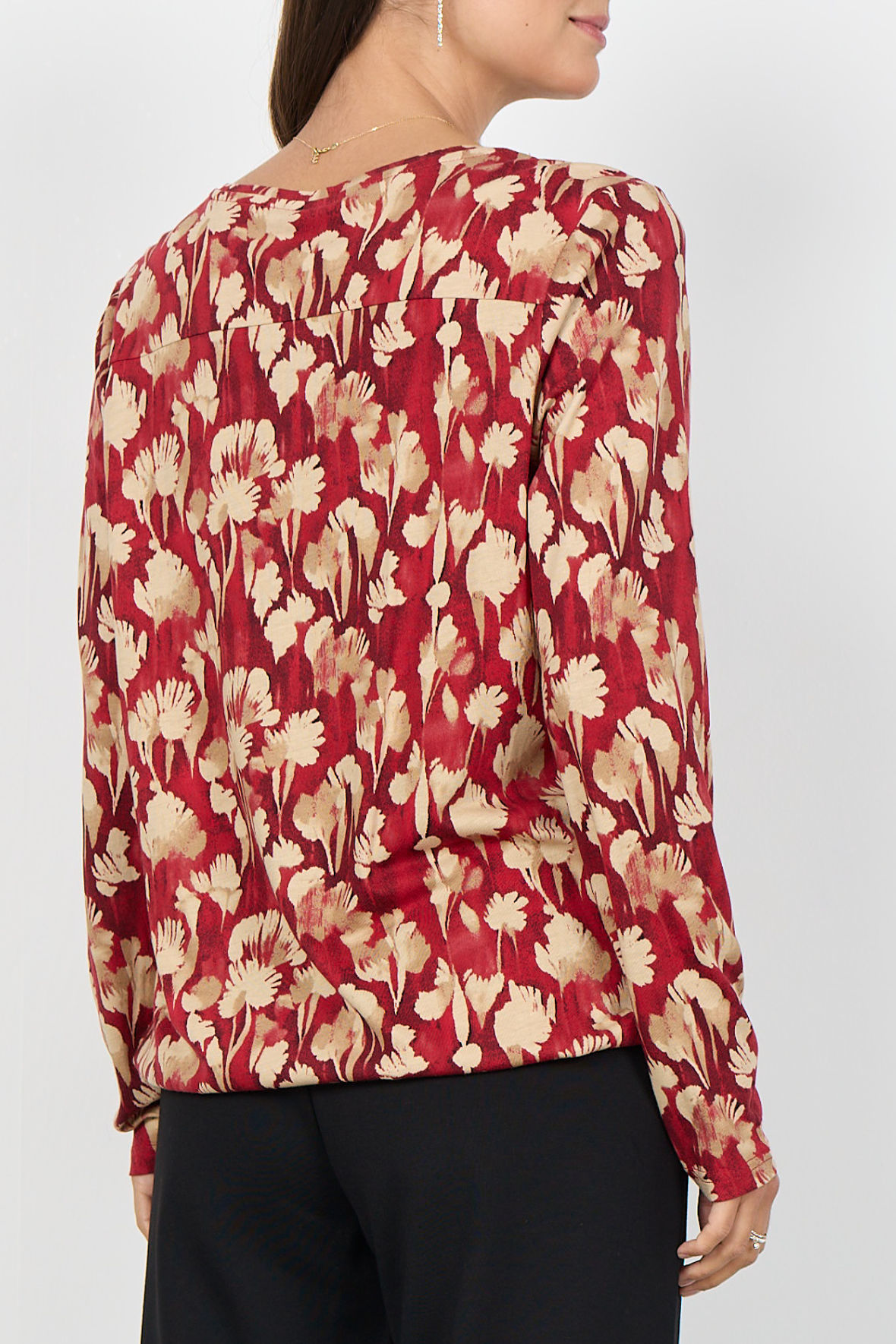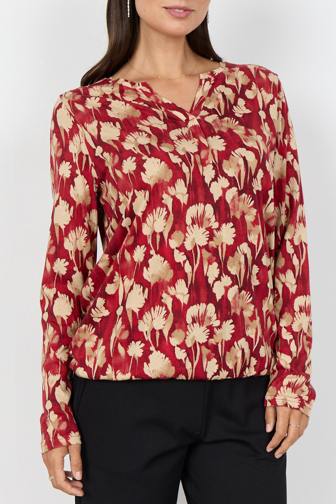 Smuk farverig print t-shirt med blomster motiv. Let kvalitet der er åndbar og blød, fremstillet i en bomuld og viskose blanding. Med rund halsudskæring med åben V-slids. Den har lange ærmer og et løst snit på kroppen hvor den slutter ved hofter med elastik. En af hverdagens små helte, den er nem lige at hoppe i og giver et friskt feminint look.