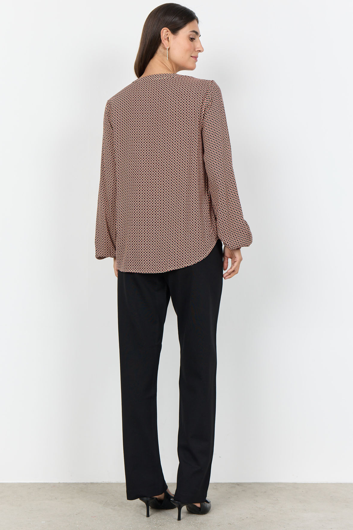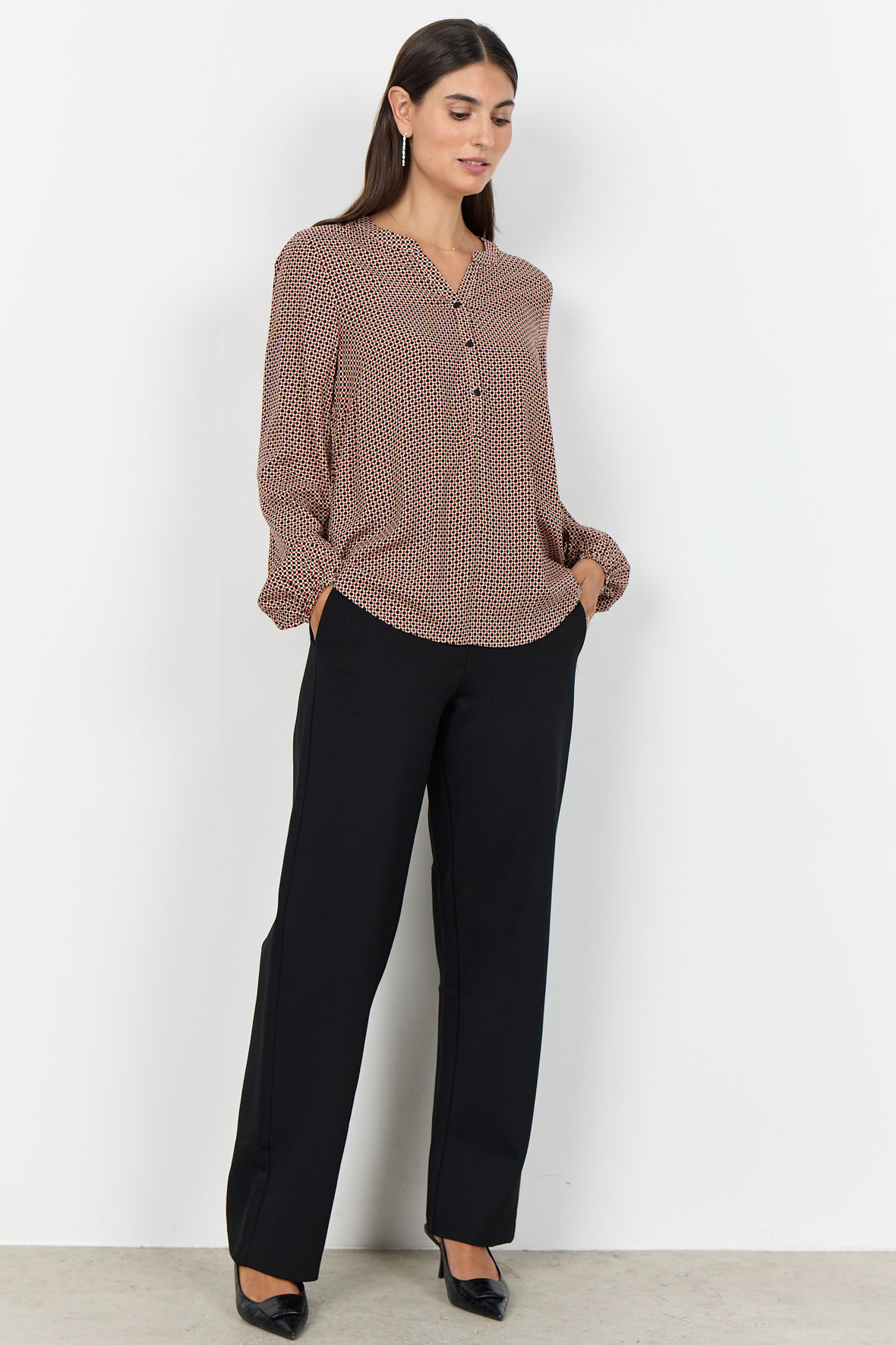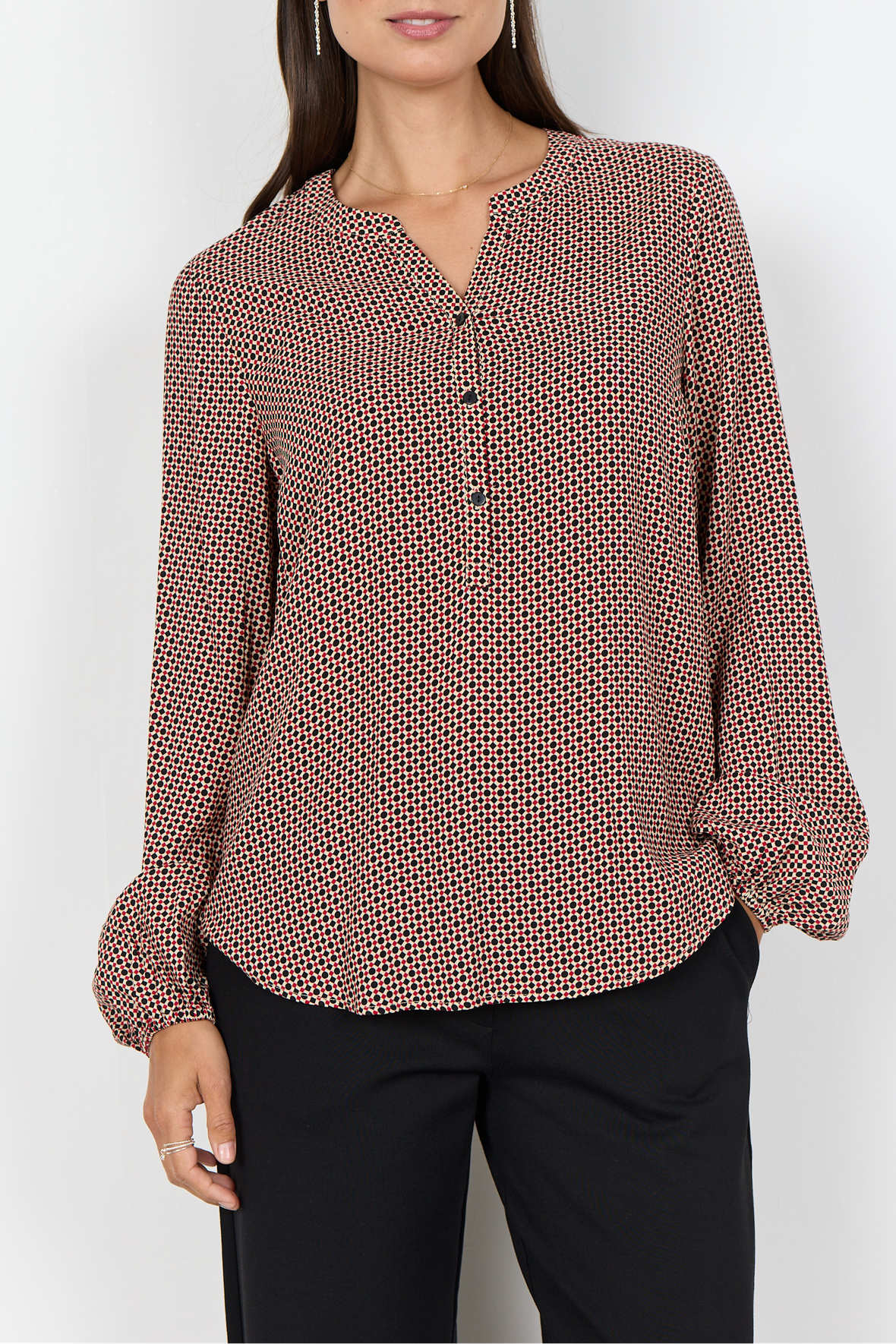 Er du ny i Soya så vil du opdage at de er fantastiske til de her lette styles der ser så godt ud og som ikke koster alverden. Med lækker pasform og i ordentlig kvalitet. Sc-Anita er lavet som printbluse med grafisk print, hun har rund halslinje med åben V-slids der går ned i knapstolpe der stopper midtvejs. Ærmer har volumen og slutter ved håndled med smal elastik. Den slutter ved hofter med at være helt løs. Fremstillet i en helt let EcoVero viskose.