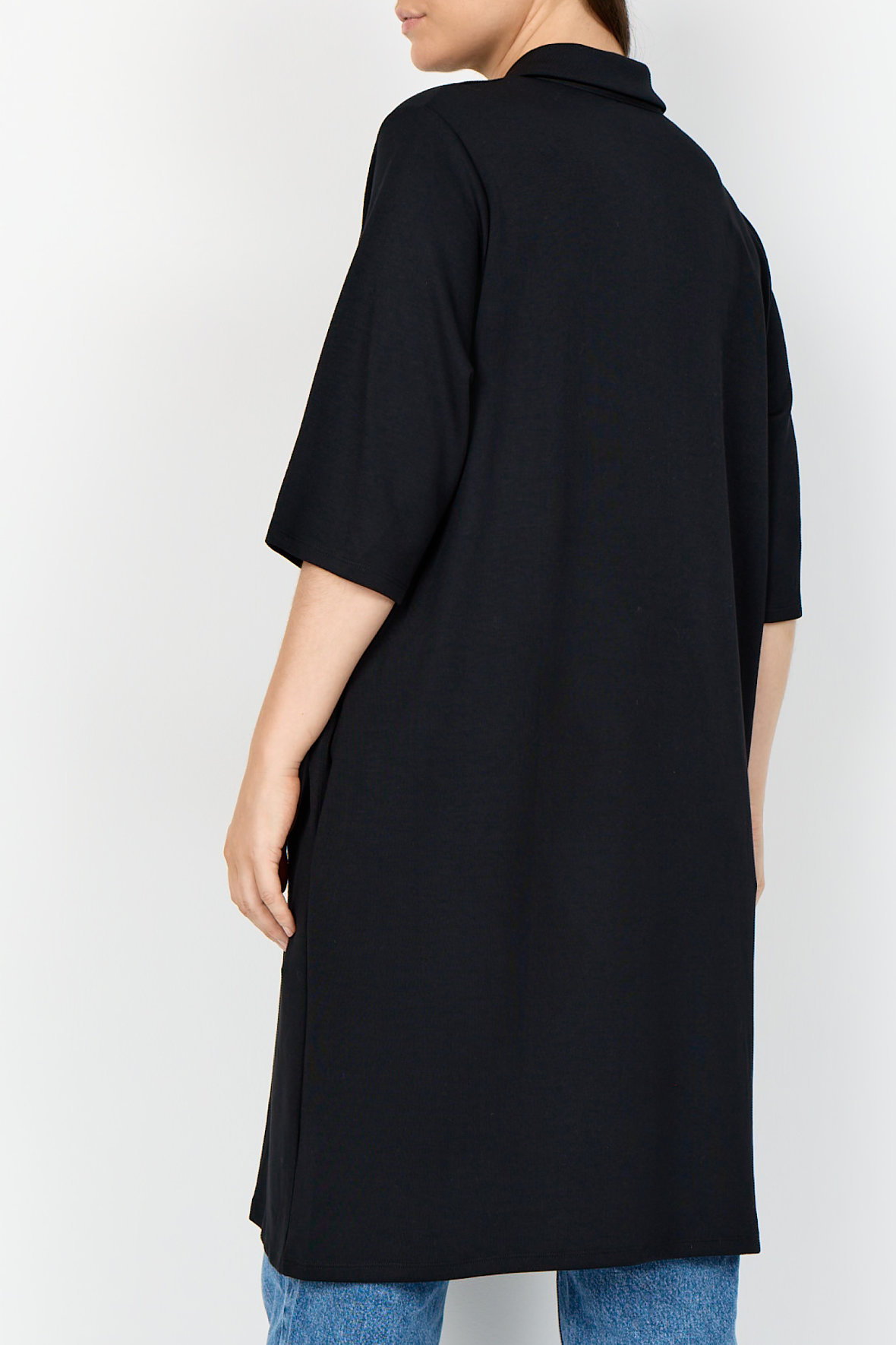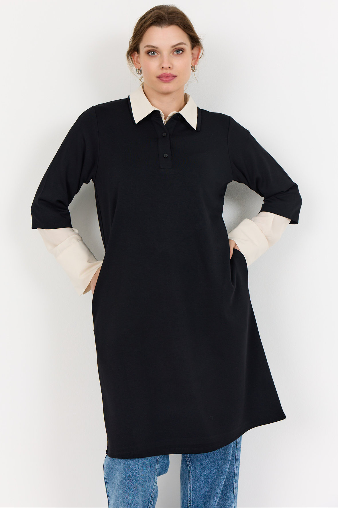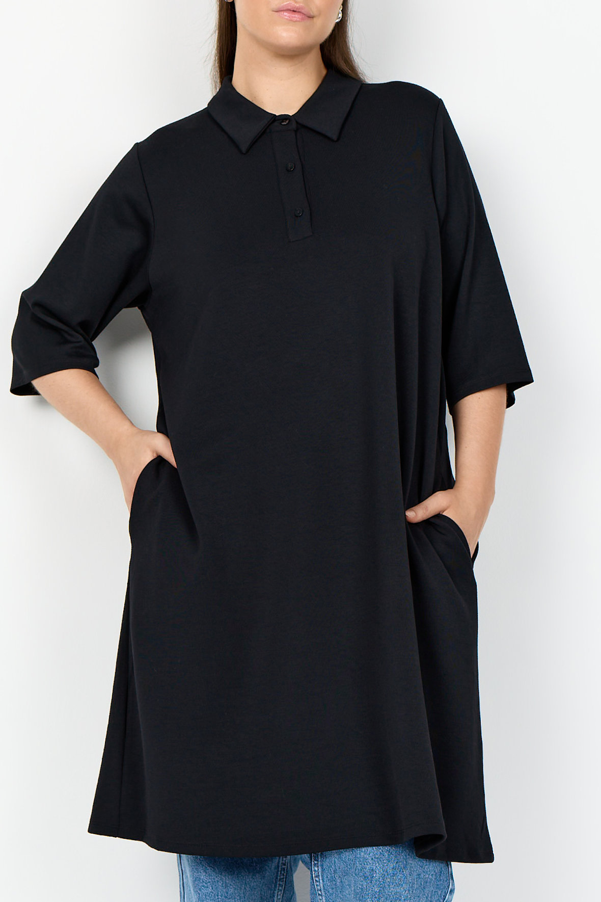 Wa-Sabina 32 kjole i blød komfortabel sweaterkvalitet med god plads. Der er polokrave med kort knapstoilpe og tone i tone knapper. Ærmer er halve og længere nede har den lommer i sidesømmen. Den har længde til til lige over knæ. Metervaren er rigtig lækker og forandrer sig ikke, krøller heller ikke.