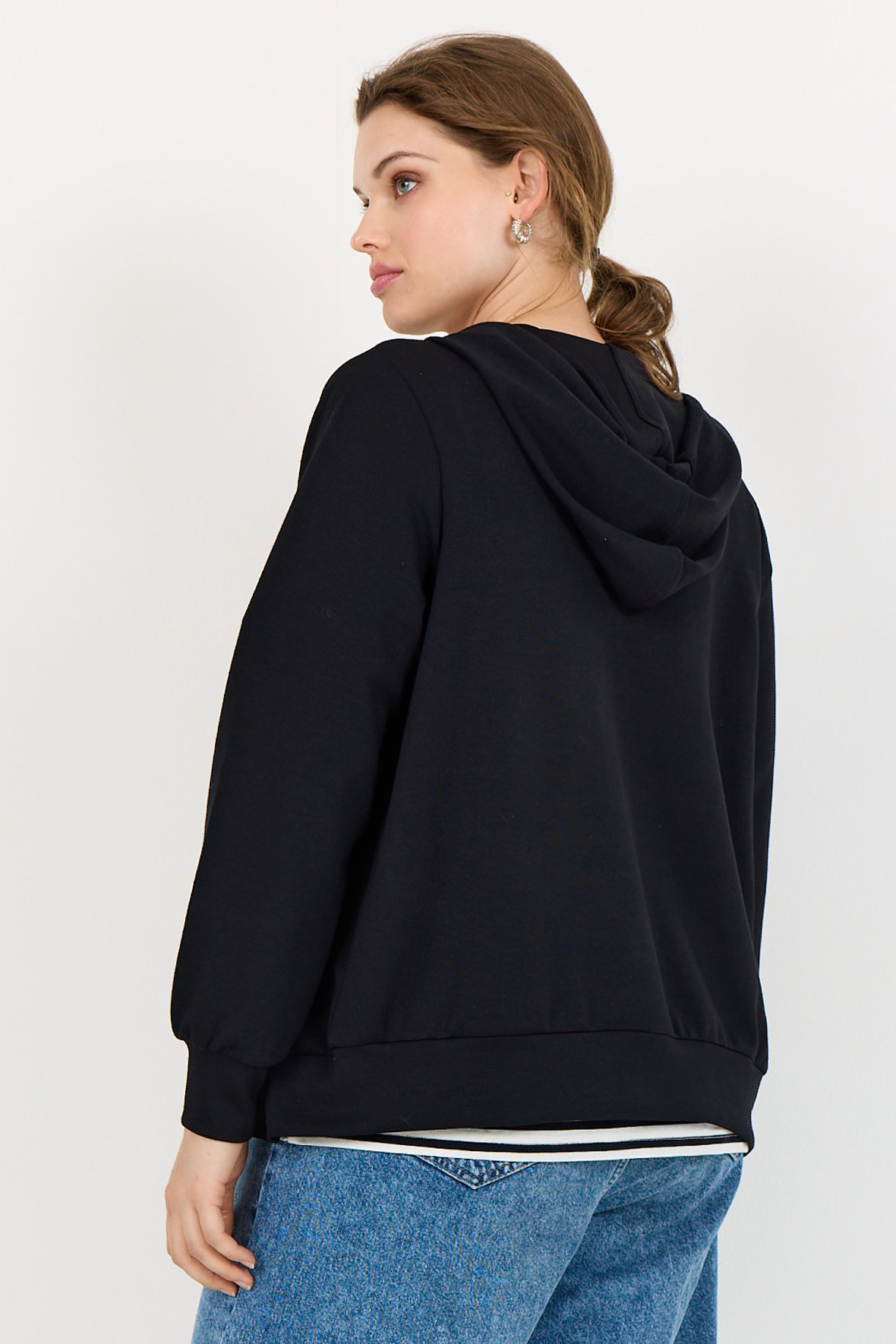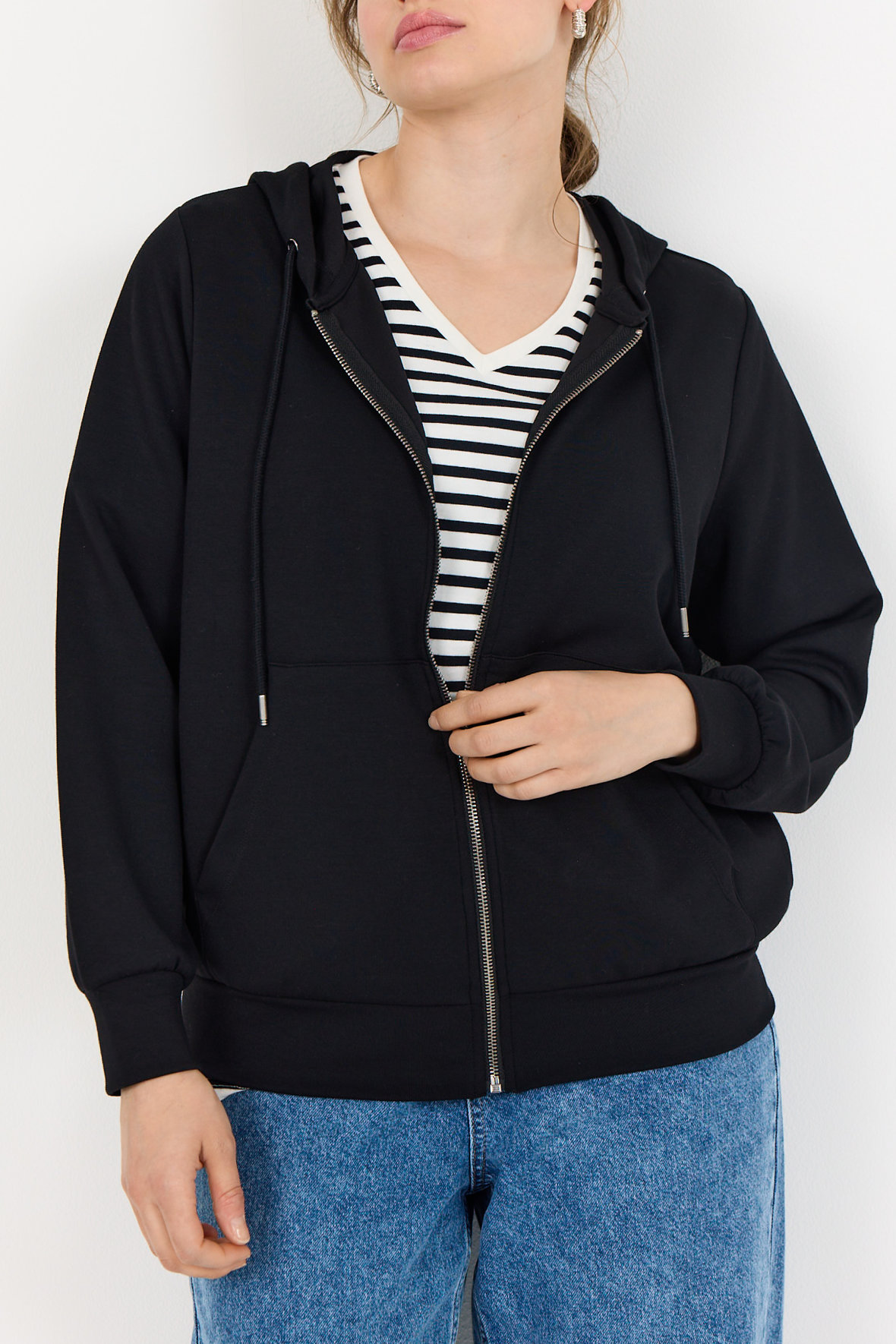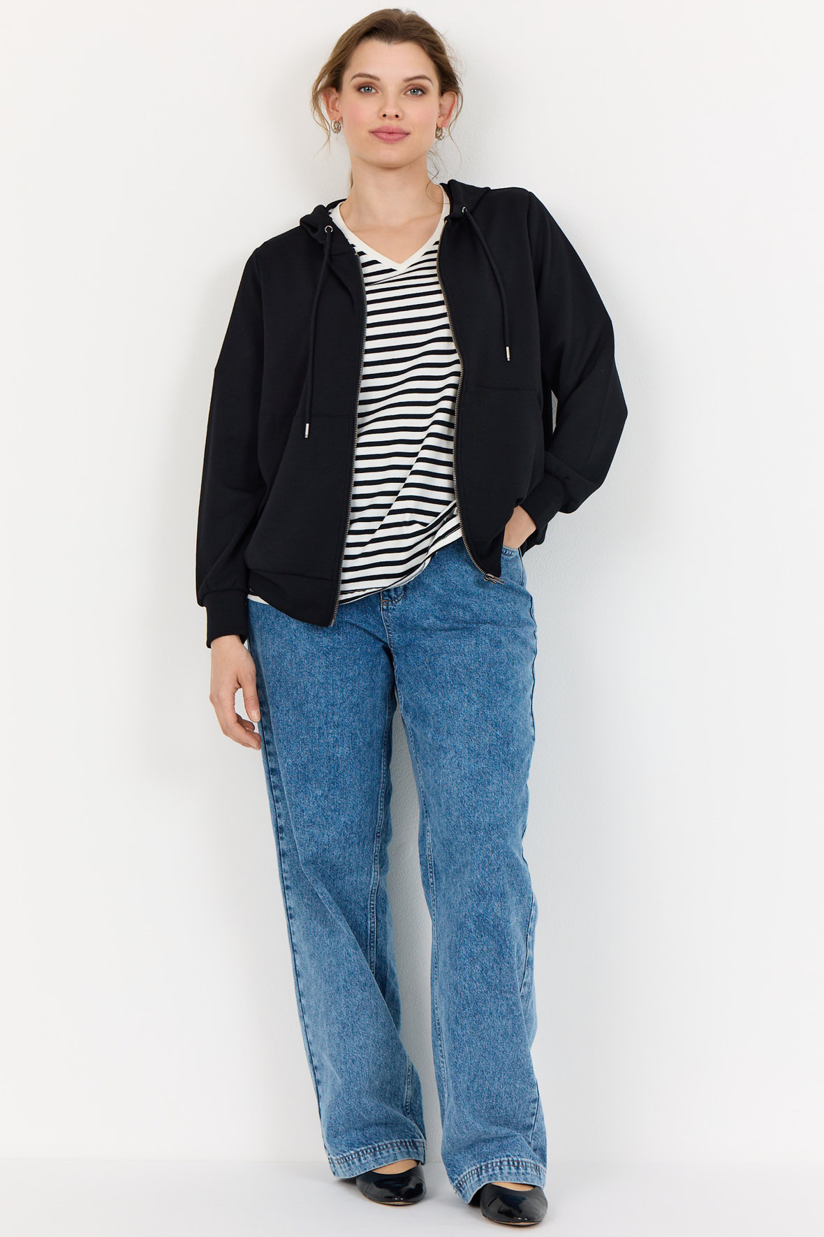Casual hoodie fra Wasabi i sweaterkvalitet. Wa-Sabina er blød og med lynlås samt hætte med snører og fortil er der lommer. Ærmer er lange og slutter med elastisk bred manchet ved håndled, samme går igen ved hofter.