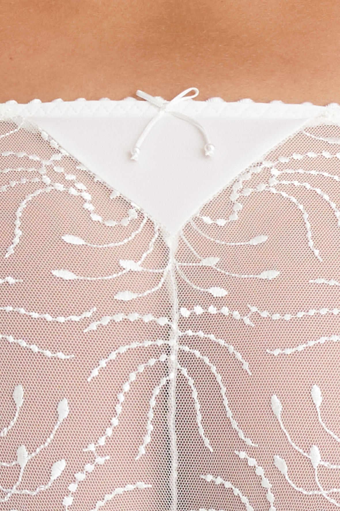 Marie Jo Jane Italien Brief i den altid klassiske basis farve - en string trusse med smukt delikat blankt broderi på fin transparent mesh ved ben skæringer der giver den et let og luftigt udseende. Ensfarvet midtfor for og bag i blankt stof der smyger sig om huden. Bomulds kile i bunden.