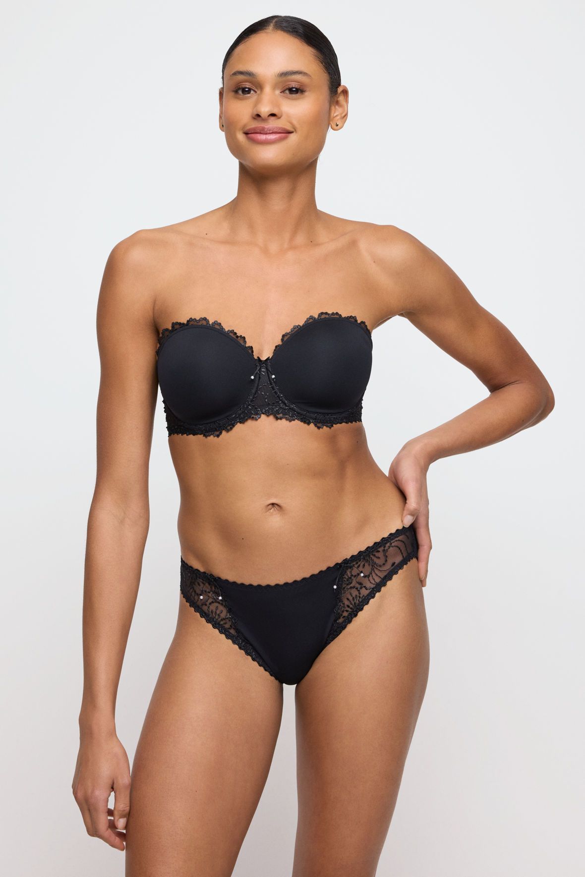 Marie Jo Jane Rio Briefs lyder eksotisk og er altså en tai trusse med lav skæring i livet og høje ben skæringer med næsten fuld dækning af numsen. Den er dækket helt for og bag og har bomulds kile i bunden, men så giver den også fuld gas på sidestykkerne der er med transparent mesh og broderet blonde i flere dusch toner. Den har et meget elegant udtryk.
