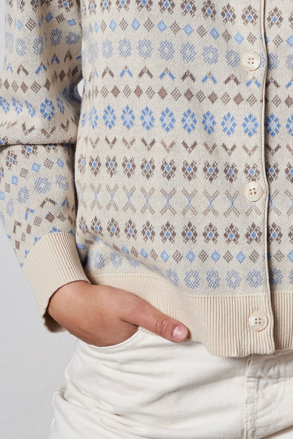 Så er du landet på LiClara der er en mønstret bomulds strik cardigan. En lidt mere hverdagsagtig kvalitet som er robust og holdbar. Men stadig meget dekorativ og hyggelig. Den har rund halslinje der går lidt mere tæt på end de andre strik, det er så at sige skridtet lige inden den får turtleneck. Den har knapstolpe med tone i tone knapper. Alle kanter er udstyret med ribstrik. Den er tidløs og kan altså bruges året rundt.