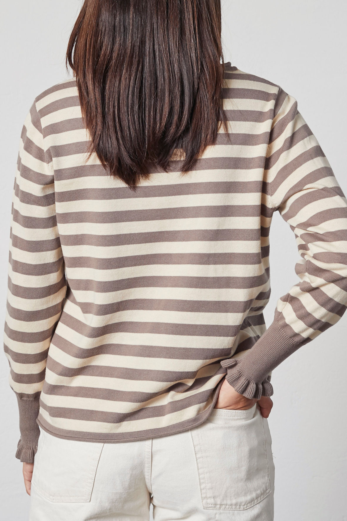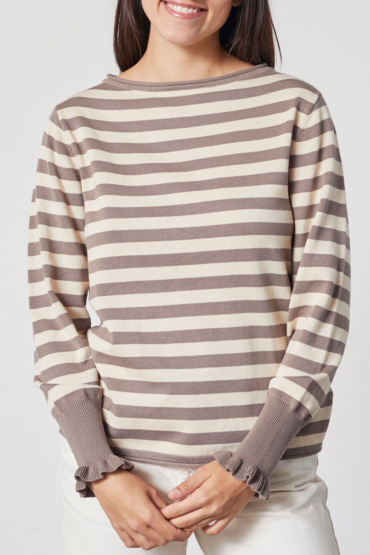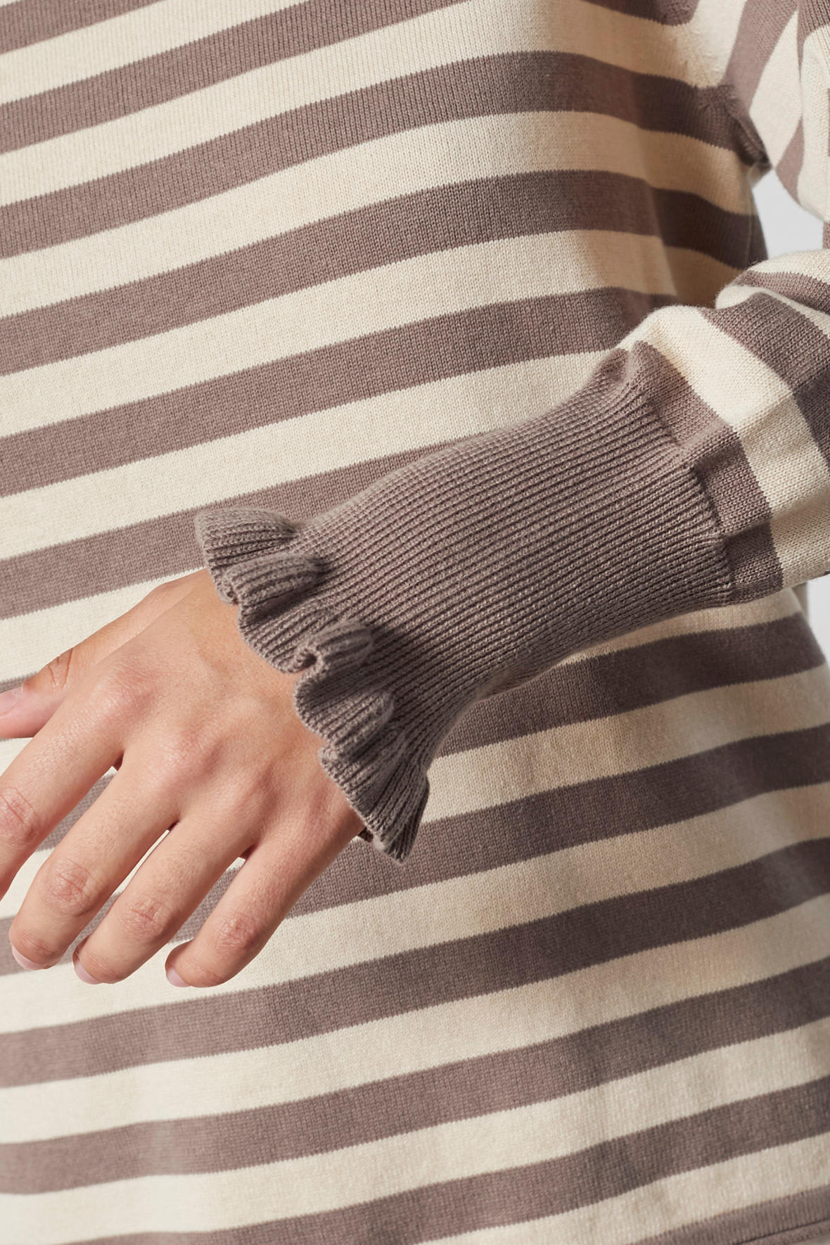 En smuk og tidløs strikket pullover fra danske Lind. LiStine er udstyret med striber i en flot taupe/sandfarve, den har fået lidt mere vidde i udskæringen samt har lille rul. Ærmer har den smukkeste afslutning bred ekstrra højde på manchetten i den mørke farve og har også flæse, det ser godt ud. Det lille ombuk fra kraven går igen ved hofter. Pasformen er straight som byder på en flot profil.