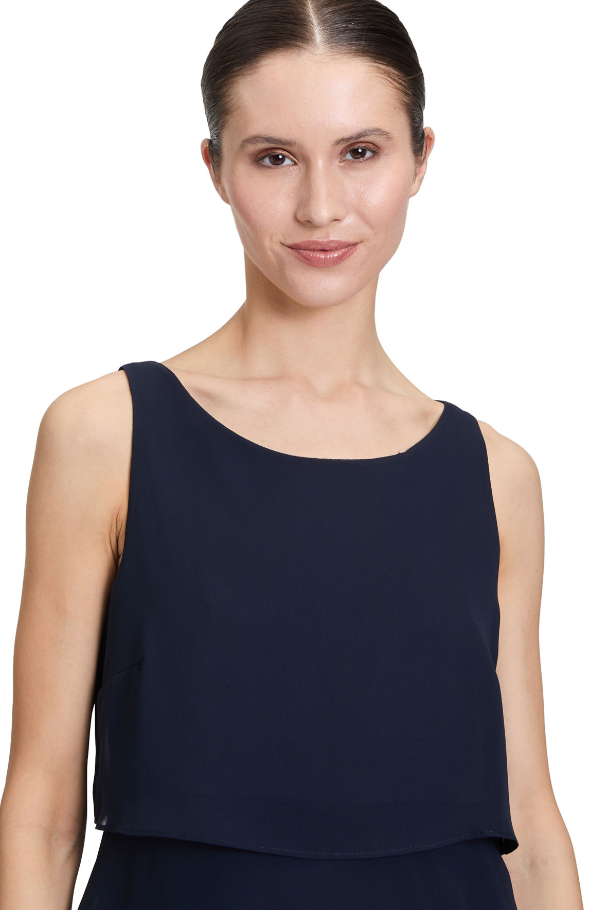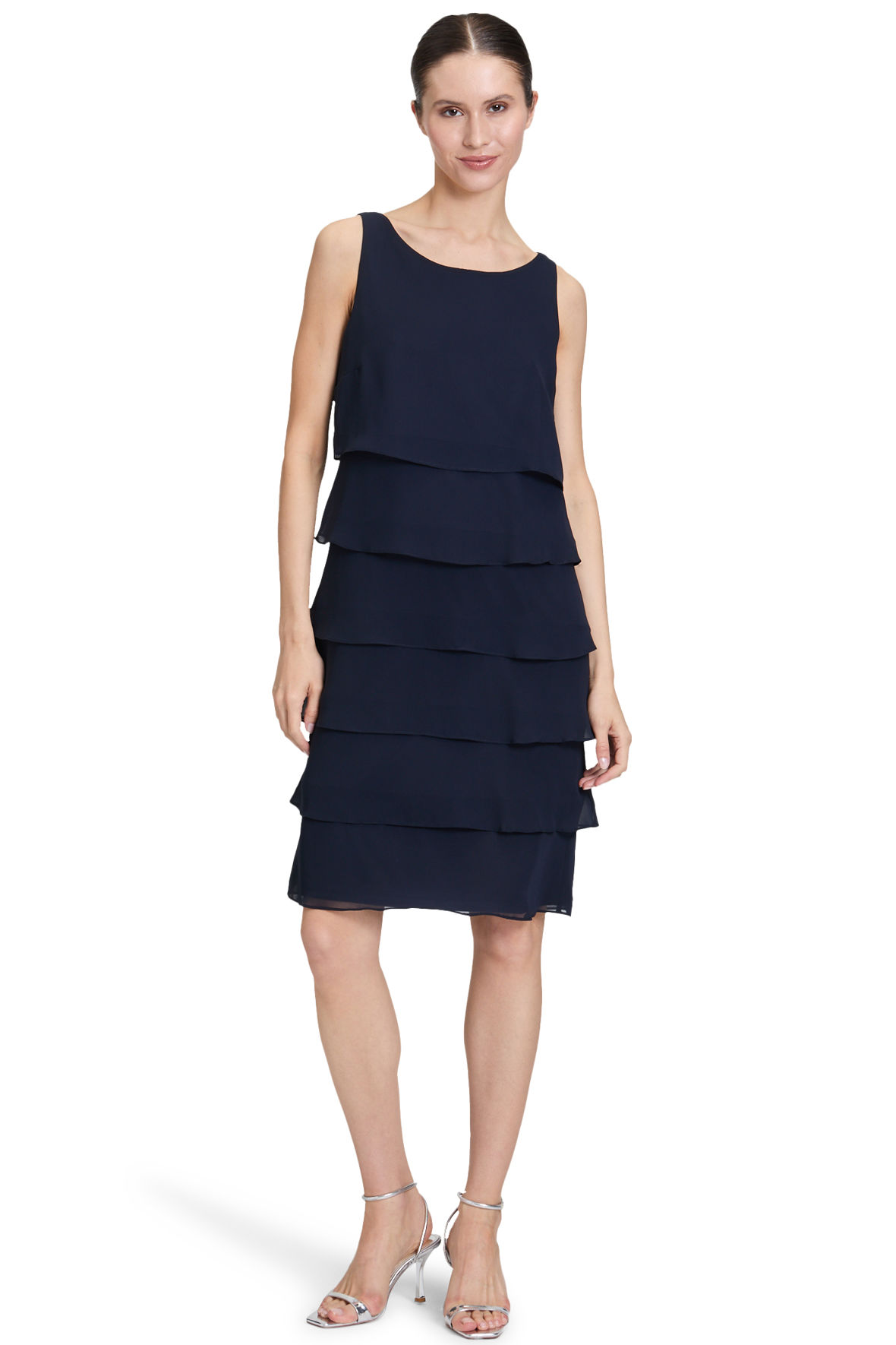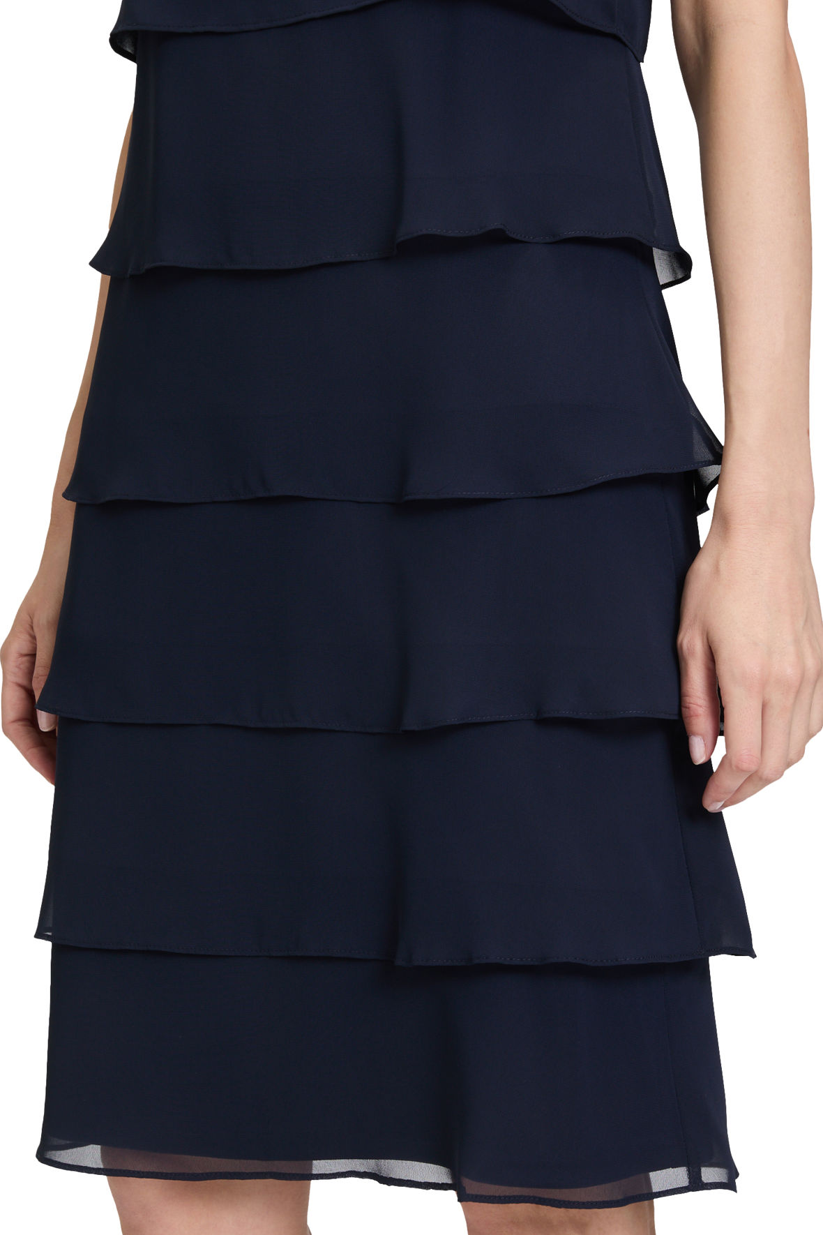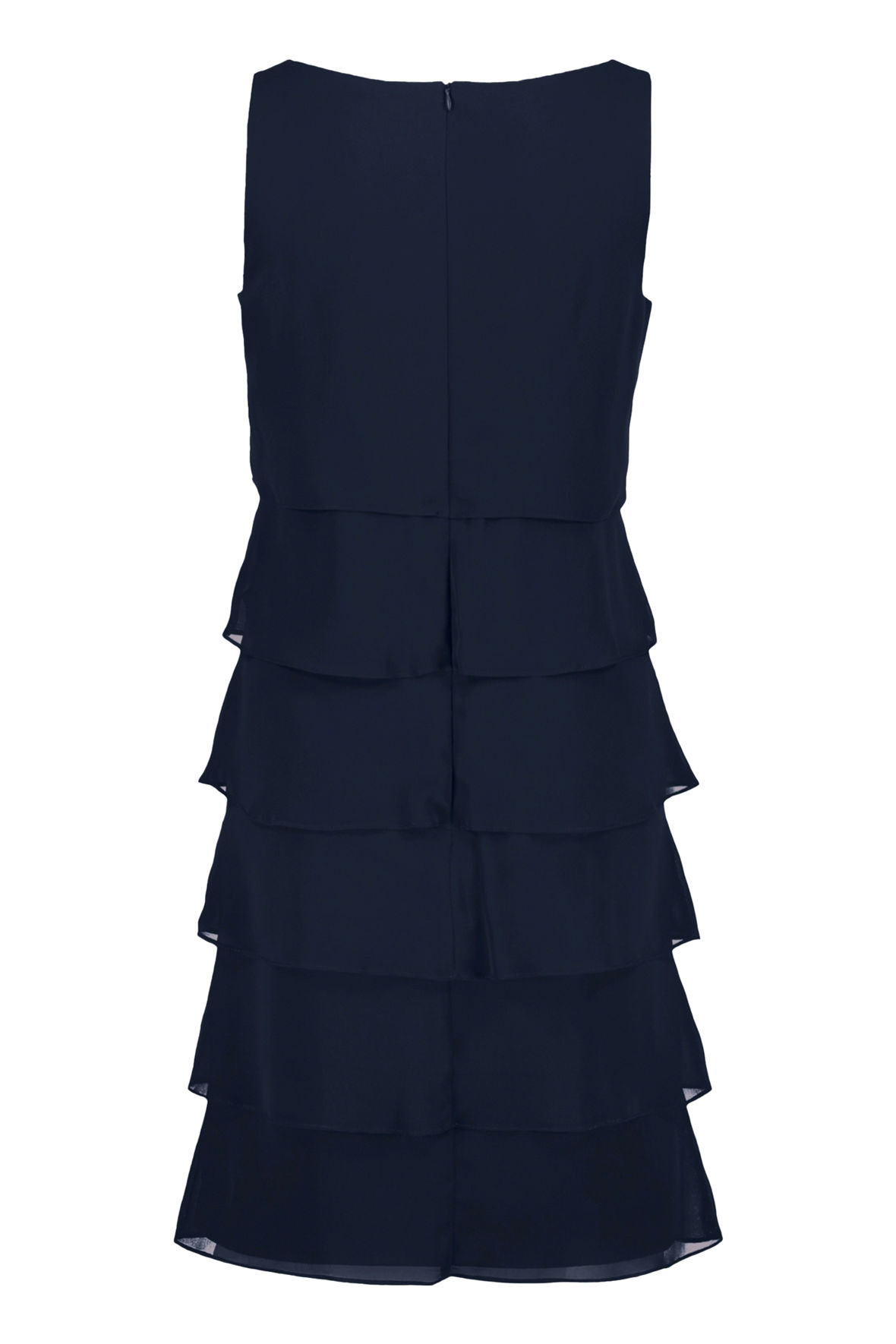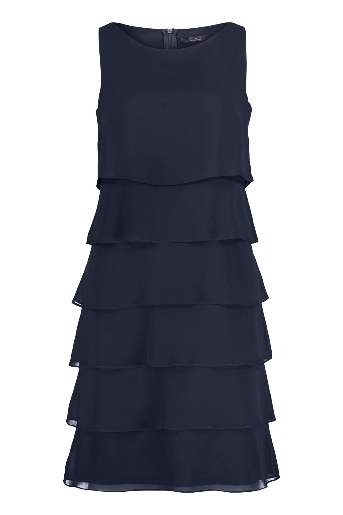 Strop kjole der er så festlig at se på. Helt klassisk for Vera Mont en flot gennemarbejdet flæsekjole der er lavet med lag på lag snit, det gør den både flot og festlig, den er også hævet over tid på året når vi kigger på farve og snit. Den har indsnit ved barm som giver den rette udgangspunkt. Halslinjen er rund uden at blive for afslørende. Kjolen er med længde til knæ. Den har skjult lynlås i ryggen. Suppler evt med en lille bolero eller jakke.