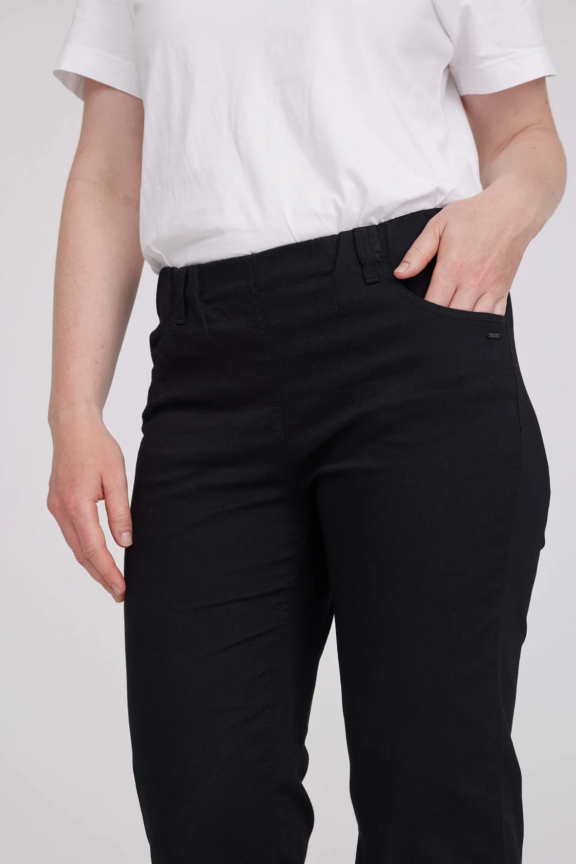 Tracy fra Laurie er med straight fit, altså lige ben. Her får du lidt mere plads fra lår og ned. De har elastisk linning, og er med forlommer samt bæltestropper. De er uden knap samt lynlås, det er to punkter der er med til at give et slankere udtryk ved maven når der ikke er en gylp der buler ud. Der er lodrette indsnit på numsen som får buksen til at sidde flot til. En afslappet behagelig pasform er garanteret. Det er en gennemfarvet sort lærredsbuks med sorte stikninger. Øko-Tex certificeret.