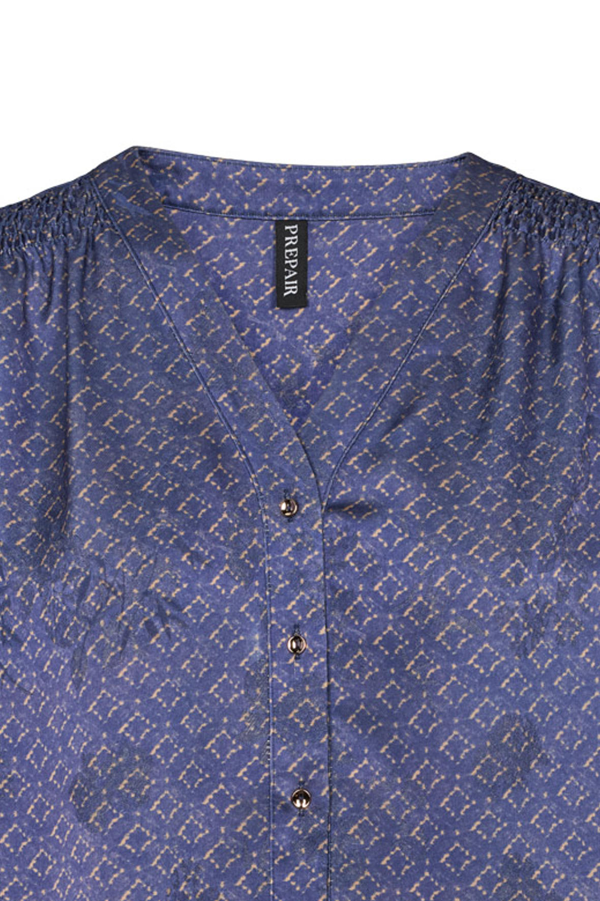 Denise print skjortebluse i en lækker chiffon polyester satin som giver den et elagant udtryk, med flot mættet farve der er shiny og helt let. Modelsnittet er løst og har du overvejelser omkring om du er den ene eller anden str. så tag rolig den mindste. Den har V-udskæring der ender i knapstolpe med guldknapper. Ved skulder har den smok elastik der giver lidt liv med læg og puf, ærmer har volumen samt smock ved håndled. Ryggen er helt glat. Den er kort i overkroppen og helt løs.