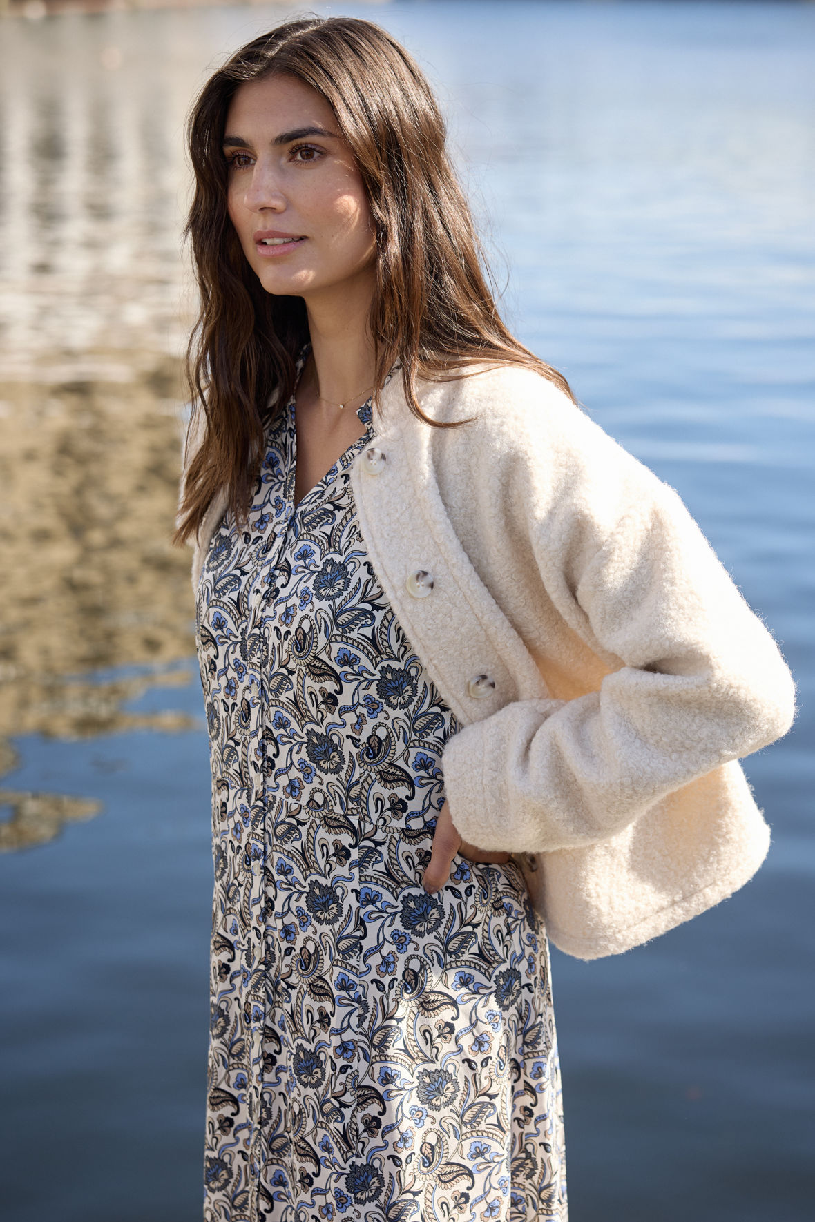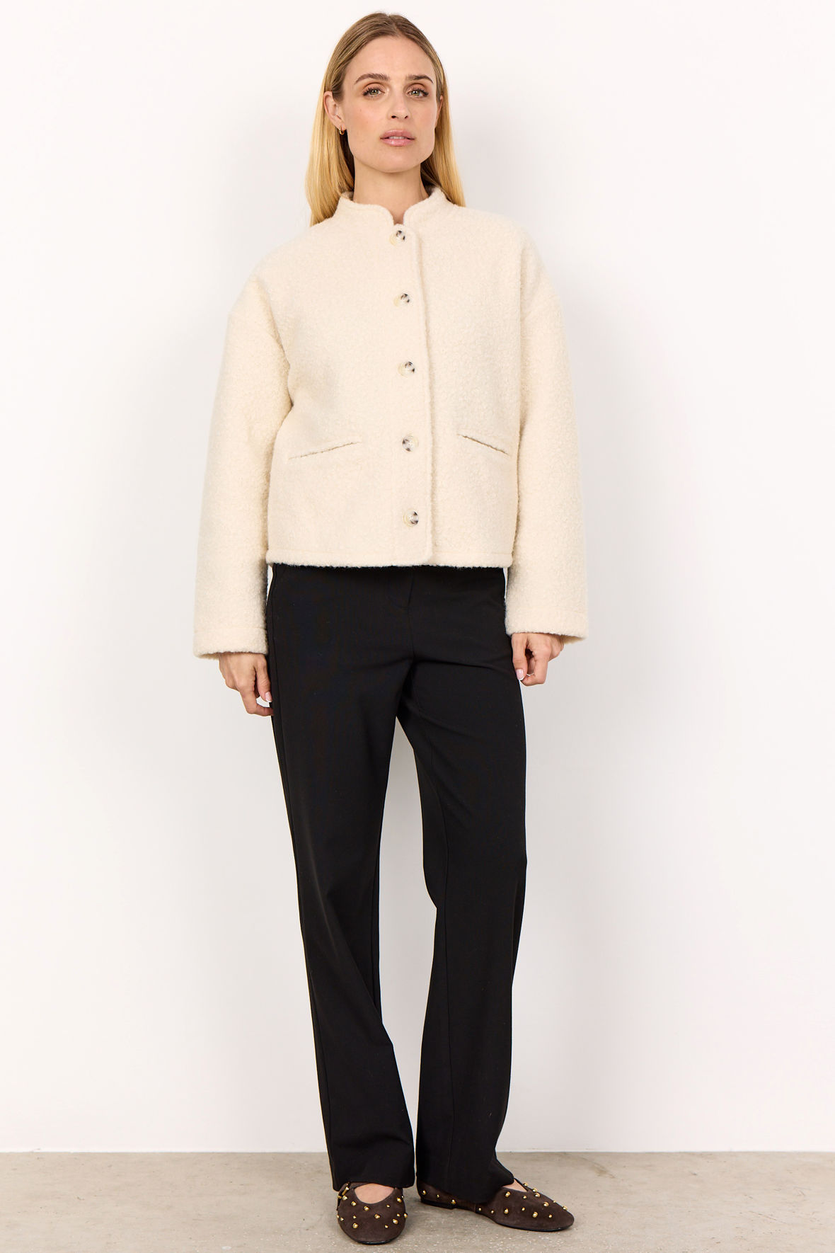 Kort overgangsjakke uden nogen foring men dejlig lun stadigvæk fordi den er lavet i genanvedt polyester. Sc-Shaima er lavet så den liger en boucle uld men til en meget overkommelig pris, og så høster du fordelen af at den hverken er sart eller besværlig, den gå nemlig i vaskemaskinen. Den er vildt klassisk i udtryk, elegant og fin og det korte snit giver dig en flot symmetri. Den har flot mandarin krave og herunder knapstolpe med tone i tone knapper. Med to praktiske slidslommer. Skuldersømmen er trukket ned på overarmen. Langs rygsøjlen har den samlesøm. Jakken er skabt til overgangen, er helt fantastisk til ture i byen, køre bil og finere brug. Vanen tro for SoyaConcept er prisen helt i bund, her kommer du virkelig langt og mærker ikke til nogle kompromisser.