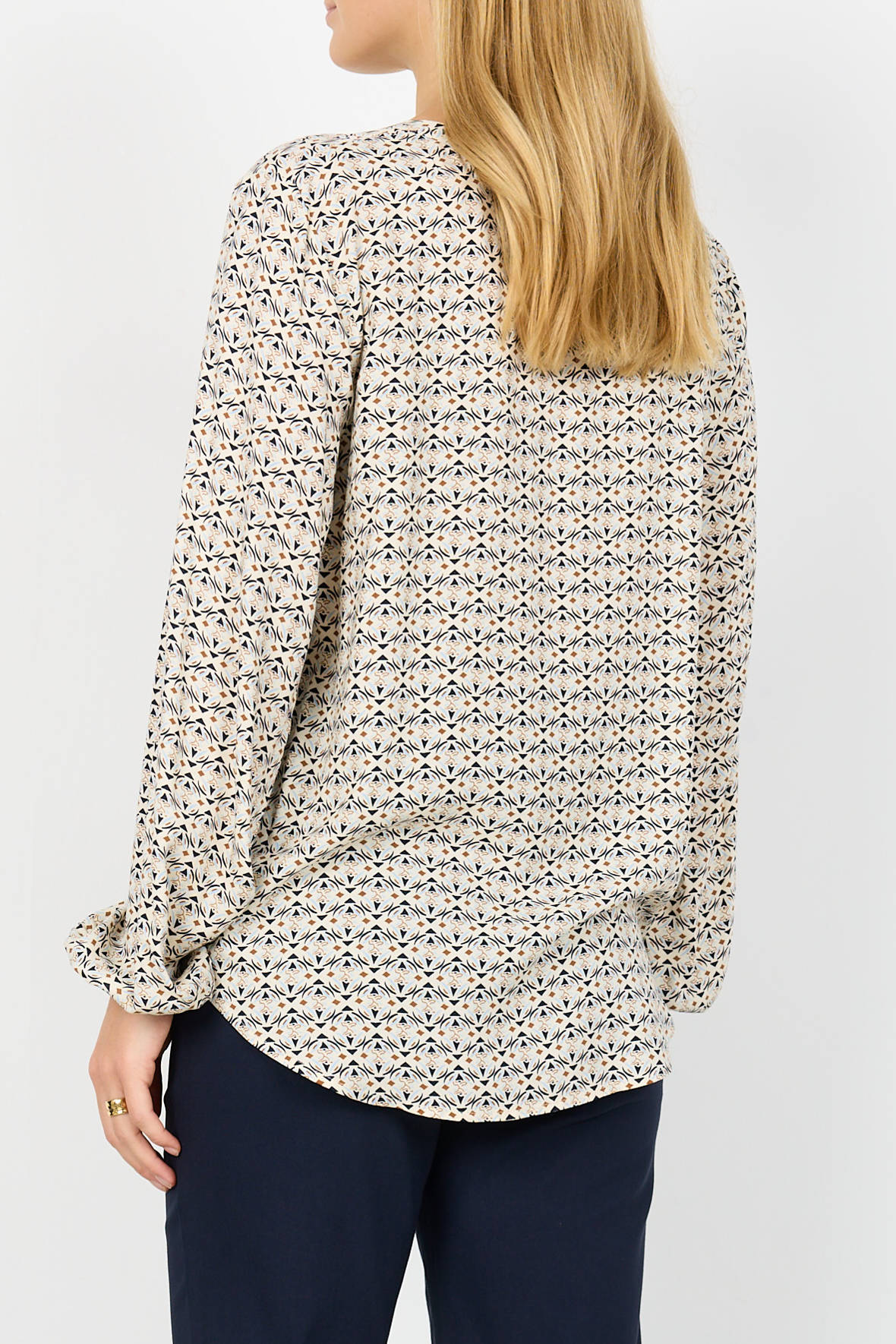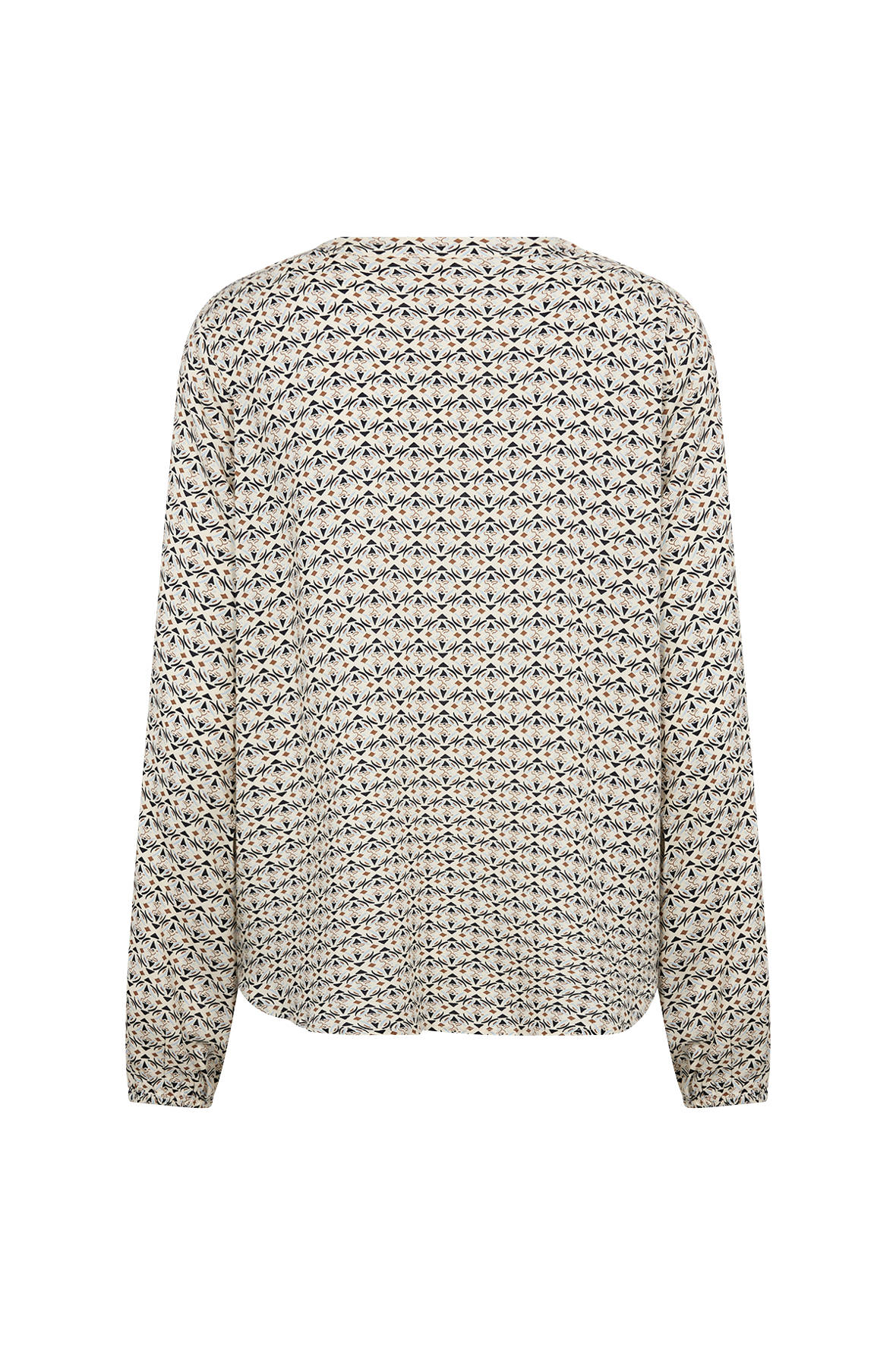 Sc-Bellua 1 er en kvalitet vi ikke har set før fra SoyaConcept, den er i en meget let EcoVero viskose og har all over print. Fast kvalitet uden stræk. Rund hals med åben V-hals og kort knapstolpe. God volumen på de lange ærmer som afsluttes ved håndled med smal elastik. Den har et løst snit som runder i siden. Størrelsessvarende.