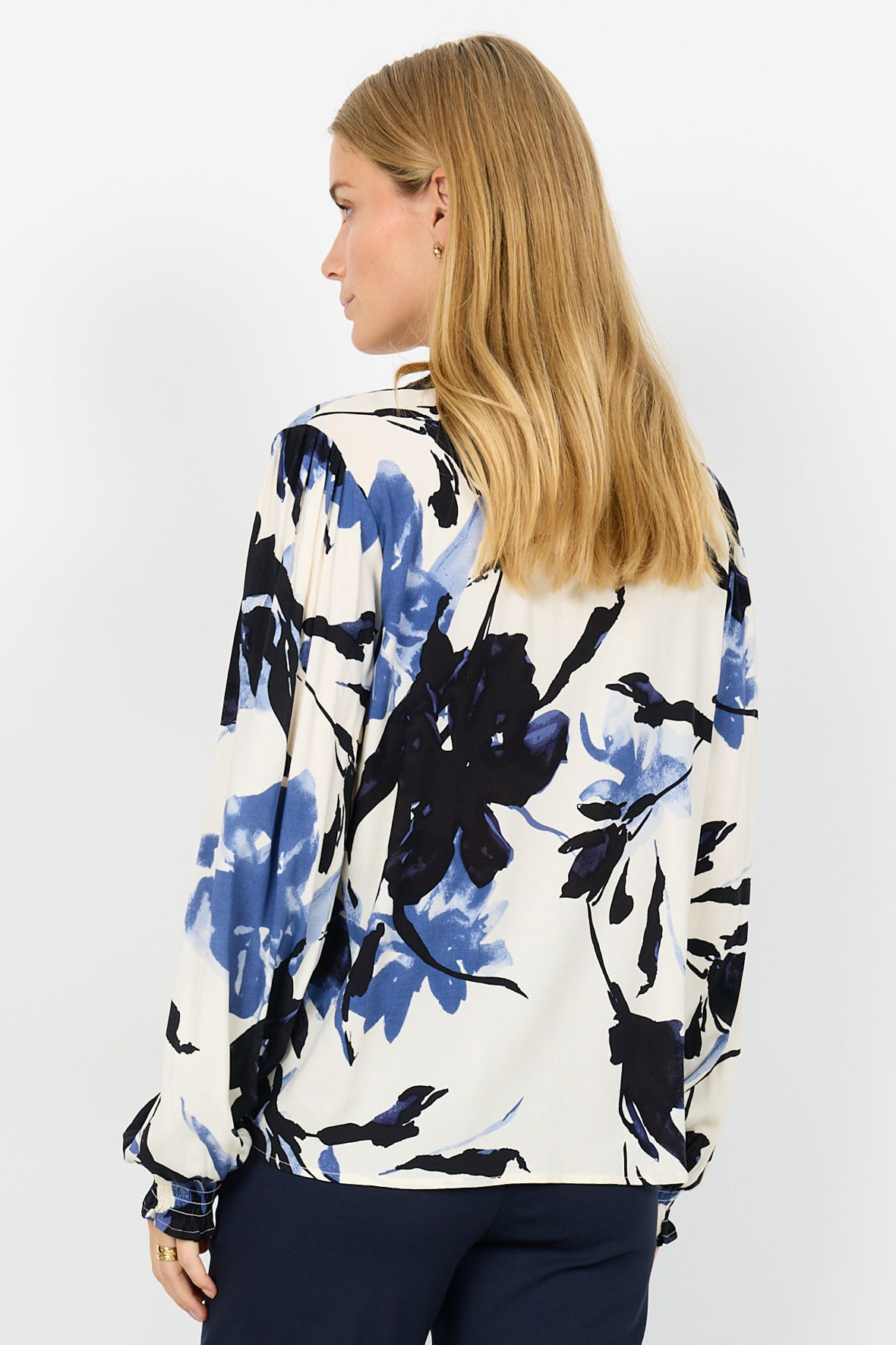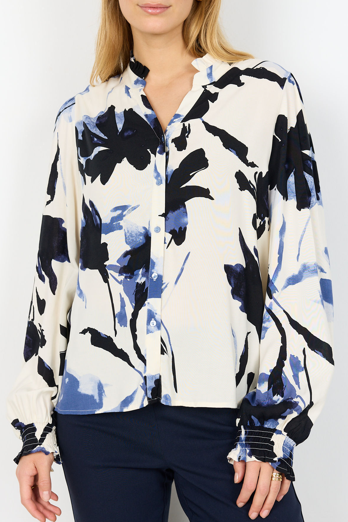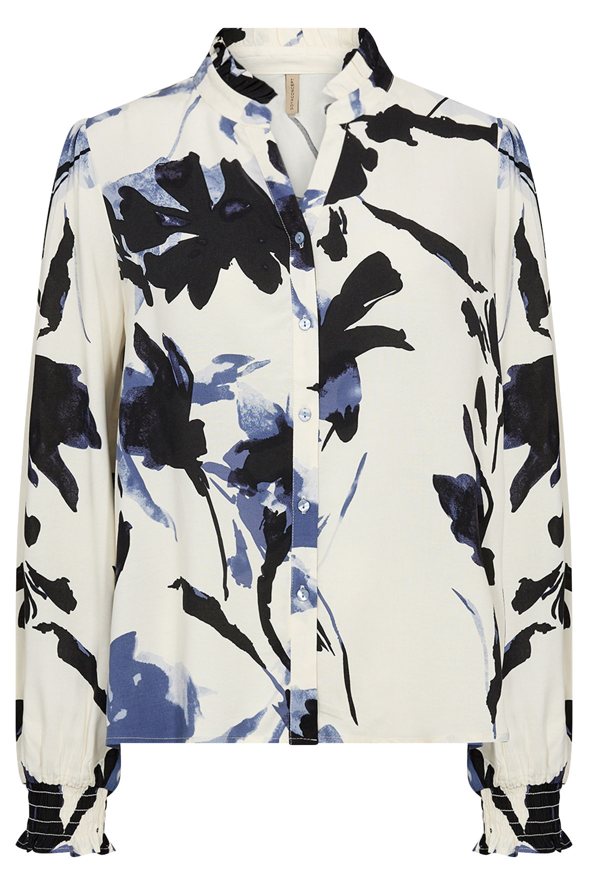 Sc-Bene er den lette viskose print skjorte fra Soya lavet i fastvævet EcoVero. Den har lige fået en sød flæsekrave med V-slids herunder og så knapstolpen der går igennem. Skulder har lidt krøl hvor ærmet starter, og ved håndled har den smock manchet. Ryggen er helt glat. Flot blomster print pryder den og giver den det feminine touch. En rigtig hverdags skjorte der er så nem at parre med underdel.