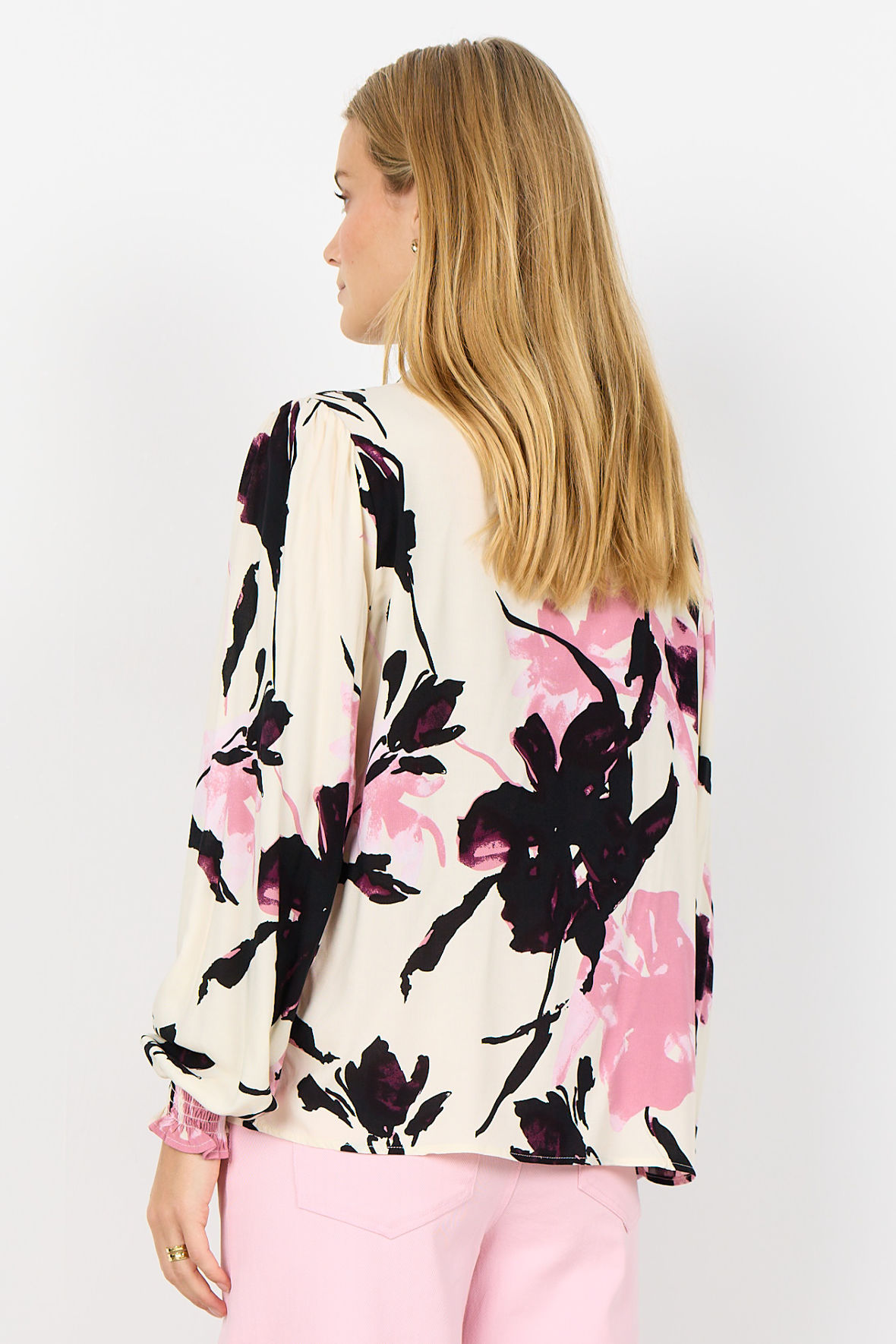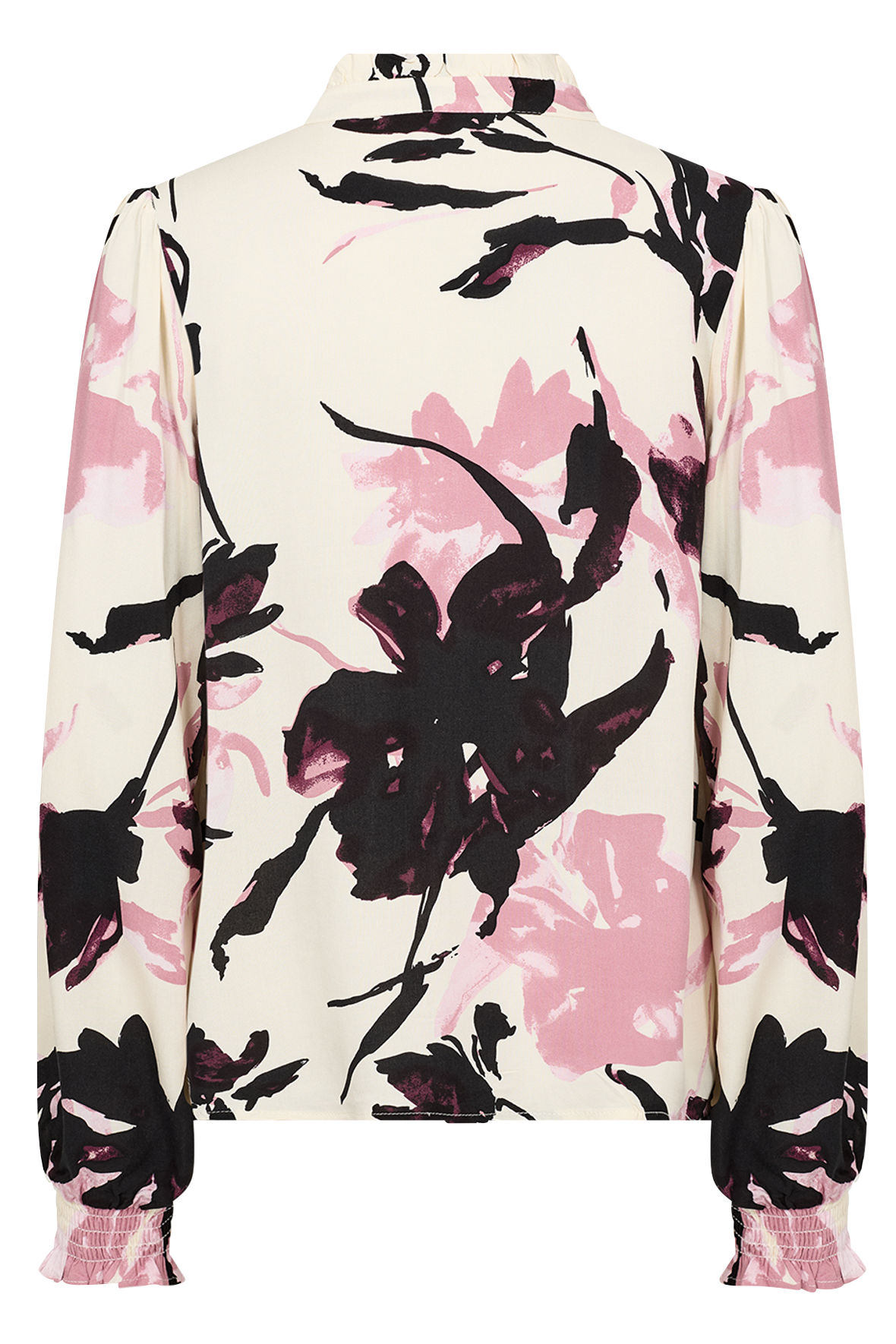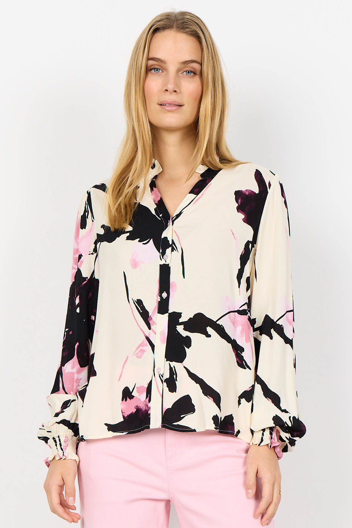 Sc-Bene er den lette viskose print skjorte fra Soya lavet i fastvævet EcoVero. Den har lige fået en sød flæsekrave med V-slids herunder og så knapstolpen der går igennem. Skulder har lidt krøl hvor ærmet starter, og ved håndled har den smock manchet. Ryggen er helt glat. Flot blomster print pryder den og giver den det feminine touch. En rigtig hverdags skjorte der er så nem at parre med underdel.