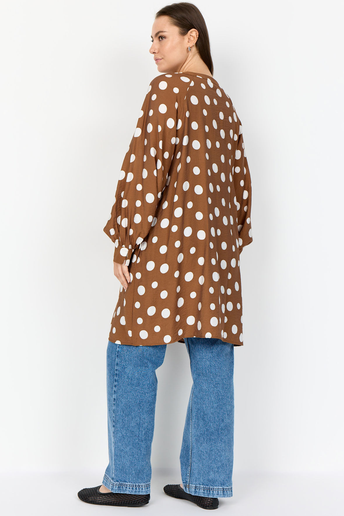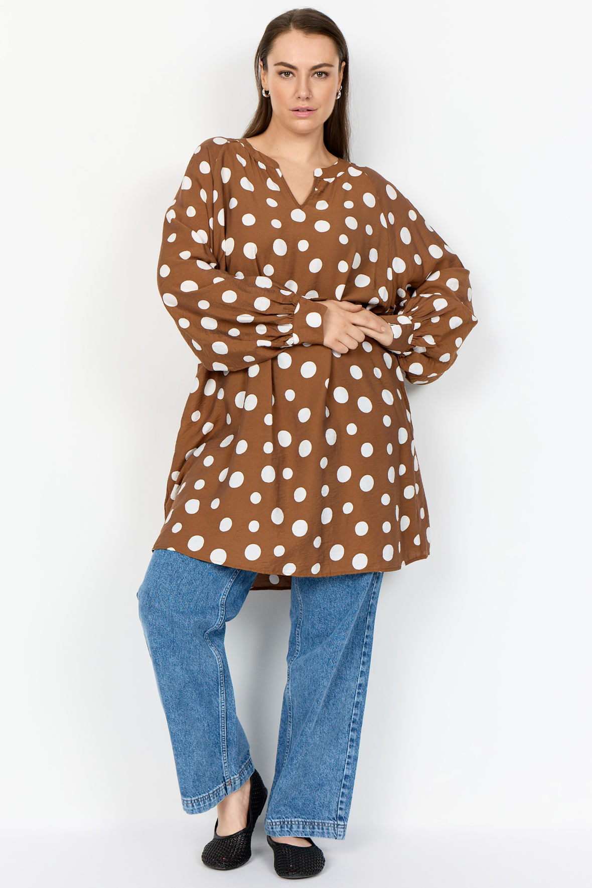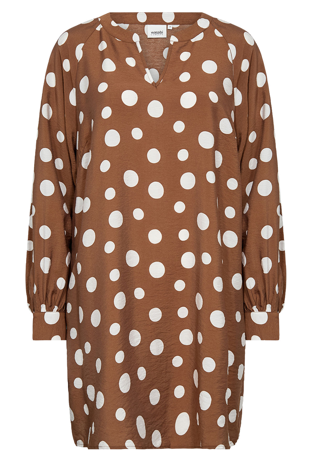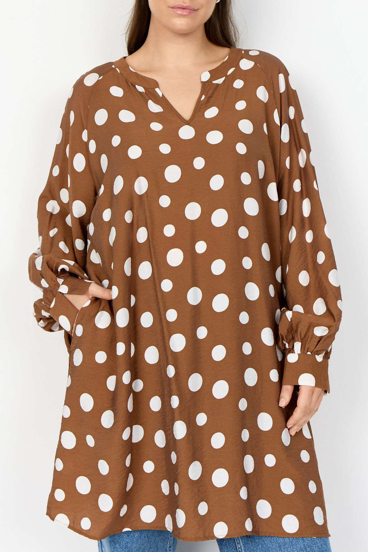 Straks lidt mere elegant, sådan går det oftest med polka prikker ;-) Den er lavet i EcoVero viskose som er åndbar. Tunika kjole der er loose fitted og lavet til plus size kvinder. Den har rund halsudskæring med åben V-slids. Der er indsnit ved barm så det løse snit stadig giver en flot pasform. Voluminøse raglan ærmer med bred manchet og slids ved håndled. Helt glat over ryggen og slutter med ret snit nederst. Wa-Celia findes i samme farvekombination som bluse.