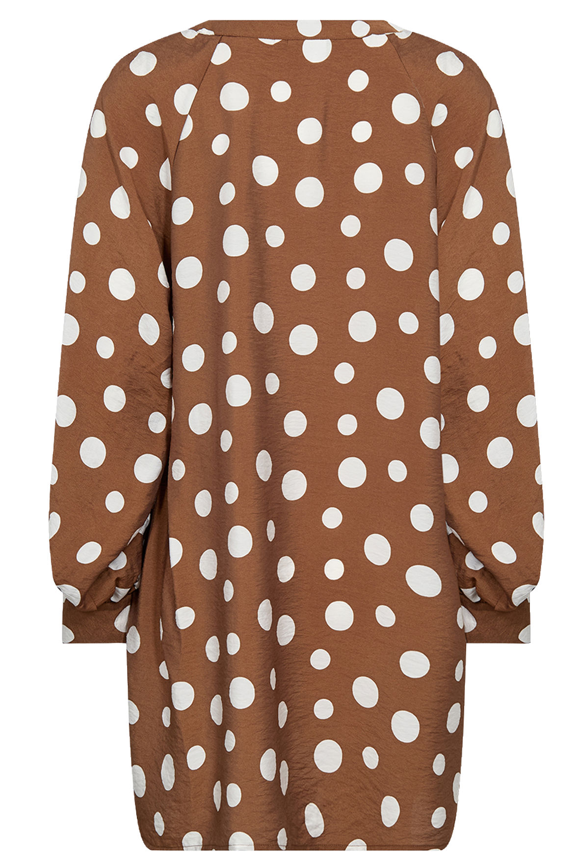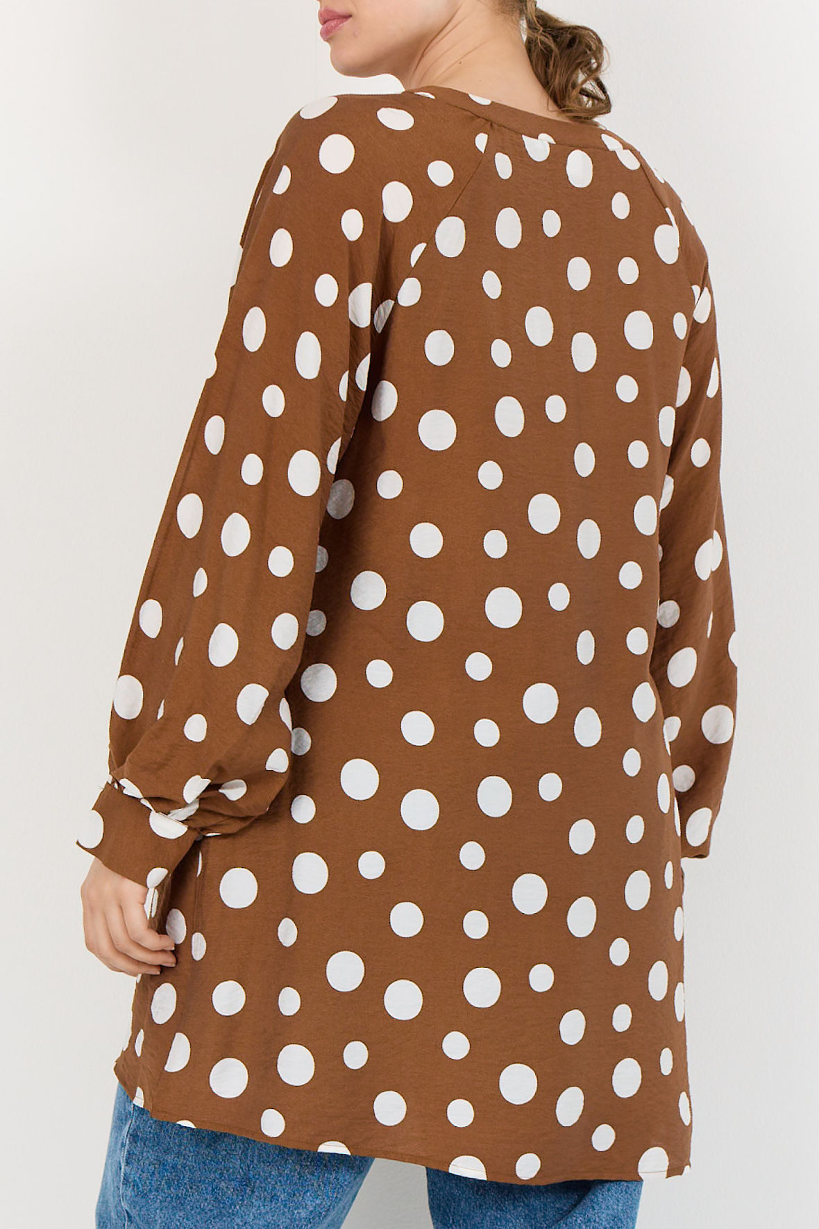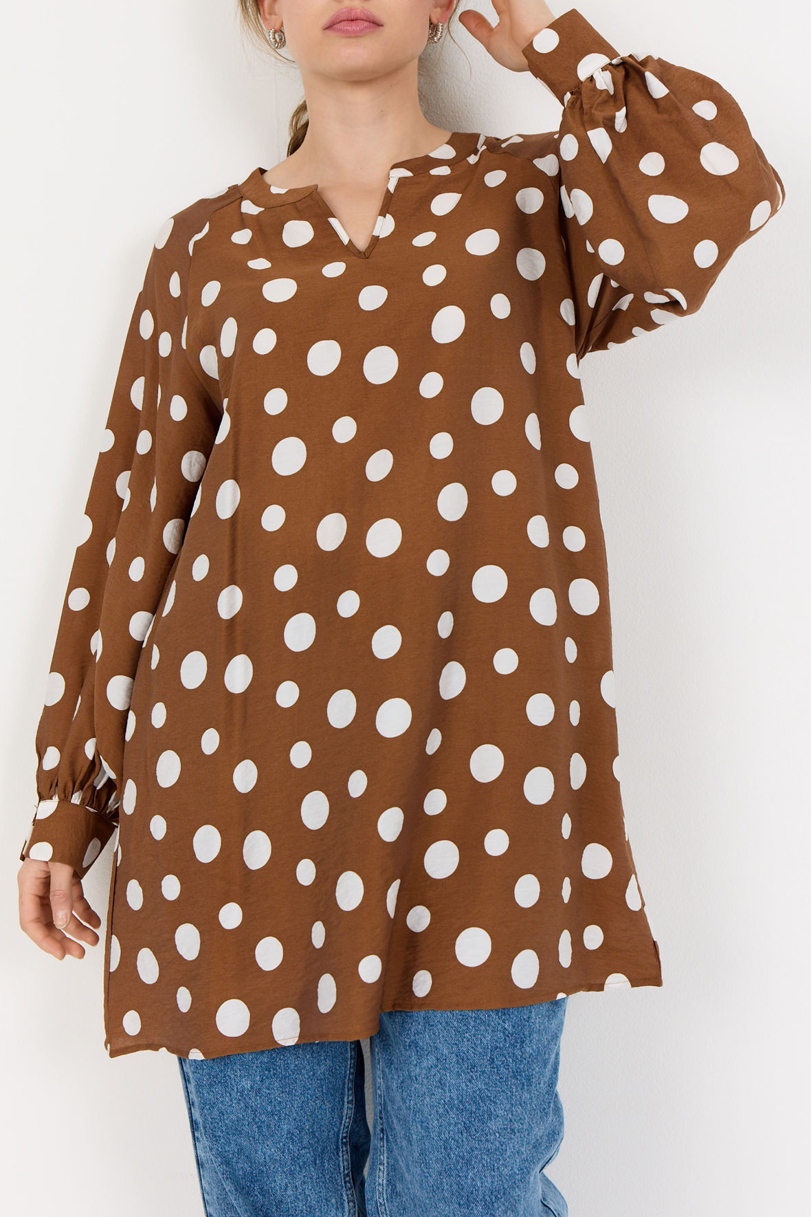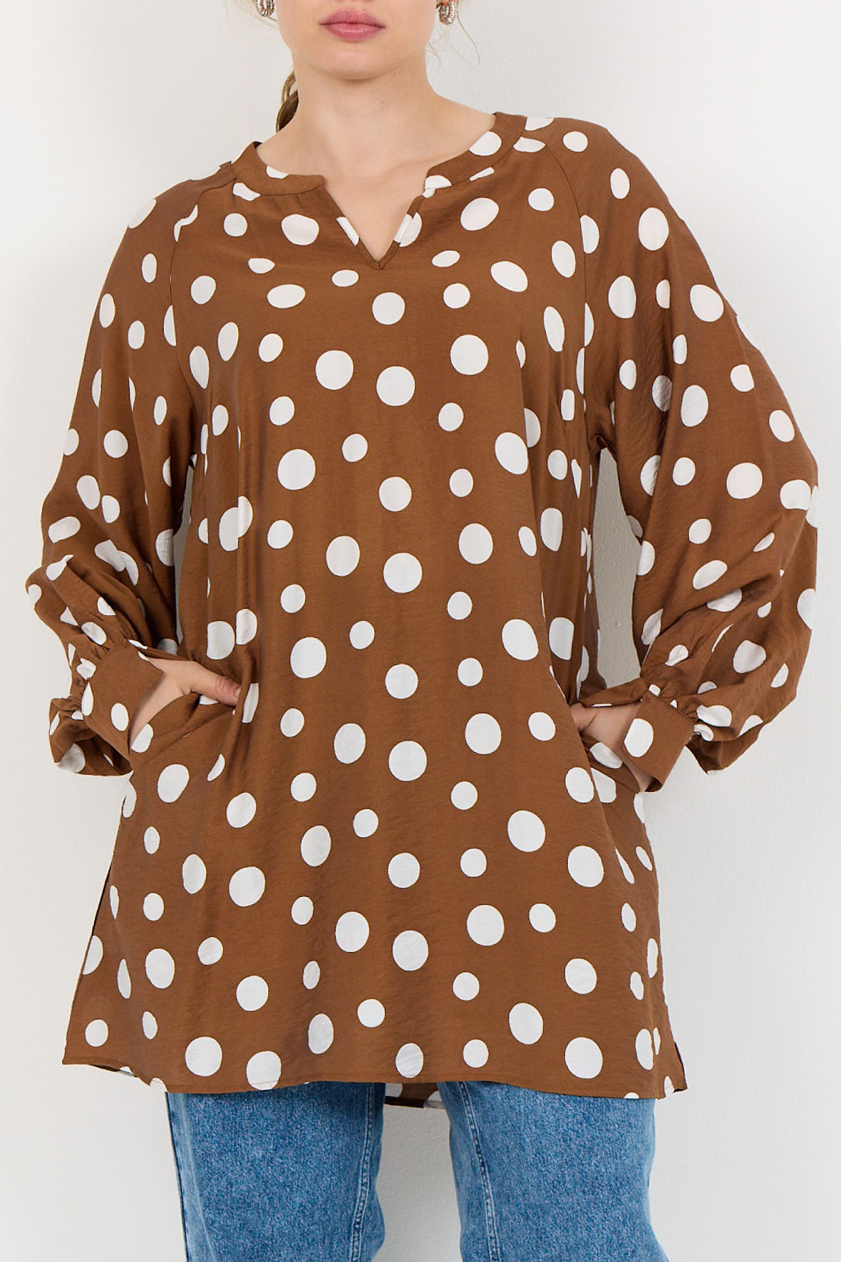 Straks lidt mere elegant, sådan går det oftest med polka prikker ;-) Den er lavet i EcoVero viskose som er åndbar. Tunika kjole der er loose fitted og lavet til plus size kvinder. Den har rund halsudskæring med åben V-slids. Der er indsnit ved barm så det løse snit stadig giver en flot pasform. Voluminøse raglan ærmer med bred manchet og slids ved håndled. Helt glat over ryggen og slutter med ret snit nederst. Wa-Celia findes i samme farvekombination som bluse.