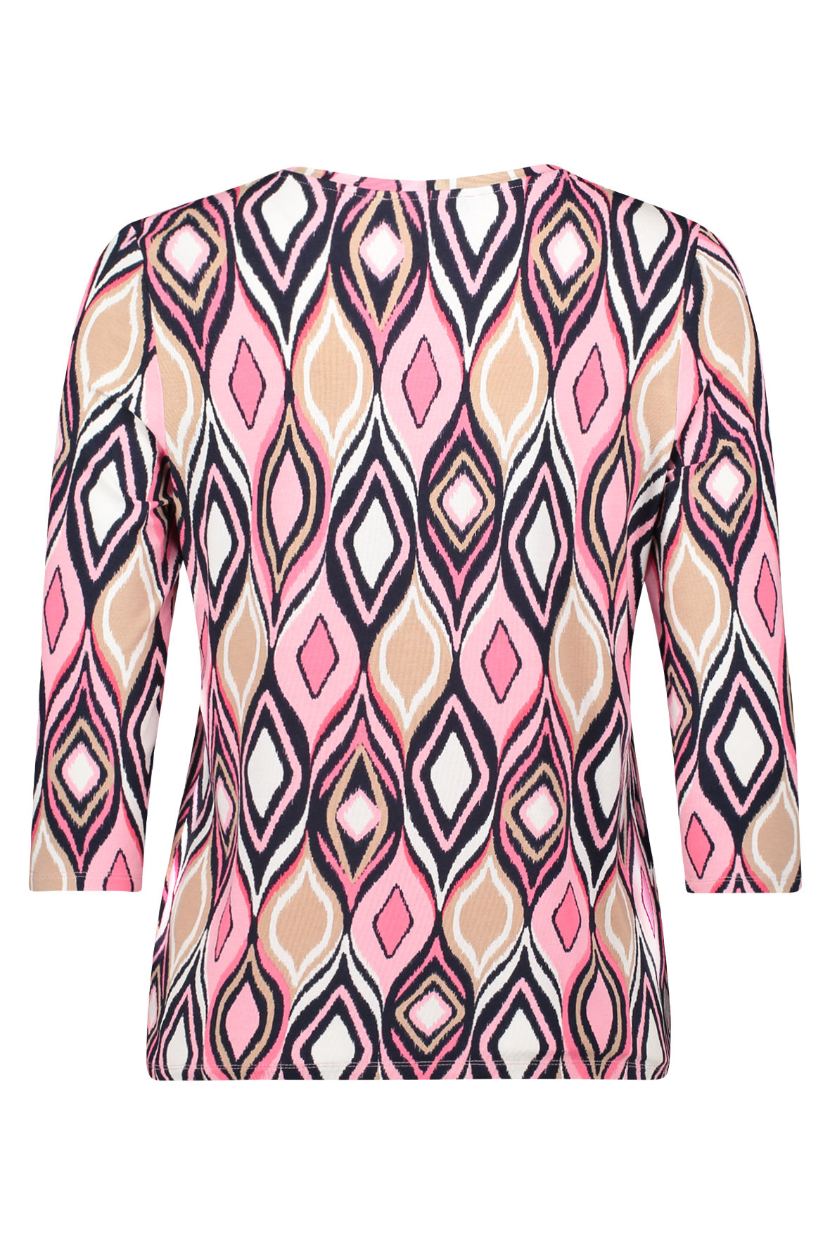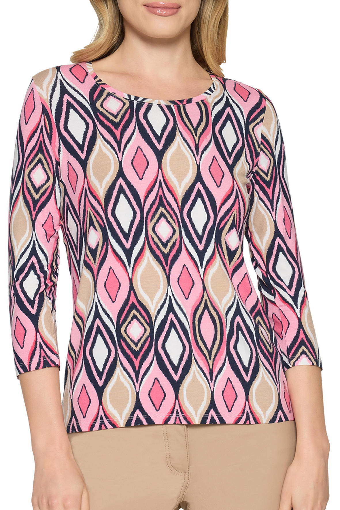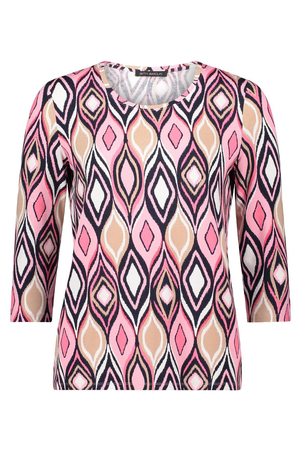 Jersey viskosen du ikke vil ud af, den er holder sig så flot, ændrer ikke farve eller facon og krøller heller ikke. Sådan er det bare når det er Betty Barclay. Brug t-shirten i hverdagen og se godt ud imens. Den er med flot farverigt print, har rund halsudskæring med flot syet kant og 3/4 ærmer. Den er taljeret og ganske let så den er nem at føle sig hjemme i.