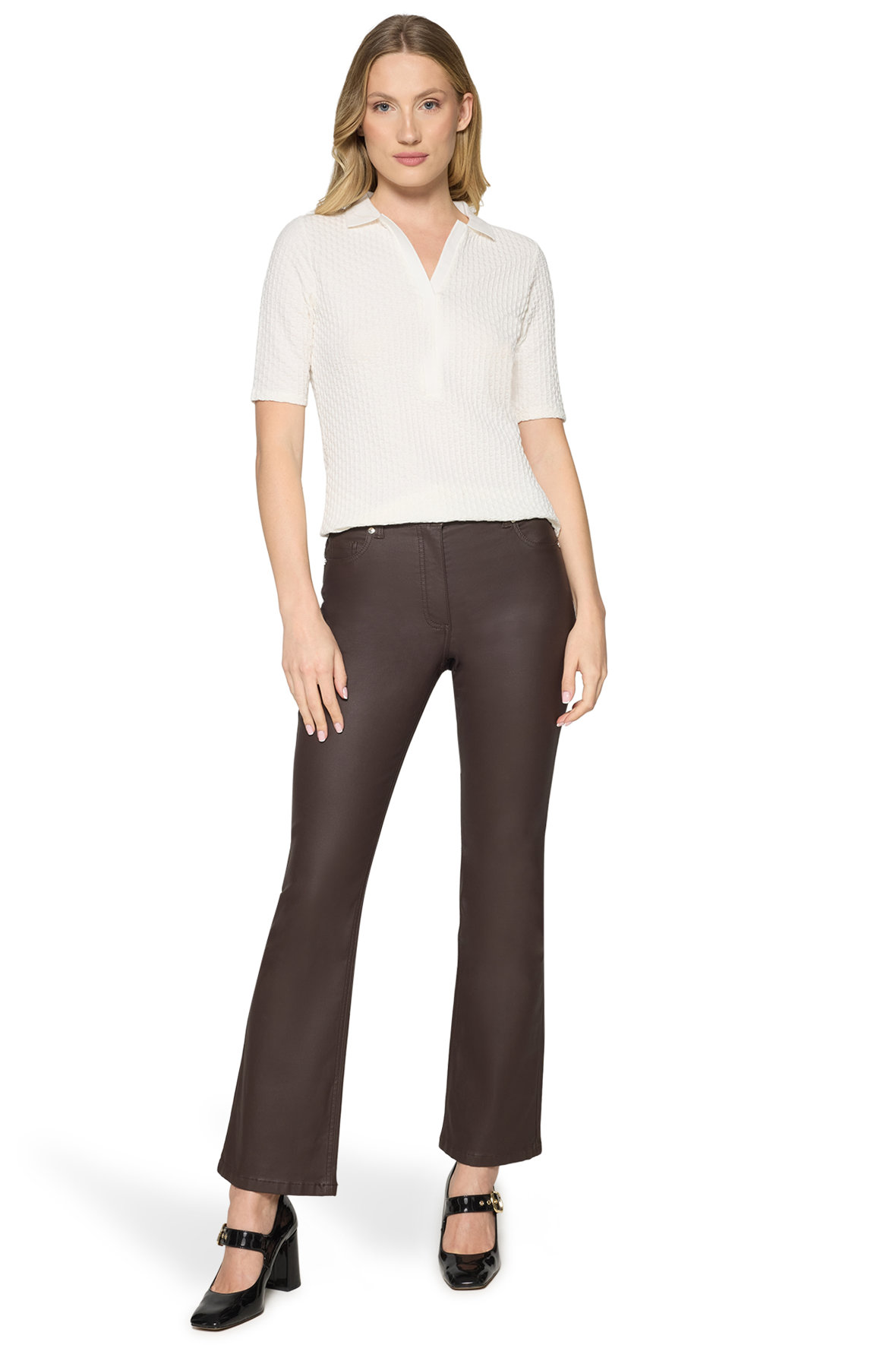 En virkelig skøn struktureret polo der næsten er et lille kunstværk og absolut ikke er lavet som en strikket. Den er taljeret og har korte ærmer. Med polo krave og ribstrikket stolpe uden knapper, den har lille V-slids. Ærmer er lavet korte. En polo der på alle måder stå ud fra mængden og som ikke har en sæson.