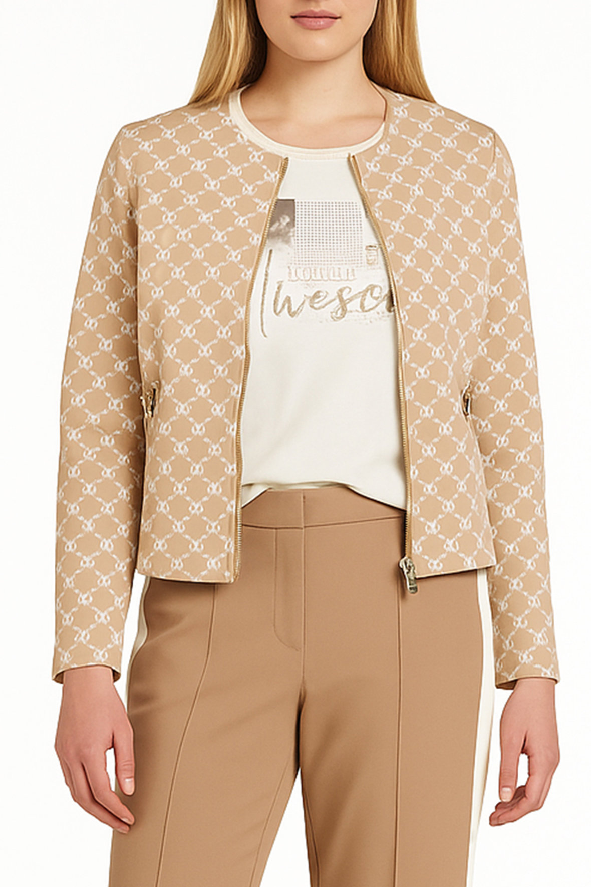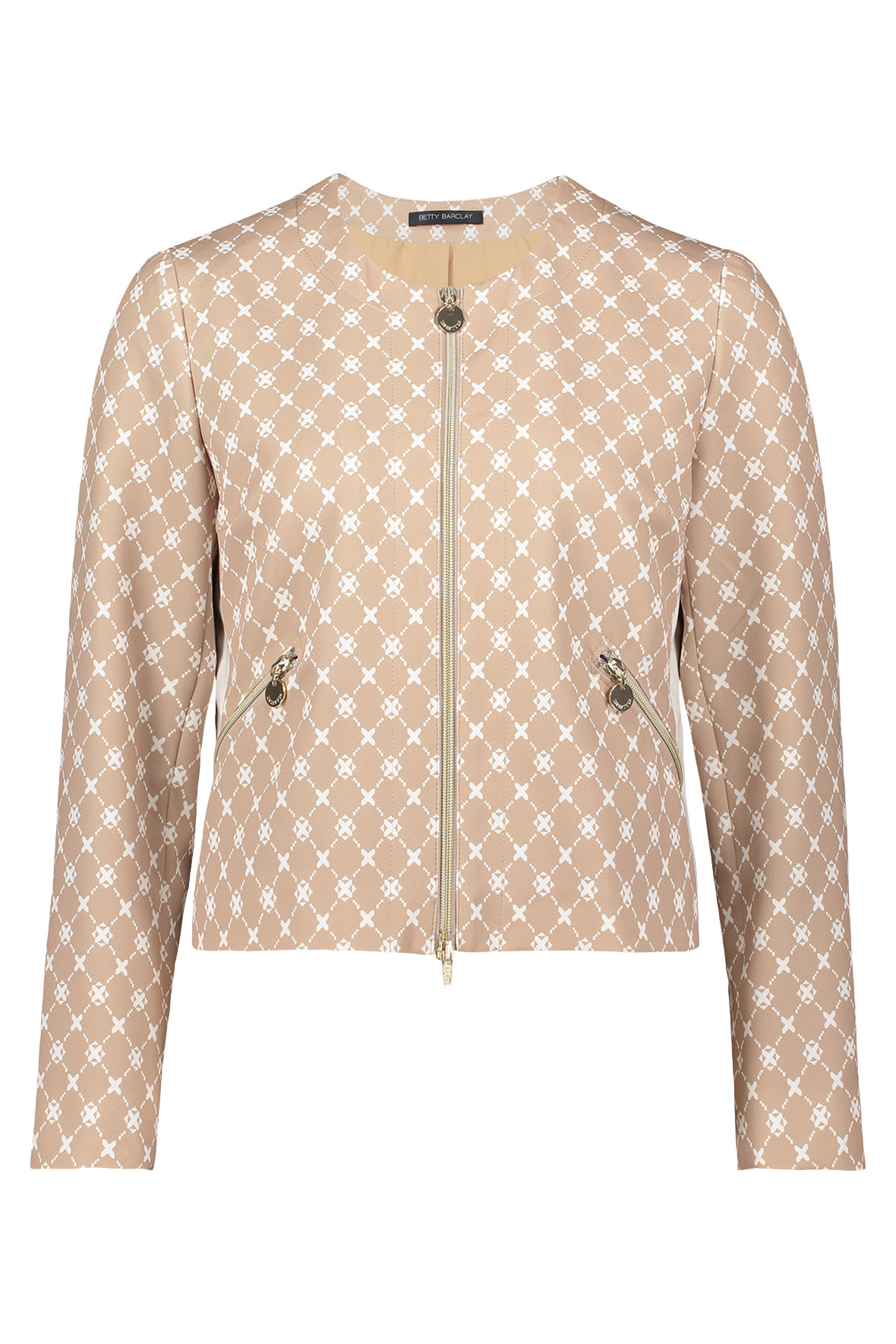 Virkelig sød kort jakke med foring der er lavet til dit smarte outfit. Den er simpelthen genial som supplement og kan nemt får en kedelig t-shirt til at se strålende ud. Brug den som blazer jakke og også gerne til hverdagens mange forskellige udtryk. Flot print giver den klasse og sikke et sammenspil mellem farver og guld detaljer. Den er nemlig udstyret med tovejs lynlås samt har fine lommer med samme. I siden har den fået en hvis stribe der også gør den lidt friskt sporty at se på - lige lidt mere ung. Kvaliteten holder sig flot, den krøller ikke og forandrer sig ikke. Indsnit ved barm giver dig en flot fitting så du allerede her oplever medgang.