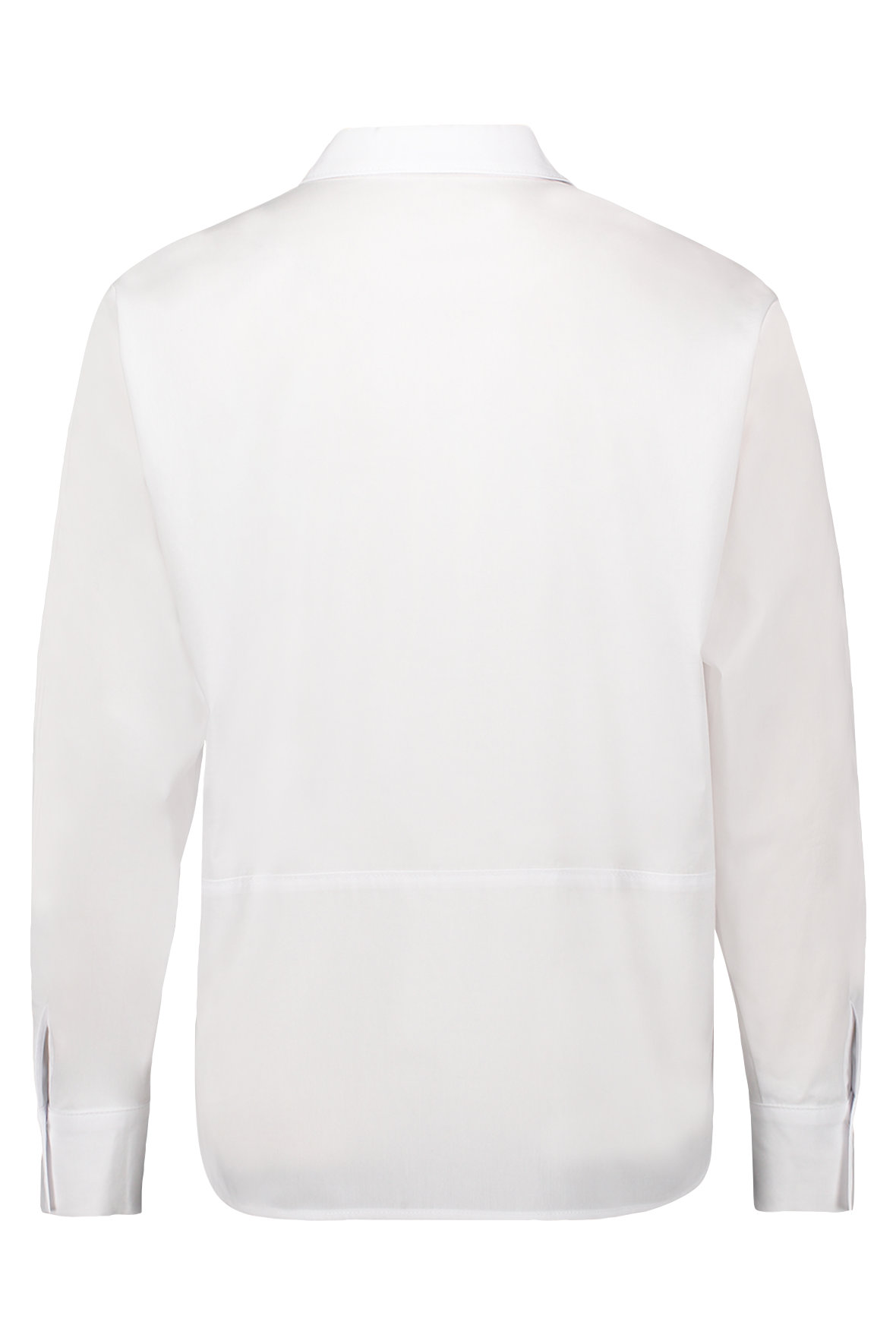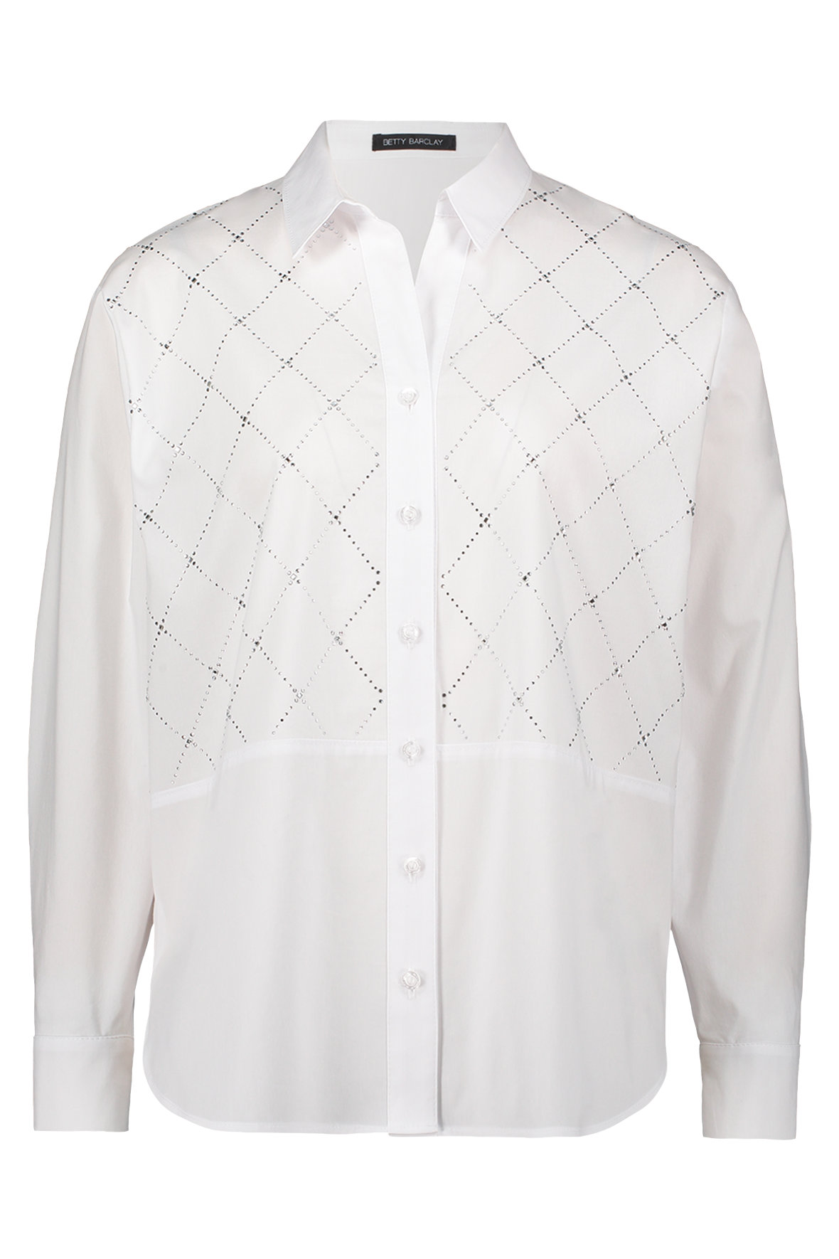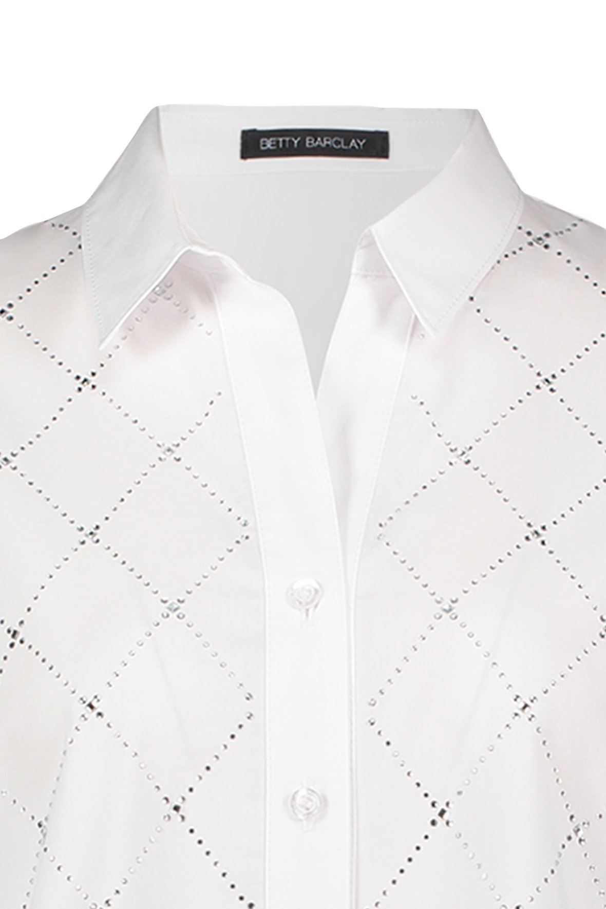 Skjorte med masser af statement i udtryk, den er nemlig pyntet med sølvfarvet similisten der er moteret ved håndkraft i flot ternet mønster som på jeans. Den har super fin og lille club krave hvor snipper har lille cut away. Knapstolpen er synlig med åben slids hvor den sidste knap skulle være før kraven. Den har overskæring uden similisten nederst. Med masser af stræk og plads i pasformen. Med lange ærmer med knapmanchet. Super stilfuld med Betty Barclay.