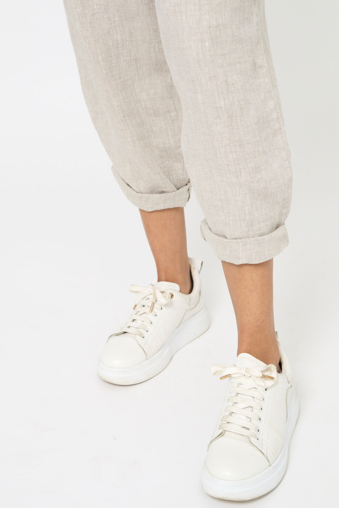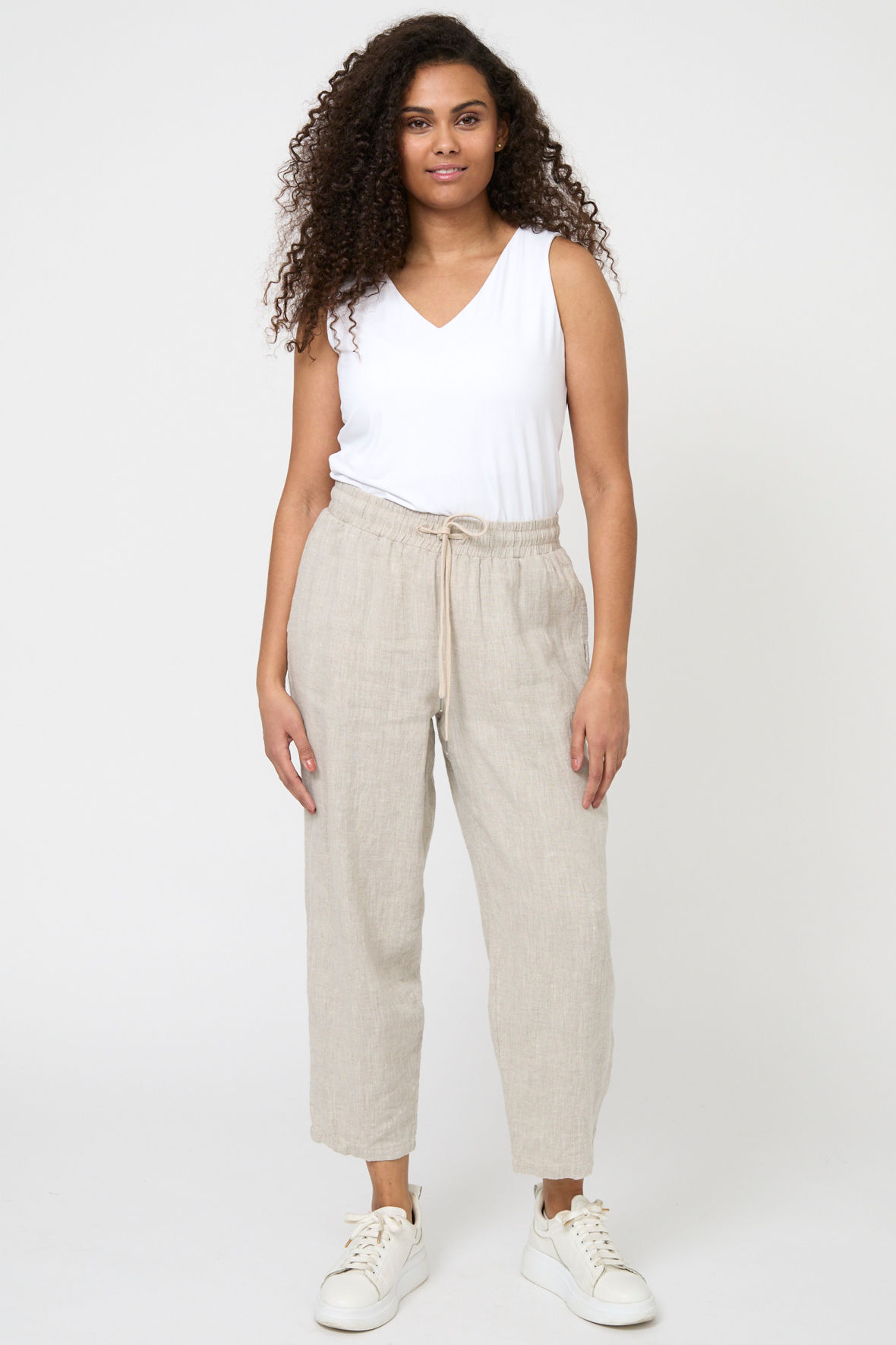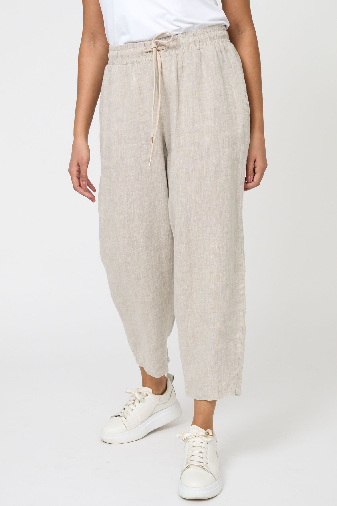 Sol og sommer er hør, ALTID hør. Intet slår hør i evne til at holde dig ventileret og tør. "MEN hør krøller" ja for søren det skal det helst ellers er det en elendig blandingskvalitet. Her er der krølle garanti fra Elton, for ETLuzie er lavet i en ren hør. Du får bedste hørkvalitet, den krymper lidt, den krøller Men hold da op intet slår den sommeren igennem. Den holder dig varm på kølige dage og er meget "stoflig" har meget tekstur der skabes af vævningen. Og, når solen brænder holder den dig ventileret, tør og kølig samt frisk. Kæmpe bonus er at den har en god UV faktor beskyttelse. De er så casual som de skal være, med bred elastik i livet med snører, har franske forlommer og har fået sådan et trendy ballon inspireret snit - der giver lidt mere rummelighed. Længden er 7/8 og er med til at ventilere dine ben. Kuffert venlig kvalitet.