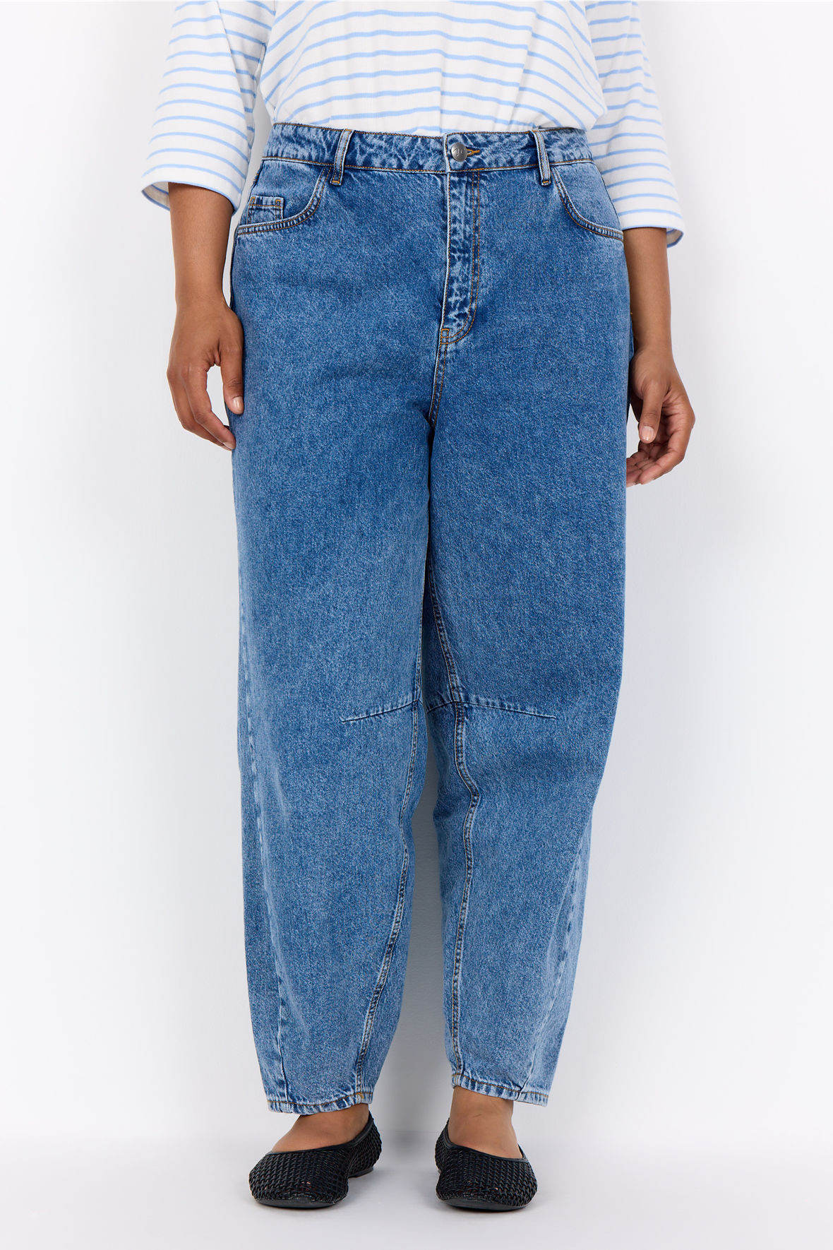 Wa-Caia er noget så sjældent som en "gammeldags" fastvævet denim kvalitet lavet som en stonewashed jeans. Den har fast linning med bæltestropper, knaplukke, gylp og lynlås samt har de klassiske 5 lommer. Så er det på plads, men vasken er super fed og giver et særligt look. Stikninger er med orange kontrastfarve. Den er med middelhøj talje samt har god plads til hofter og har tilsvarende plads ved lår og knæ, indsnit ved knæ giver en flot linje videre ned. WasabiConcept har plus size pigen for øje når stregerne tegnes på deres design.