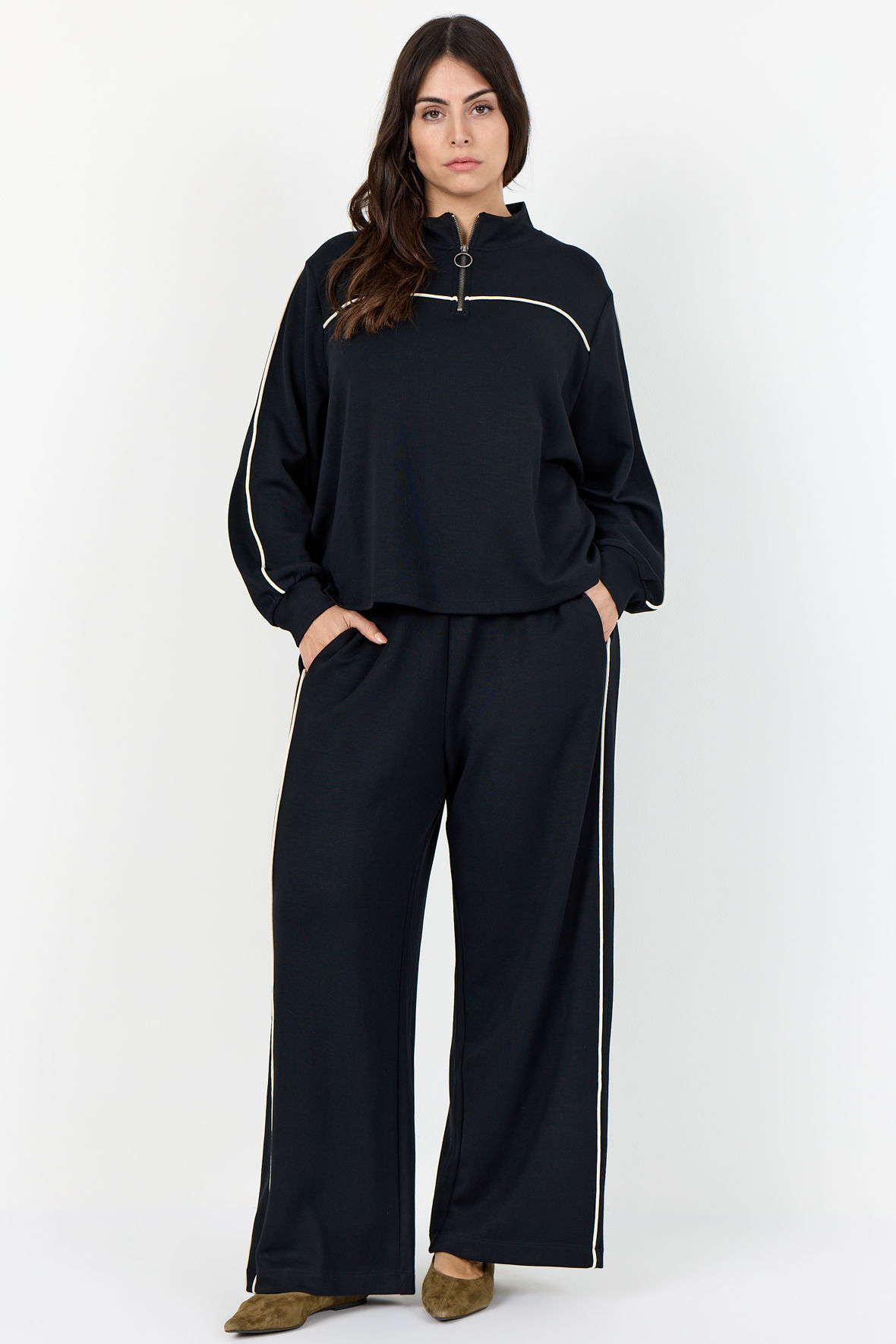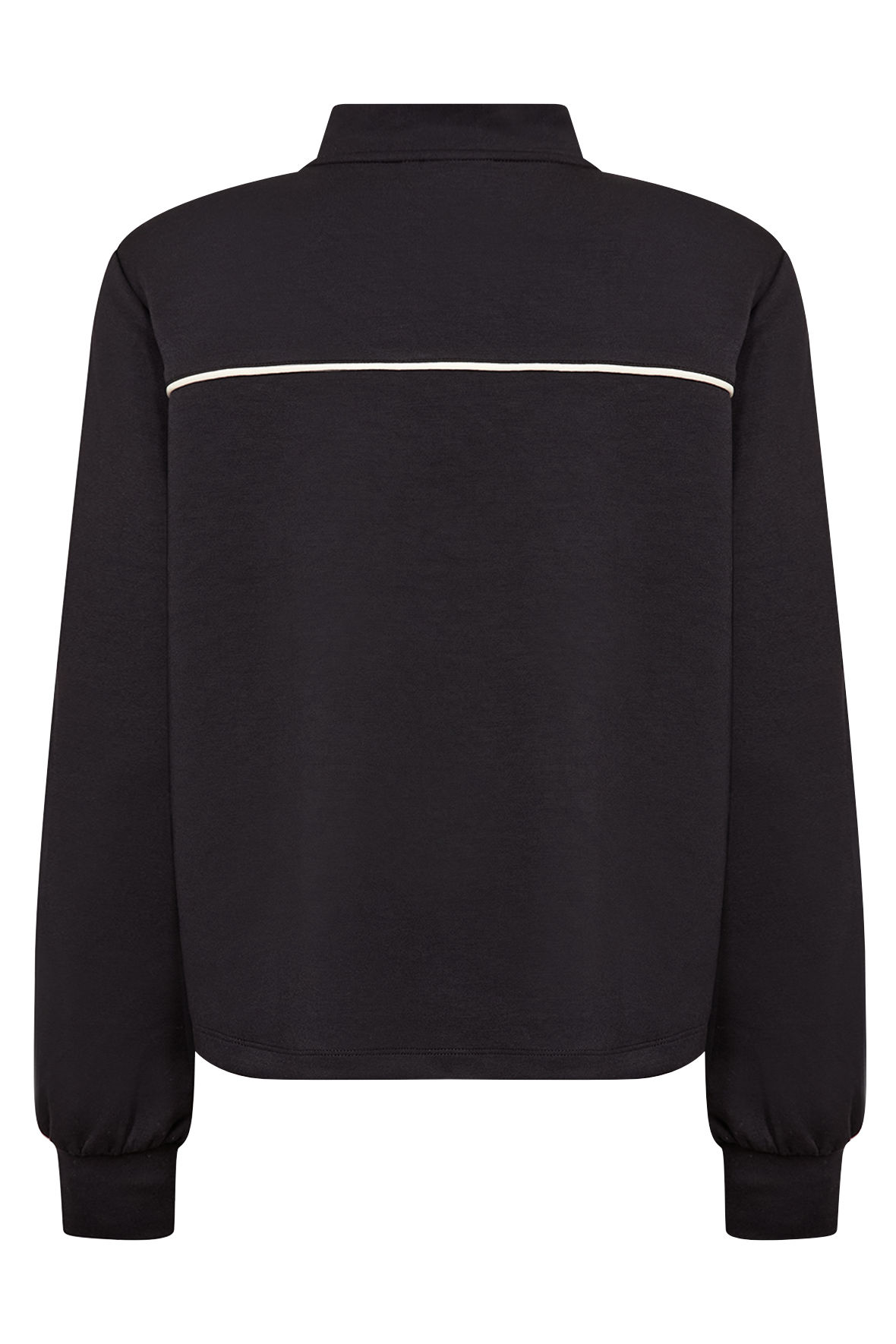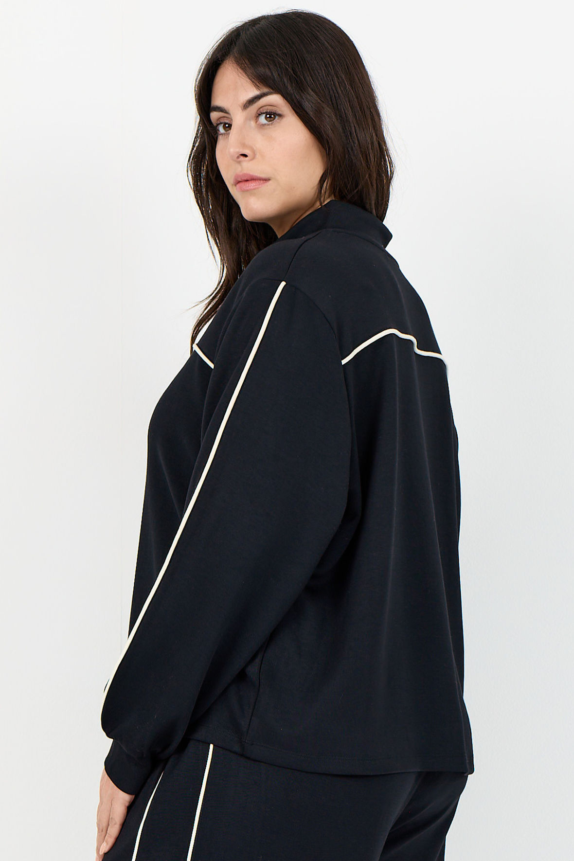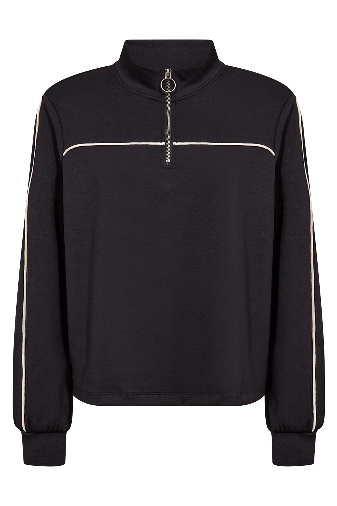 Tracksuit overdel med hvide pipings på ærmer samt for og bag. Den er med høj hals med kort lynlås stolpe Wa-Sabina slutter løst ved hofter og manchetter ved håndled. Der er god vidde i overkroppen. Match den op med bukser til for at samle udtrykket eller kombiner med hvad du føler for. En sweatshirt du kan bruge i mange sammenhænge. En kvalitet der holder sig og som er blød.