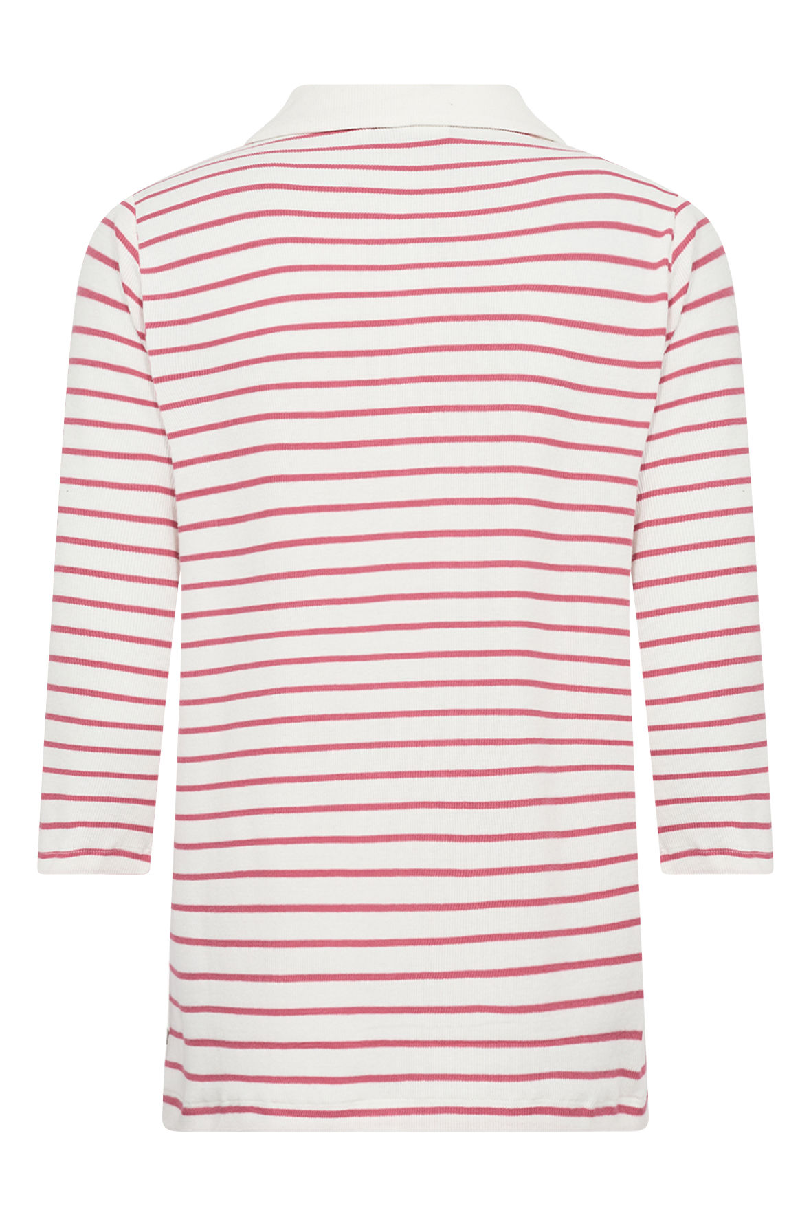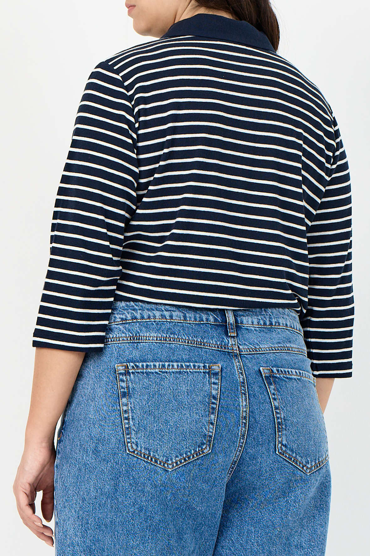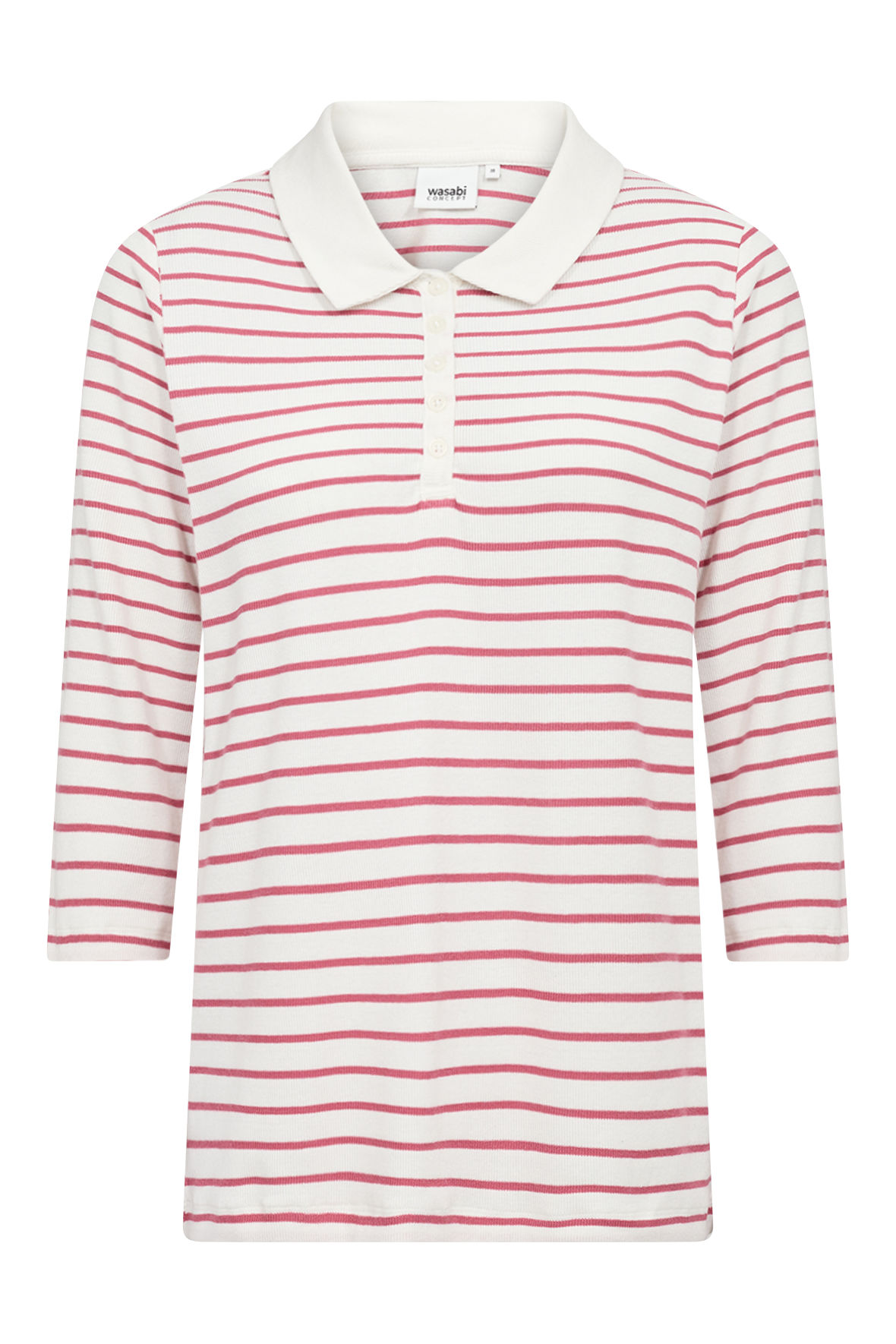 Wa-Sakar ribstrikket polo t-shrt med flotte smalle striber. Lavet i en åndbar bomuld og viskose blanding der ikke er alt for kraftig. Med polo krave samt kort knapstolpe med tætsiddende knapper og lidt atypisk for en polo har den 3/4 ærmer. Den har en god længde så du kan stikke den ned eller bære den udenpå. Og, fordi der ikke er taget billeder af den på model, har jeg lige lånt af den med navy.