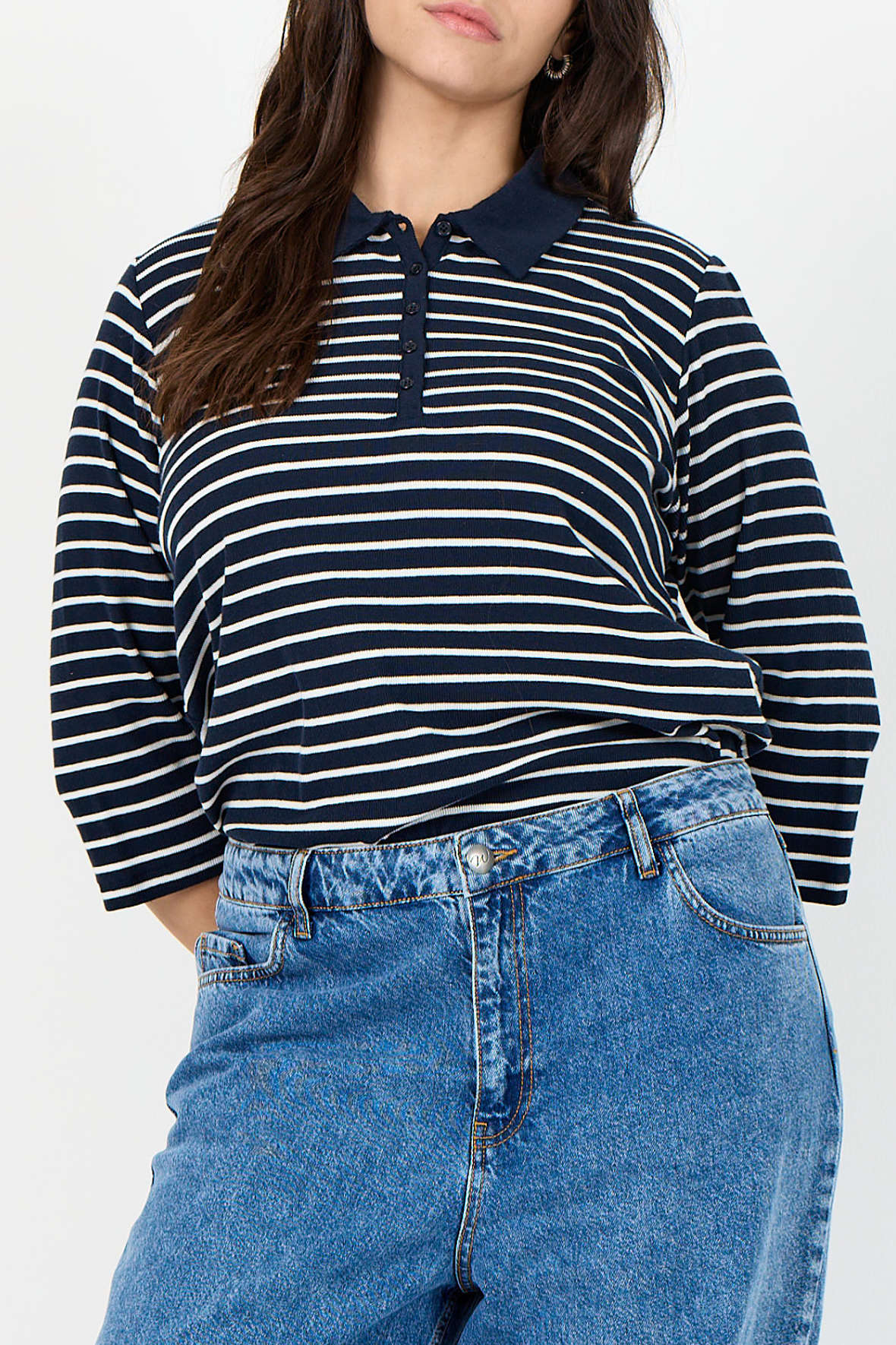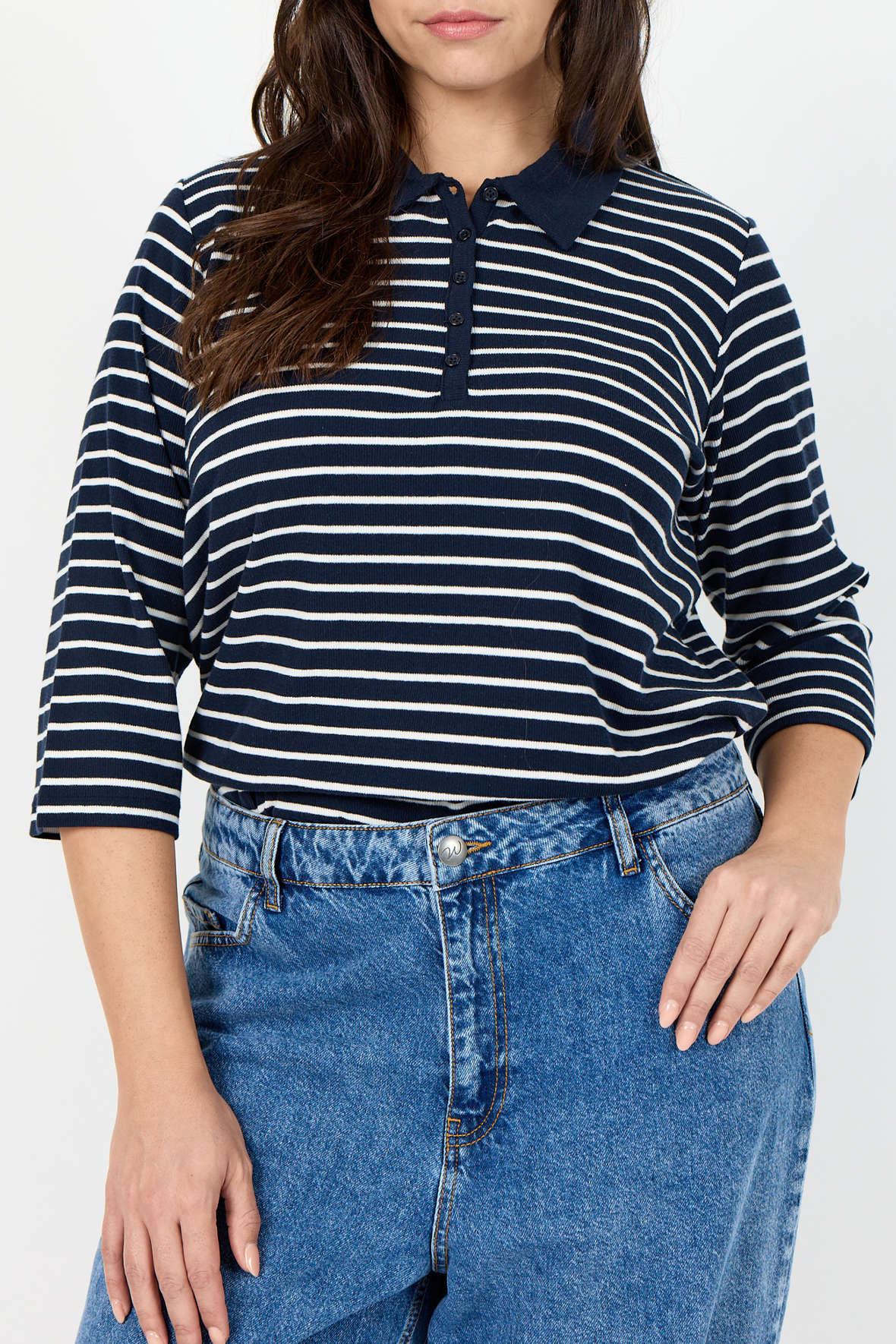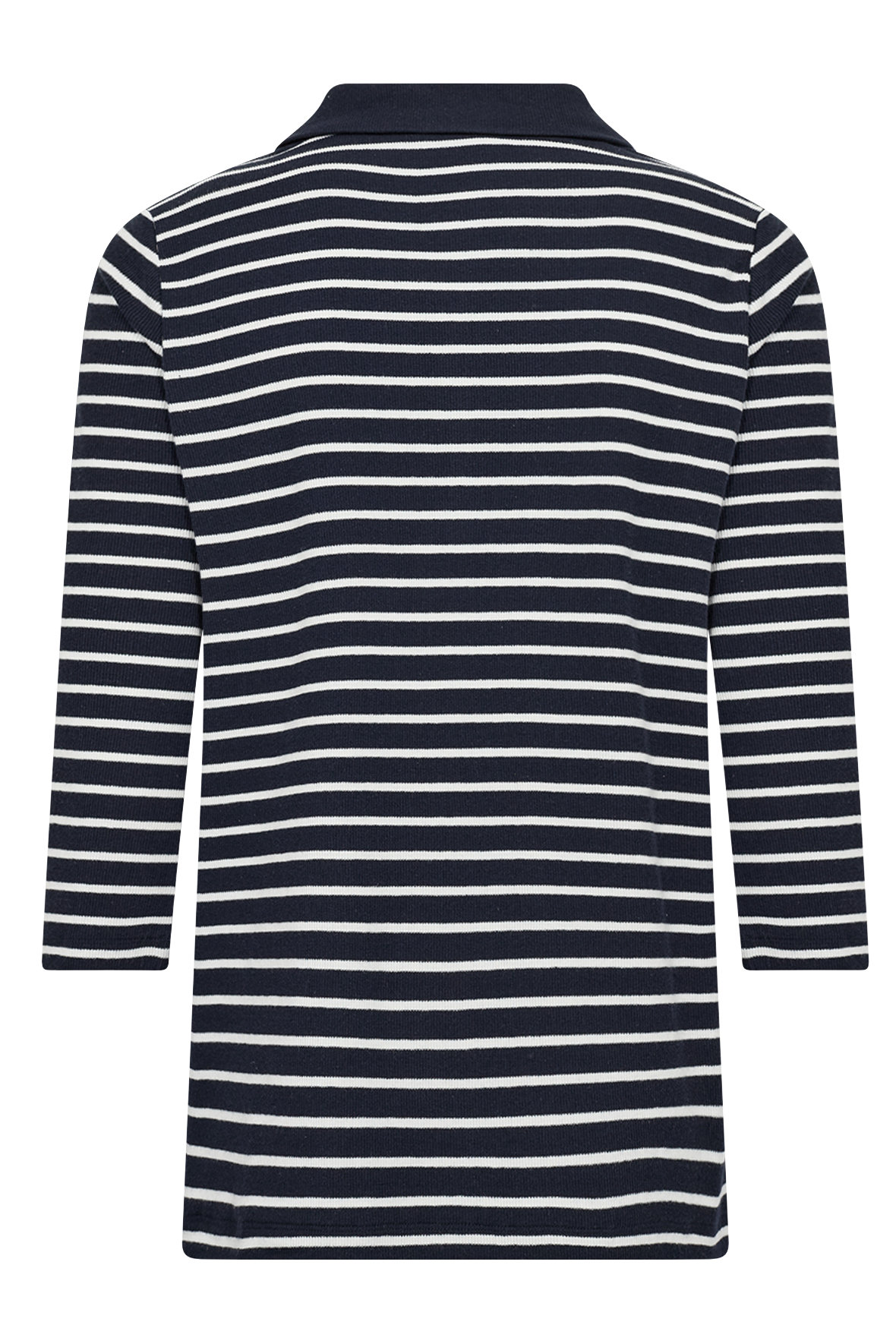 Wa-Sakar ribstrikket polo t-shrt med flotte smalle striber. Lavet i en åndbar bomuld og viskose blanding der ikke er alt for kraftig. Med polo krave samt kort knapstolpe med tætsiddende knapper og lidt atypisk for en polo har den 3/4 ærmer. Den har en god længde så du kan stikke den ned eller bære den udenpå.