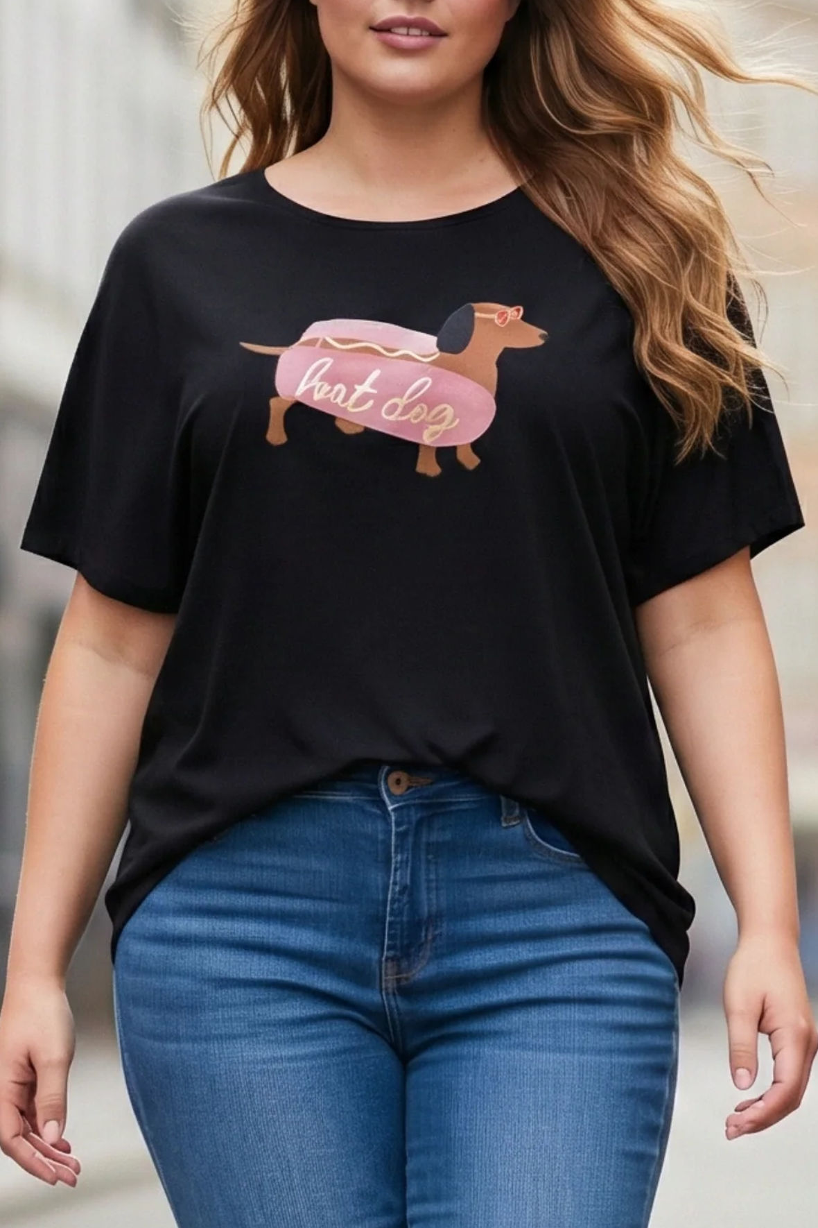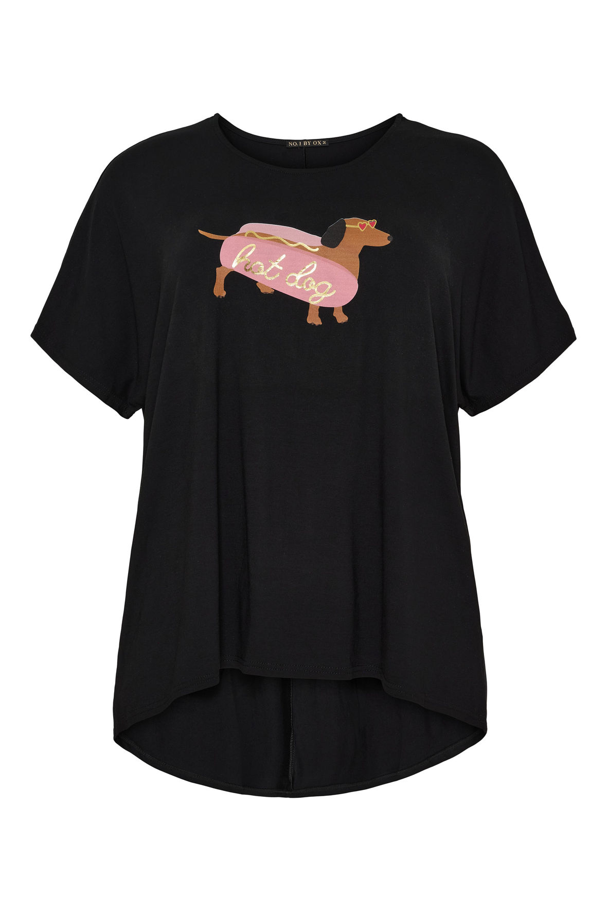 Basis t-shirten der kommer igen og igen med nye print, her er det en hotdog. T-shirten er med batwing facon der runder forneden og som er længere bagtil samt er med korte ærmer. Stadig samme bløde viskosekvalitet som er så rar, let og åndbar. Den er løs i pasformen men er ikke oversize. Casual style der kan gøre hverdagen lidt nemmere for sort passer til alt. Ryggen er med skillesøm ved rygsøjlen.